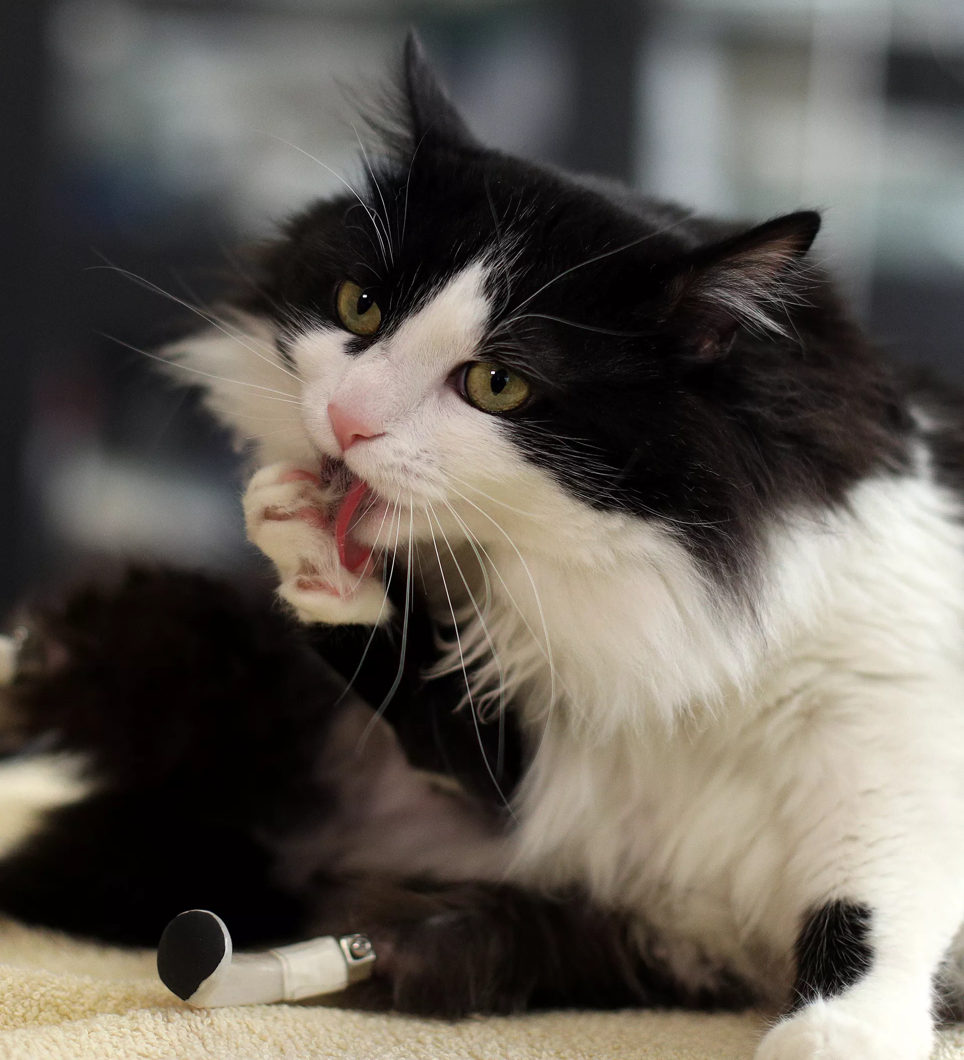 در ویدئوی دیگری که این گربه حتی نمی تواند پای خود را لیس بزند نیز توسط کاربرانی از کشورهای مختلف به اشتراک گذاشته شده است.