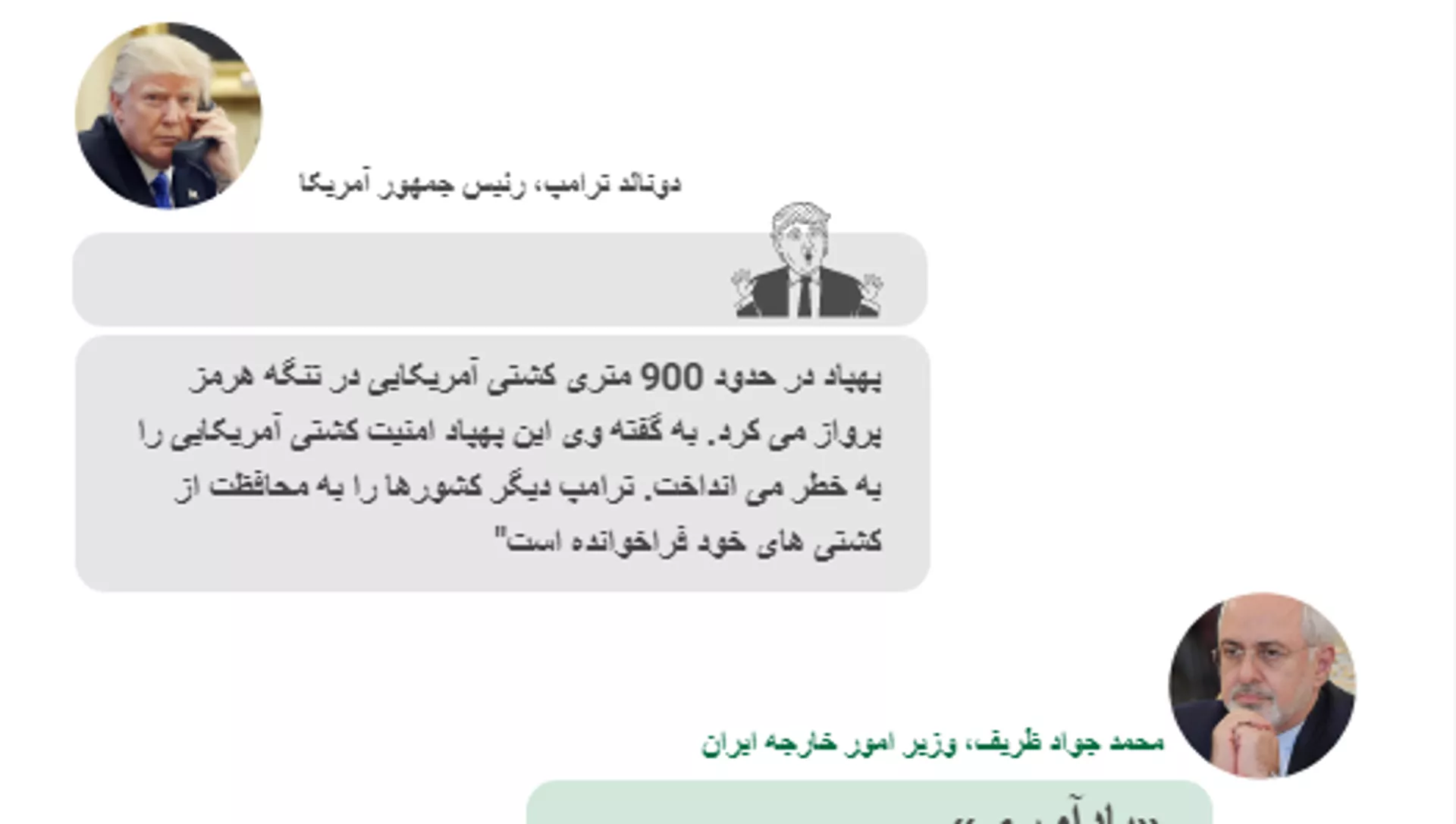 18 ژوئیه دونالد ترامپ رئیس جمهور آمریکا اعلام کرده بود که کشتی جنگی نیروی دریایی آمریکا پهپاد ایرانی را در تنگه هرمز نابود کرد. 19 ژوئیه سرتیپ پاسدار ابوالفضل شکارچی سرنگونی پهپاد را تکذیب کرد.