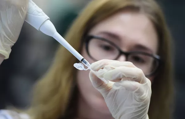 کارمند لابراتوار علمی تحقیقاتی در دانشگاه فدرال کازان در حال طراحی واکسن کرونا