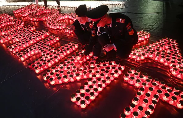 شمع های روشن شده توسط شرکت کنندگان در اقدام "شمع یادبود" در مقابل موزه پیروزی در مسکو.