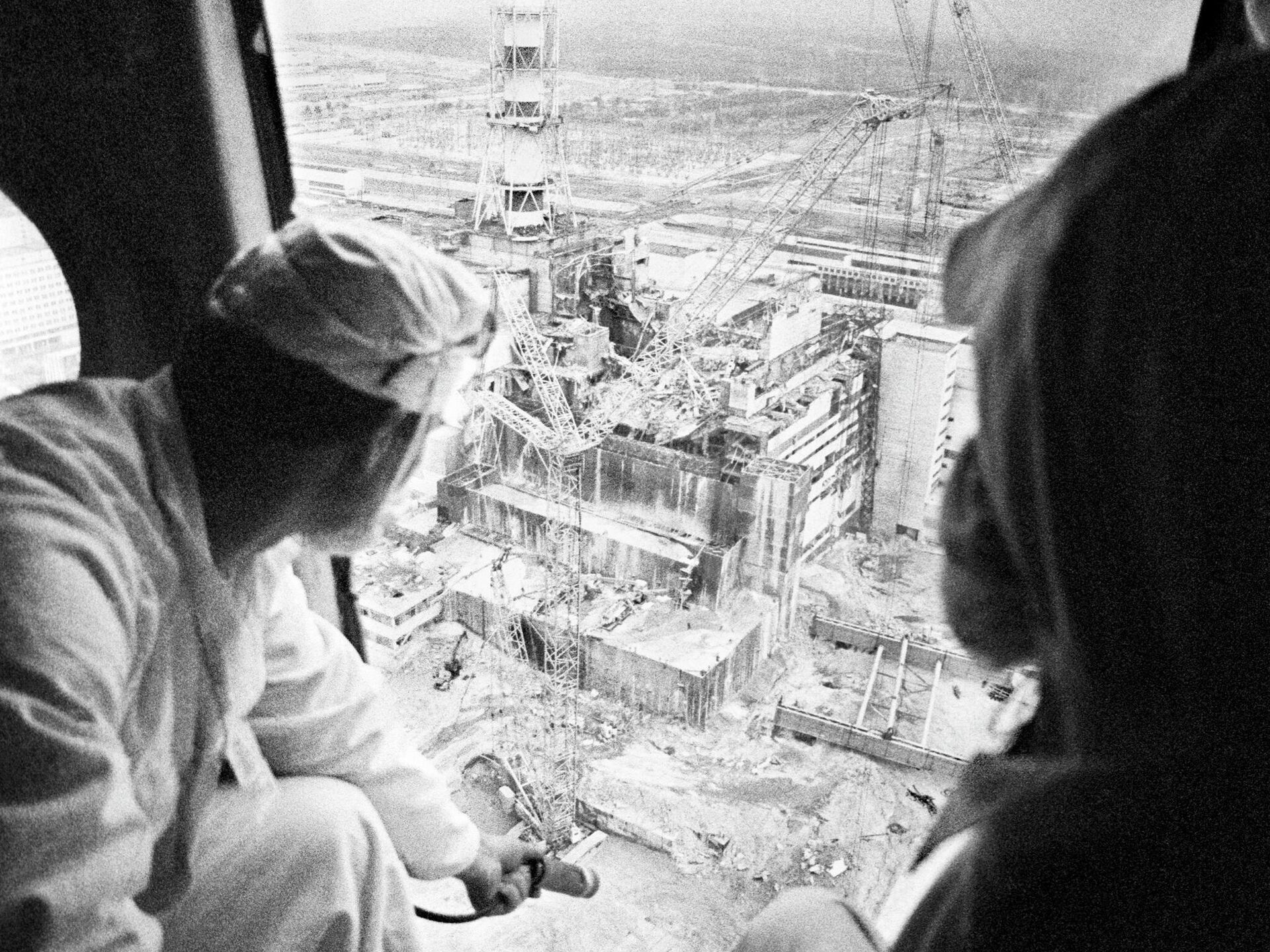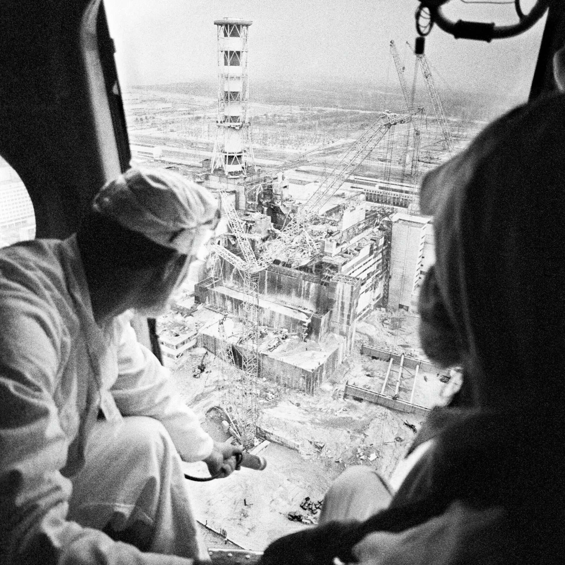 © Sputnik / Igor Kostin / مراجعه به بانک تصاویر متخصصان سوار بر هلیکوپتر پس از فاجعه در حال نمونه برداری از راکتورهای نیروگاه