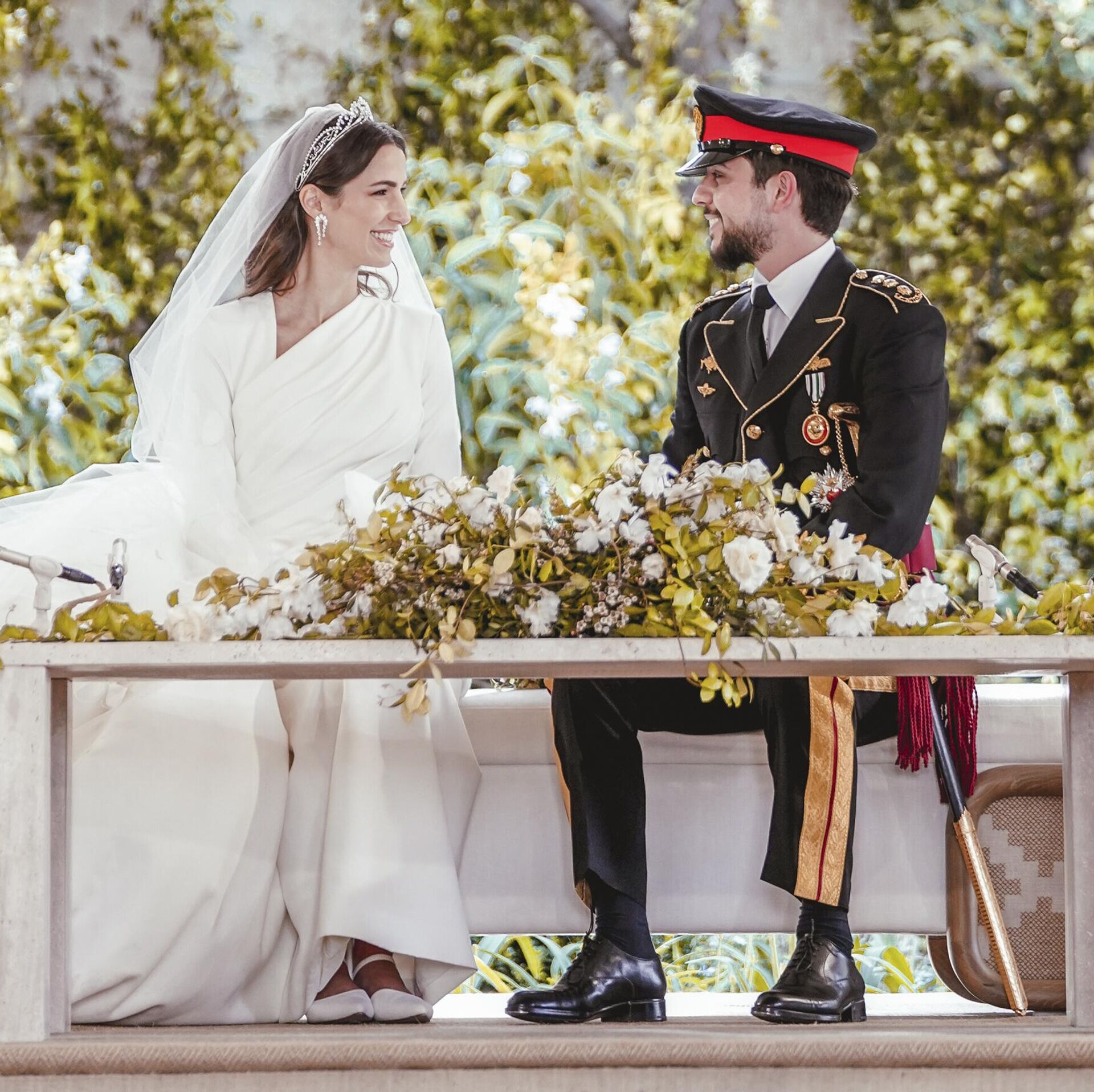 ولیعهد اردن حسین و رجوه السیف در مراسم عروسی خود برای مردم دست تکان می دهند.