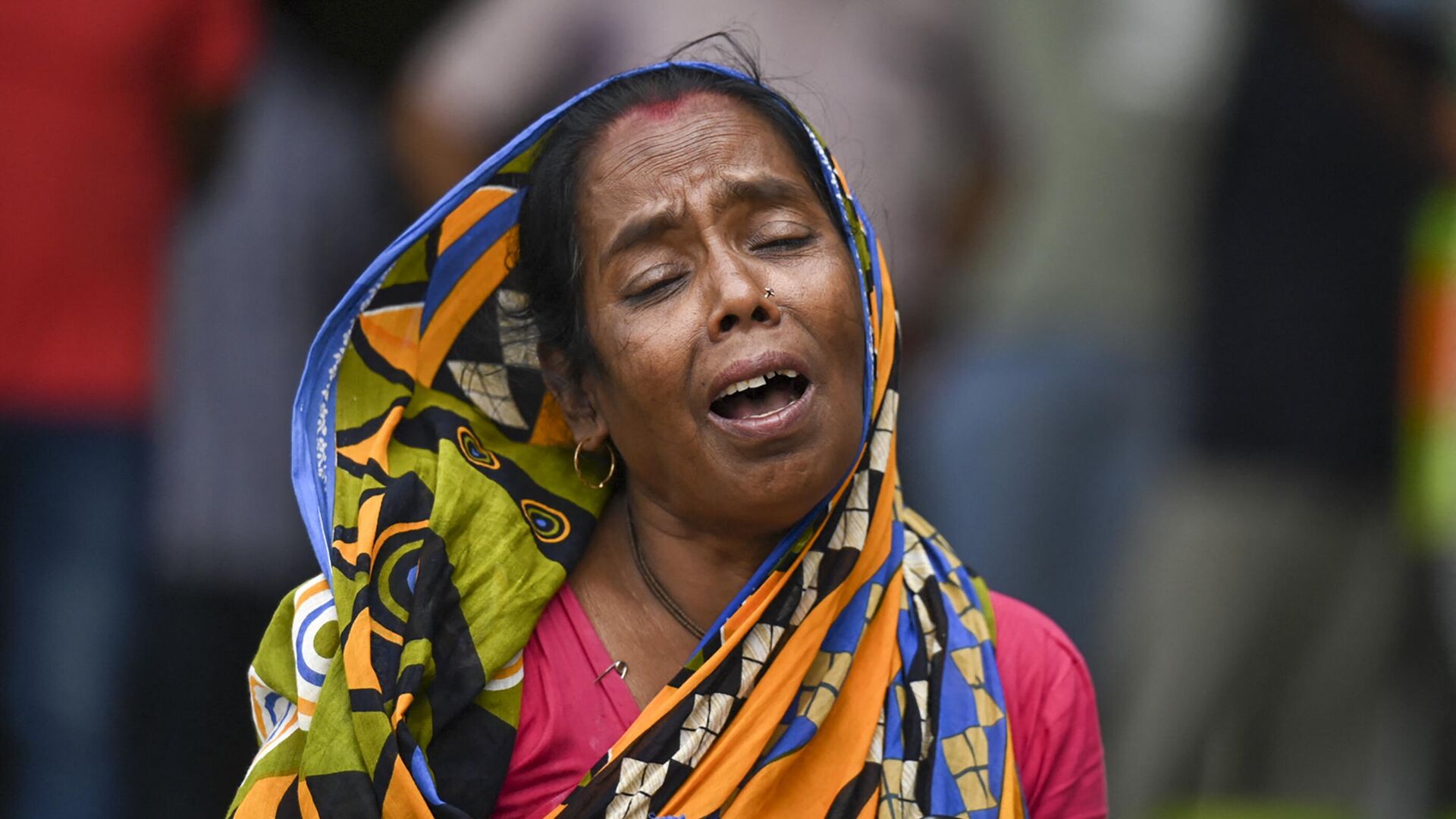 یکی از اعضای خانواده قربانی ها در یک پارک تجاری که به عنوان سردخانه موقت برای شناسایی کشته شدگان در نظر گرفته شده.