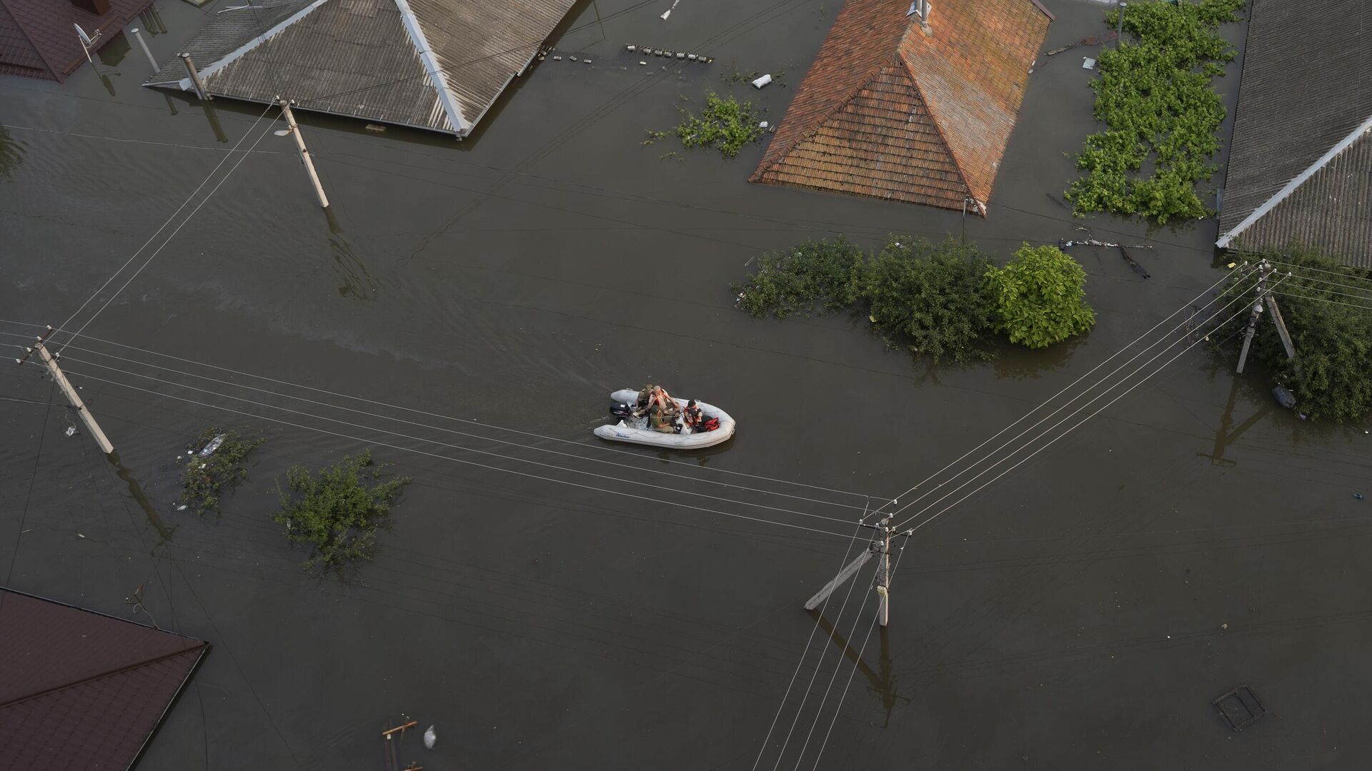 چهارشنبه، 7 ژوئن 2023، مردم سوار بر یک قایق لاستیکی در محله ای سیل زده در خرسون. (AP Photo/Roman Hrytsyna) - اسپوتنیک ایران