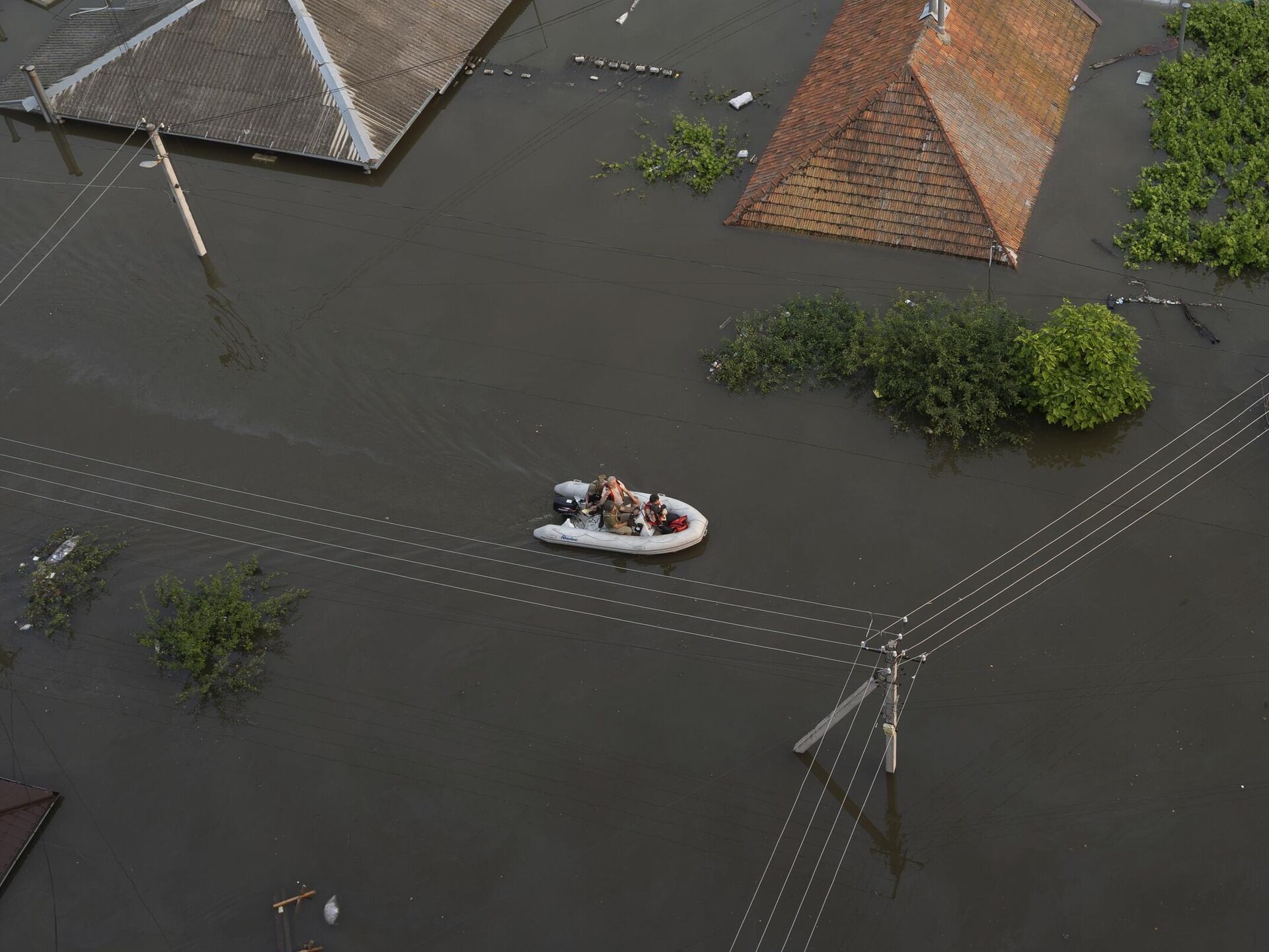 چهارشنبه، 7 ژوئن 2023، مردم سوار بر یک قایق لاستیکی در محله ای سیل زده در خرسون. (AP Photo/Roman Hrytsyna)