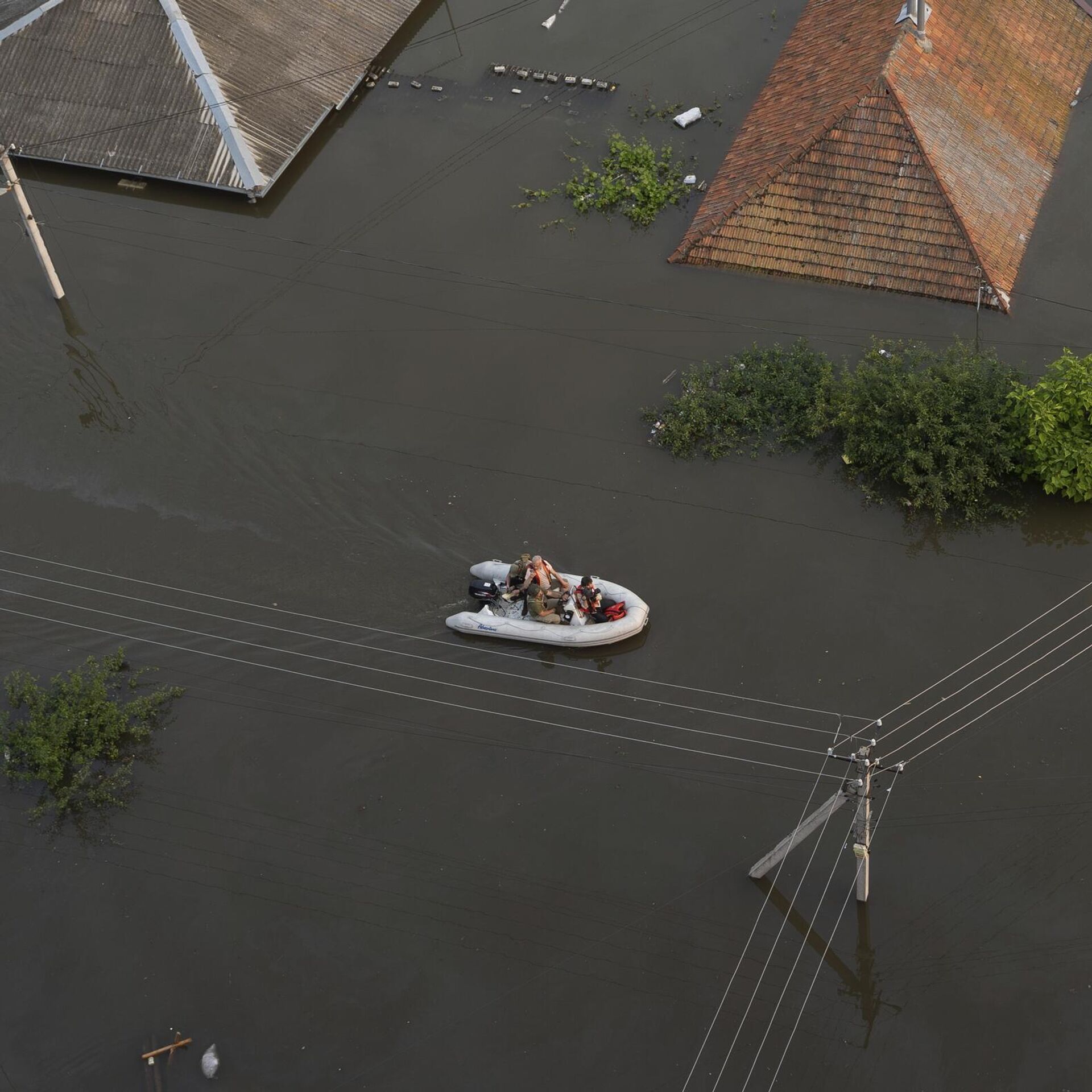 مردان در روستای کورسونکا، که تقریبا به طور کامل پس از تخریب سد نیروگاه برق آبی کاخوفسکایا زیر آب رفته است. در نتیجه حمله نیروهای مسلح اوکراین به سد نیروگاه کاخوفسکایا در 6 ژوئن، دریچه ها از بین رفتند و تخلیه بی رویه آب آغاز شد. حدود 2.7 هزار خانه در 15 شهرک در منطقه خرسون زیر آب رفت. مقامات منطقه خرسون وضعیت فوق العاده در این منطقه اعلام کرده اند.
