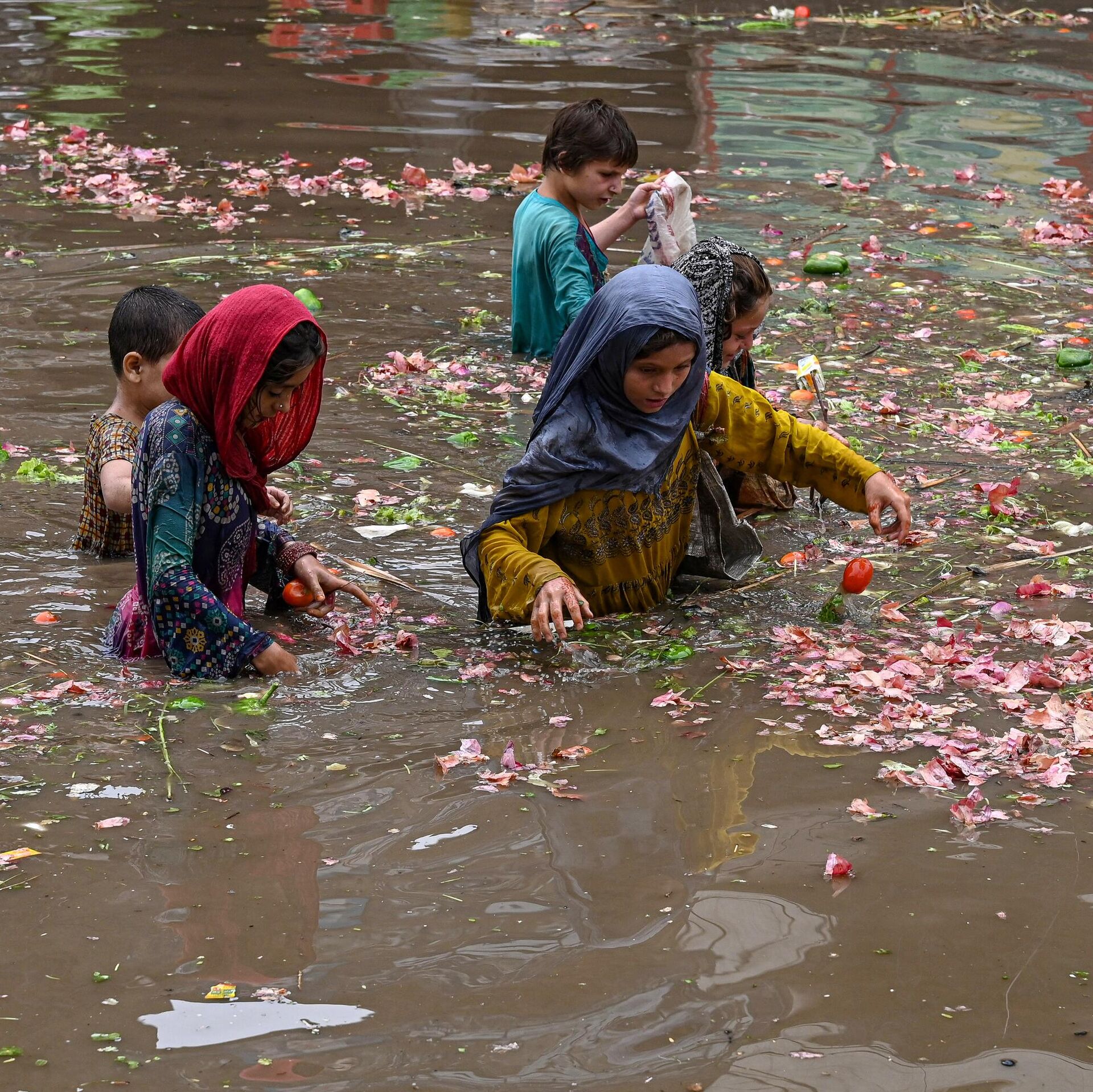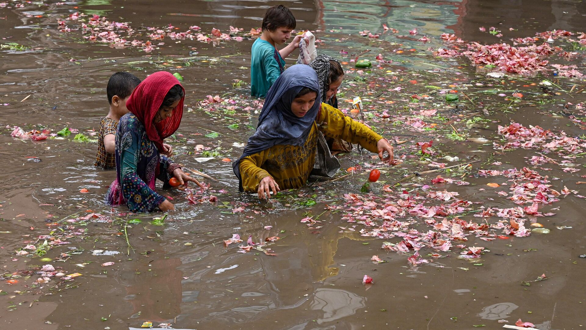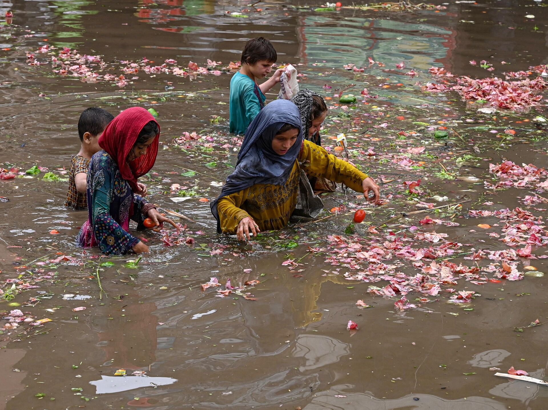 پس از بارندگی شدید در لاهور در 26 ژوئن 2023، کودکان در یک بازار سیل زده