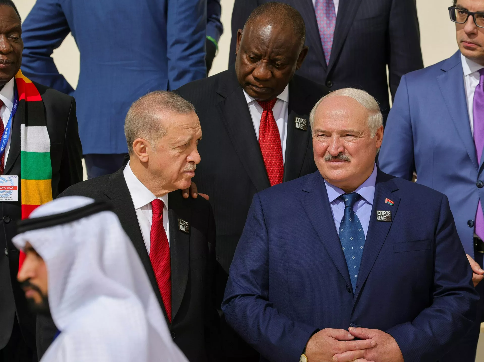 الکساندر لوکاشنکو، رئیس جمهور بلاروس، به سخنان رجب طیب اردوغان، همتای ترک خود در اجلاس آب و هوا COP28 سازمان ملل در دبی گوش می دهد. مذاکرات در اجلاس آب و هوای سازمان ملل در دبی، در شرایط تشدید تلاش ها برای محدود کردن روند گرمایش و کاهش نقش سوخت های فسیلی در جهان و در حالی برگزار می شود که درگیری اسرائیل و حماس بر این اجلاس سایه افکنده است.