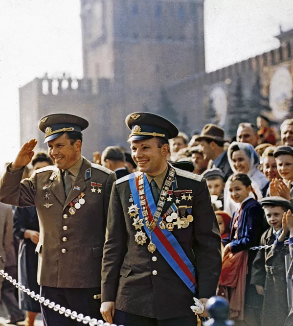 یوری گاگارین و پاول پاپوویچ، فضانوردان شوروی در روی تریبون مهمانان در تظاهرات اول ماه مه، روز جهانی کارگر در میدان سرخ مسکو
