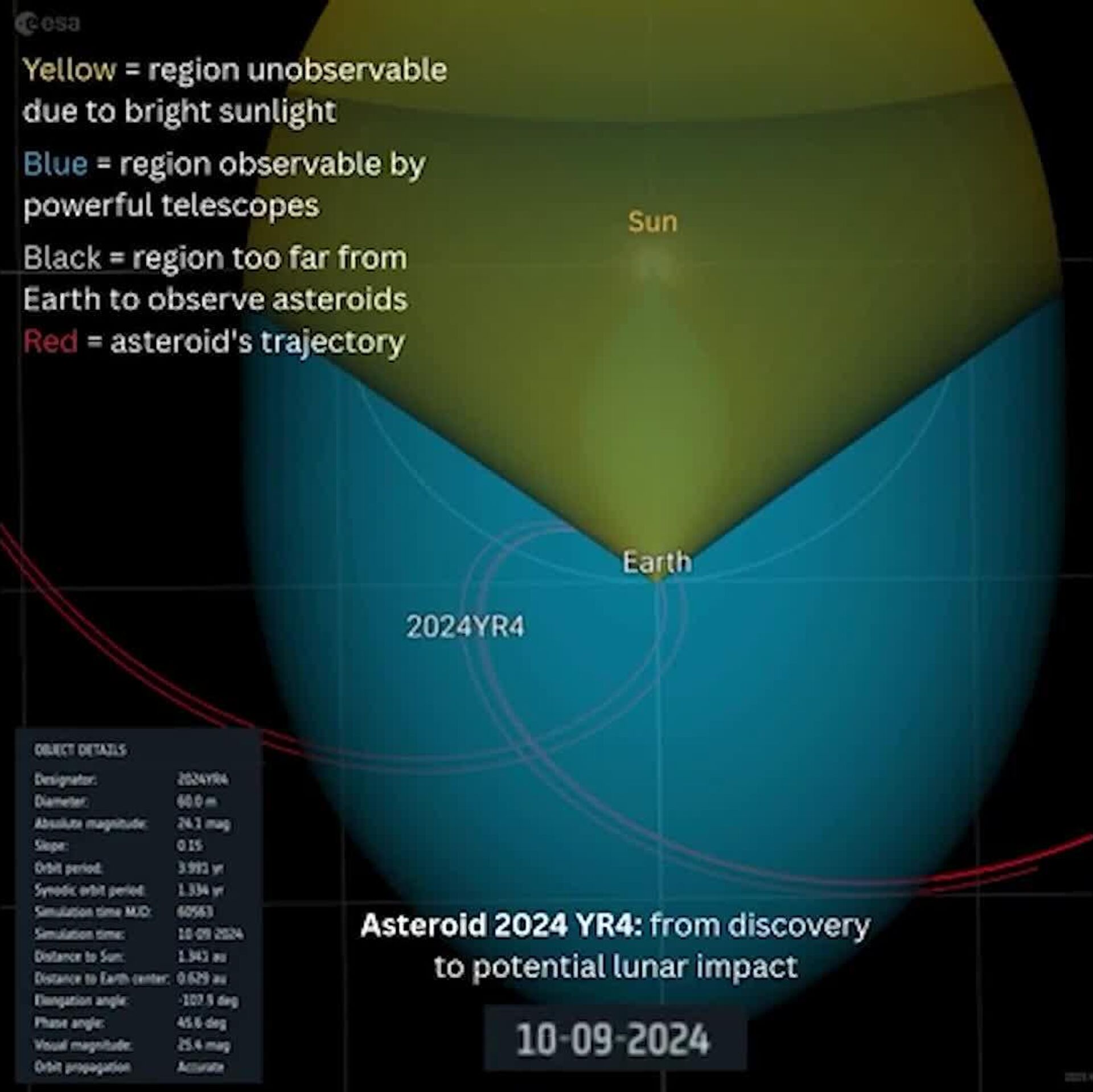 طبق گفته ناسا، احتمال برخورد 2024 YR4 با ماه در سال 2032 در حال حاضر 4.3 درصد است. یک برخورد احتمالی میتواند تا 100 هزار تن سنگ ماه را آزاد کند که به ماهوارهها و سایر دستگاههای موجود در مدار زمین آسیب میرساند و همچنین یک دهانه برخوردی به عرض یک کیلومتر در ماه ایجاد میکند.