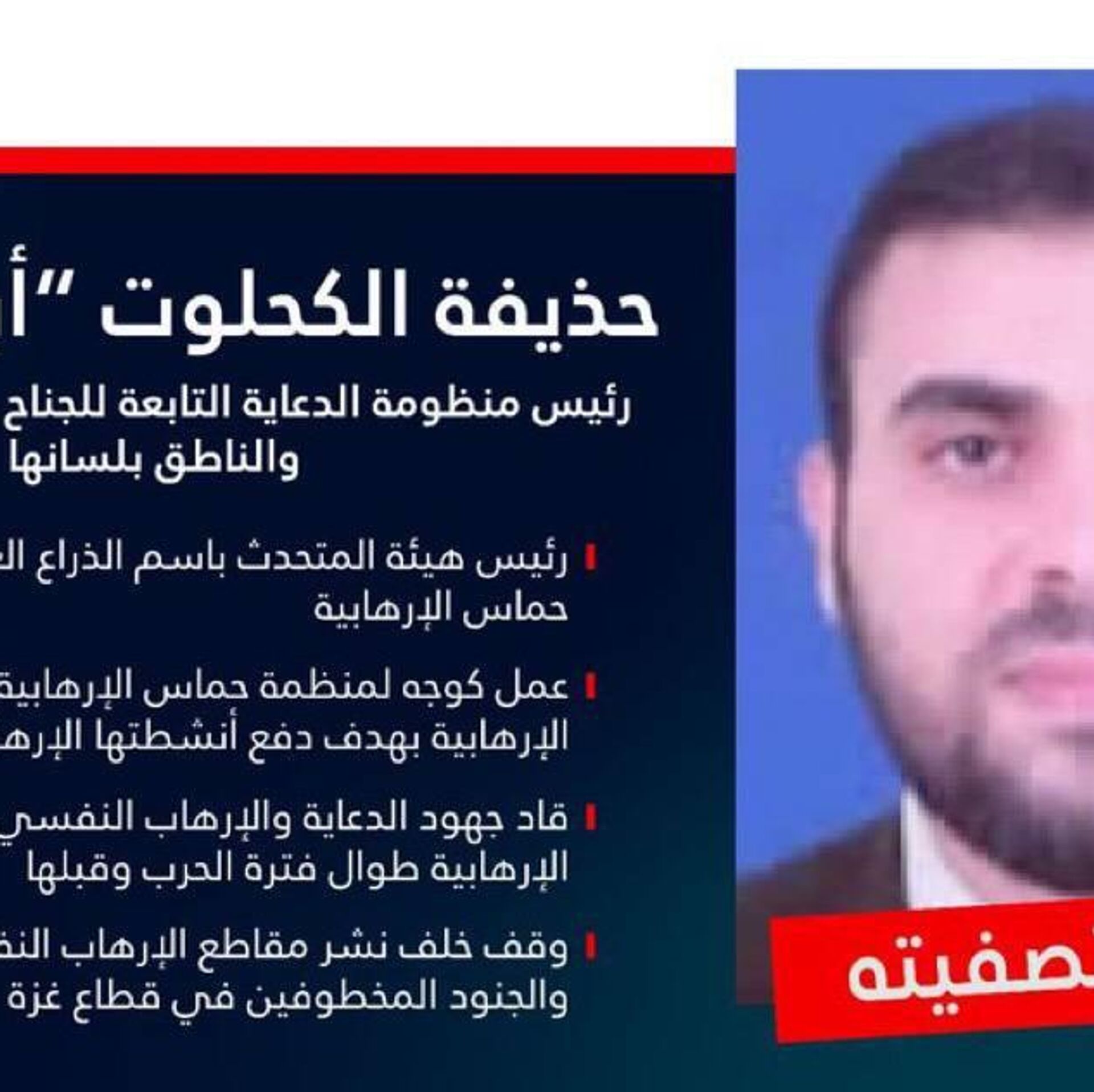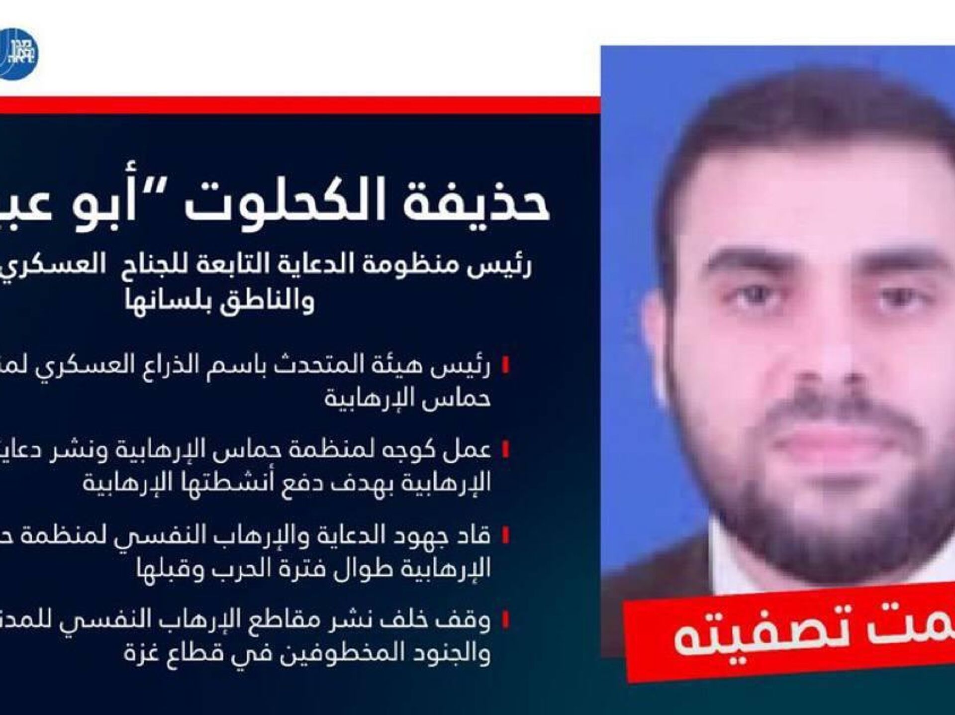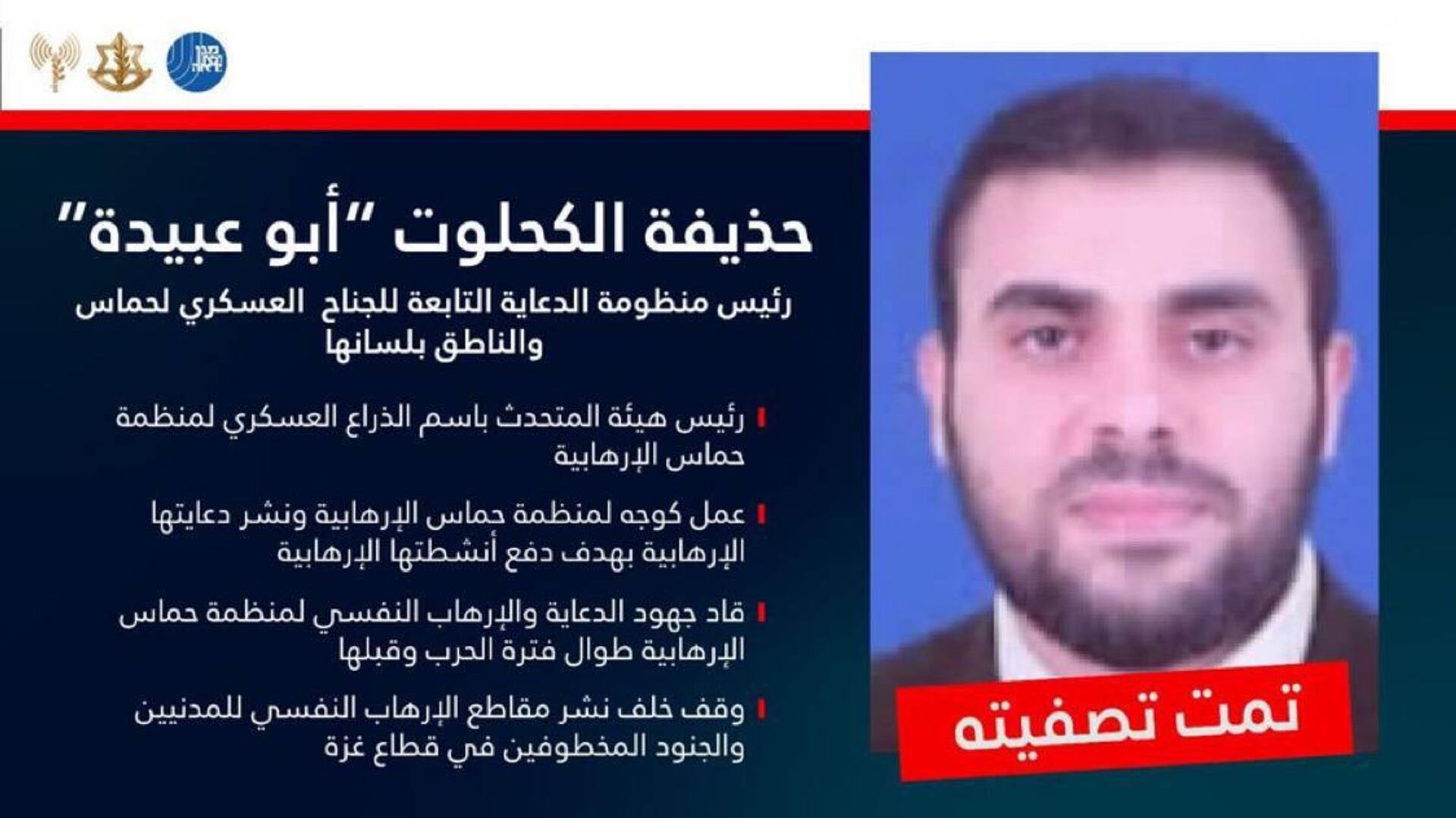 ارتش اسرائیل از کشته شدن حذیفه الکحلوت، معروف به «ابو عبیده»، رئیس سیستم رسانهای شاخه نظامی حماس، خبر داد.