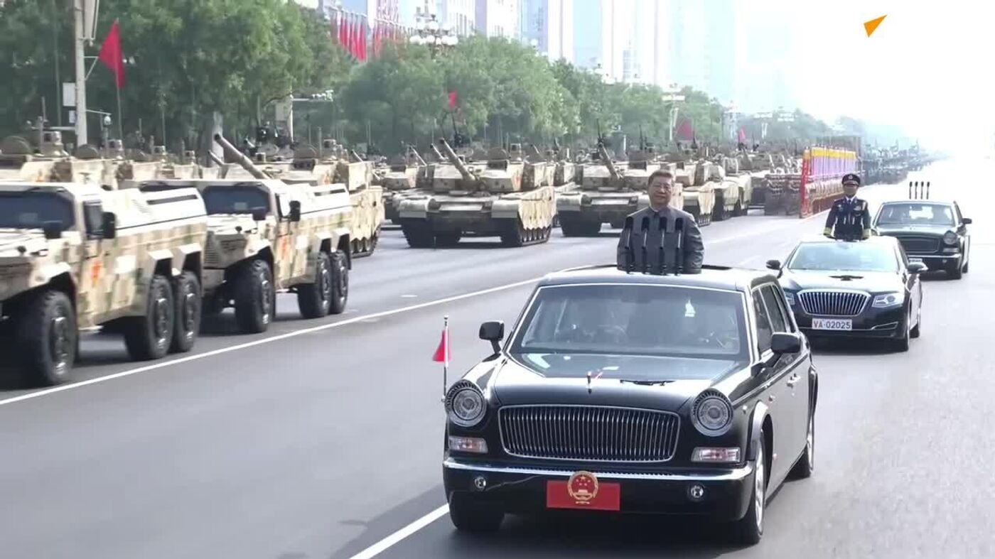 شی جین پینگ، رهبر چین، در حال بازدید از رژه نظامی در پکن