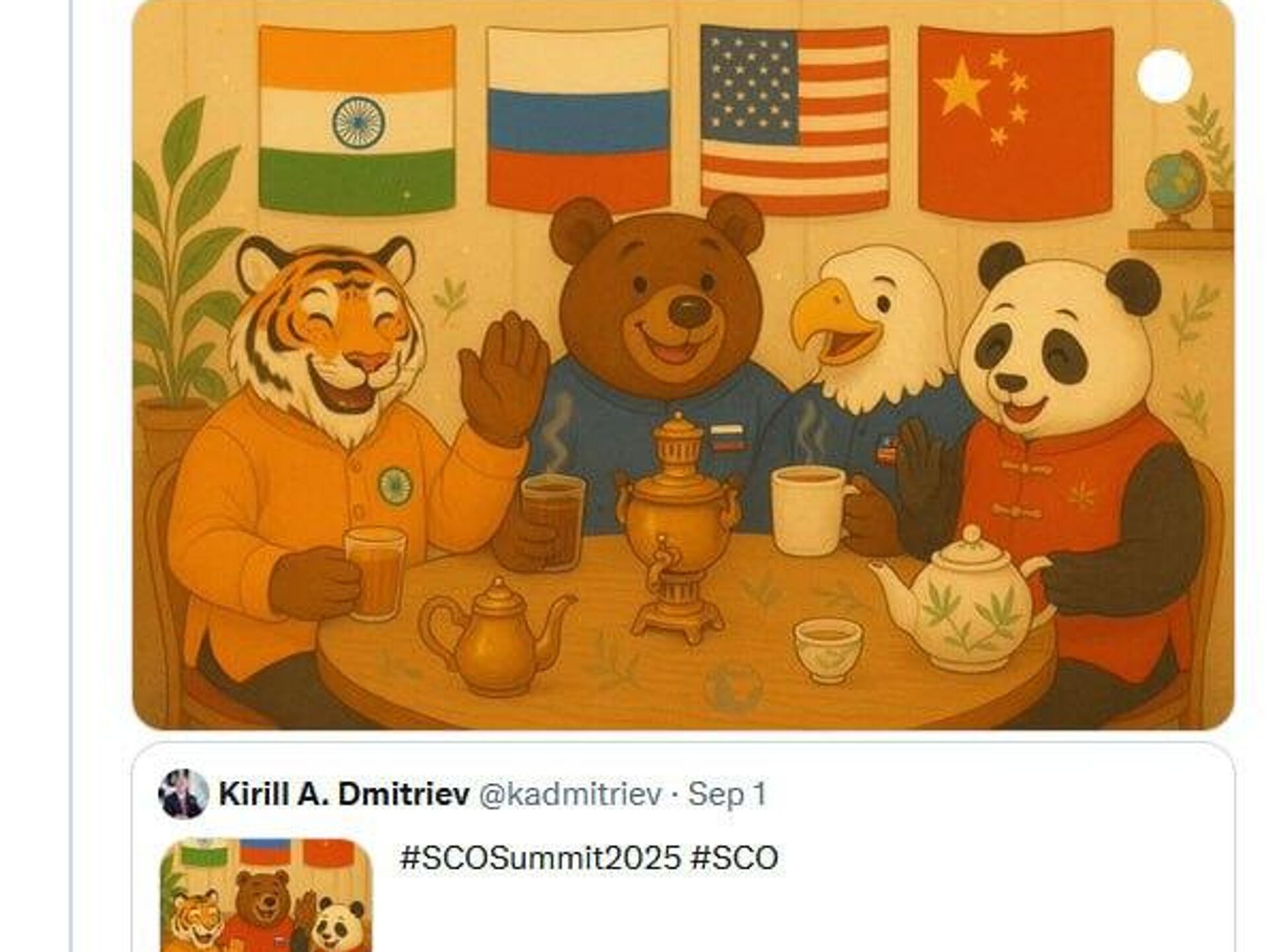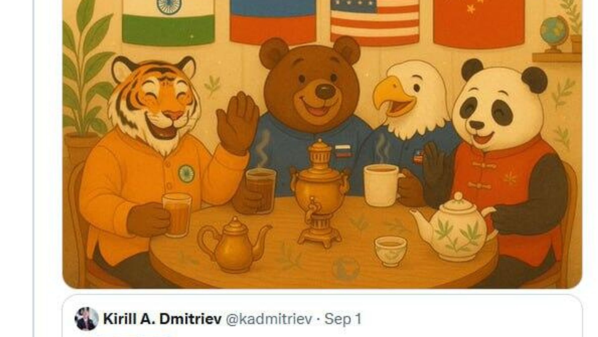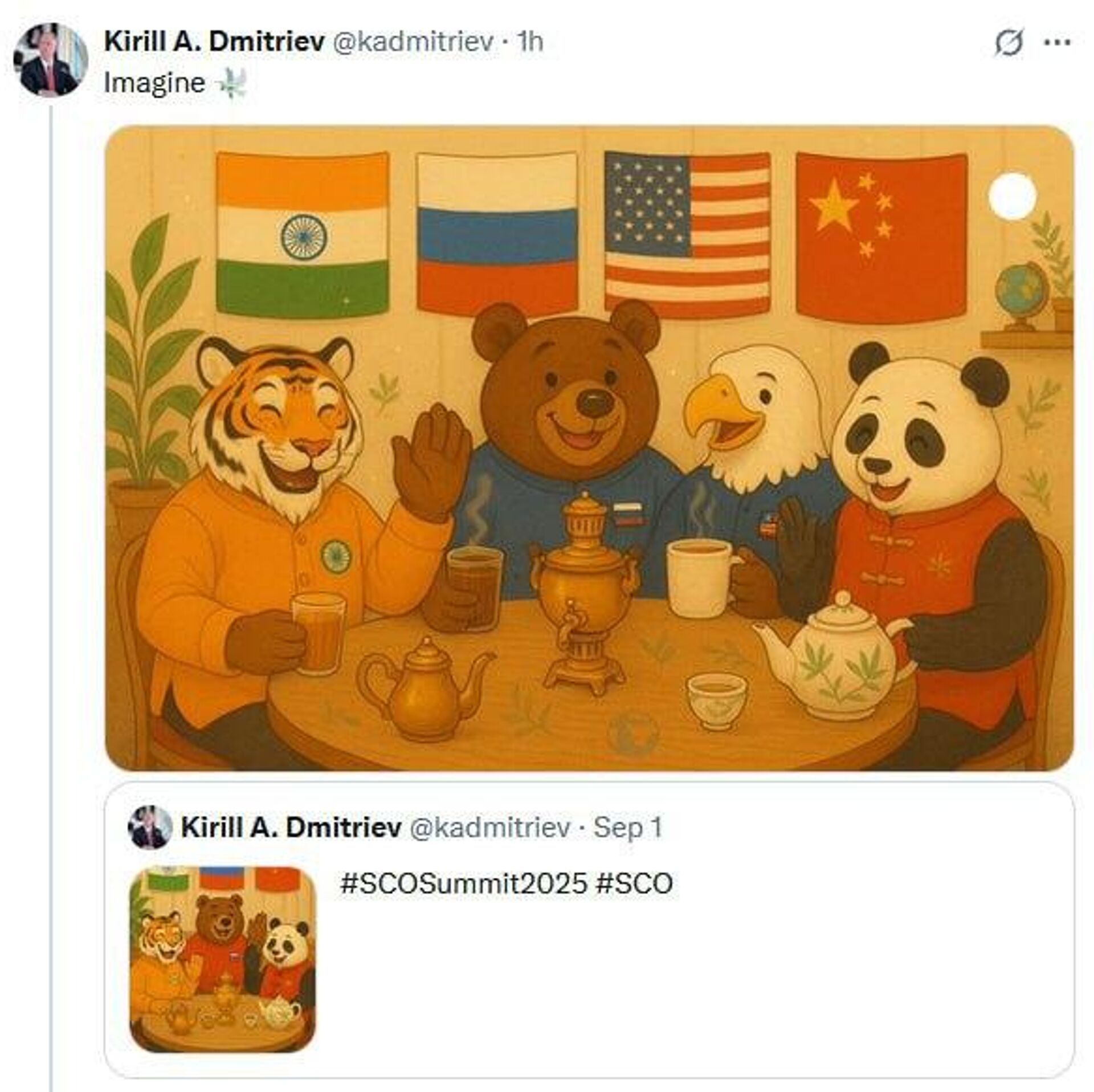 کریل دمیتریف، مدیر عامل صندوق سرمایهگذاری مستقیم روسیه و نماینده ویژه رئیس جمهور روسیه در امور سرمایهگذاری و همکاری اقتصادی با کشورهای خارجی، تصویر ایالات متحده آمریکا را به «تصویر دوستی» اختصاص داده شده به اجلاس سازمان همکاری شانگهای اضافه کرد.