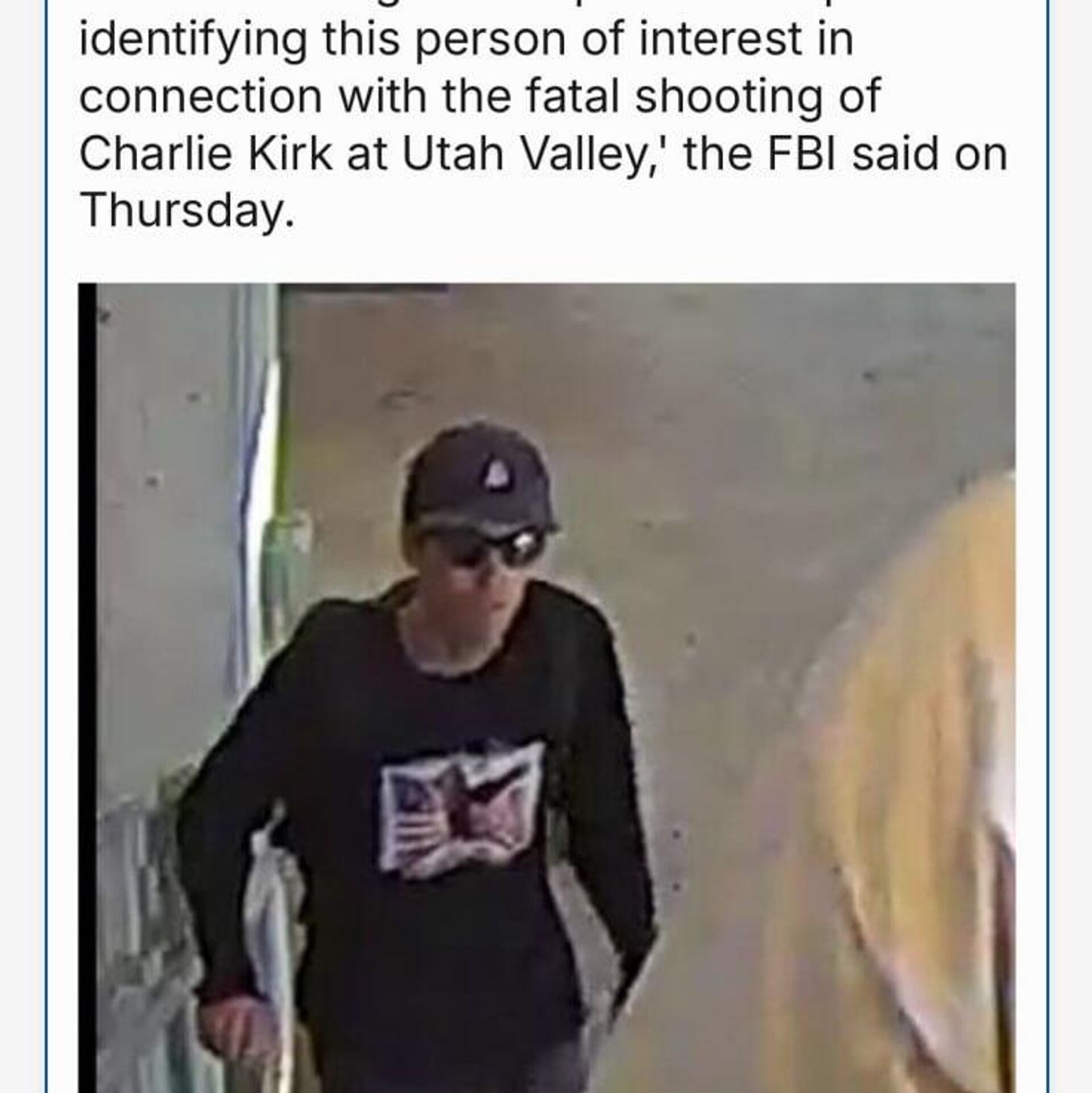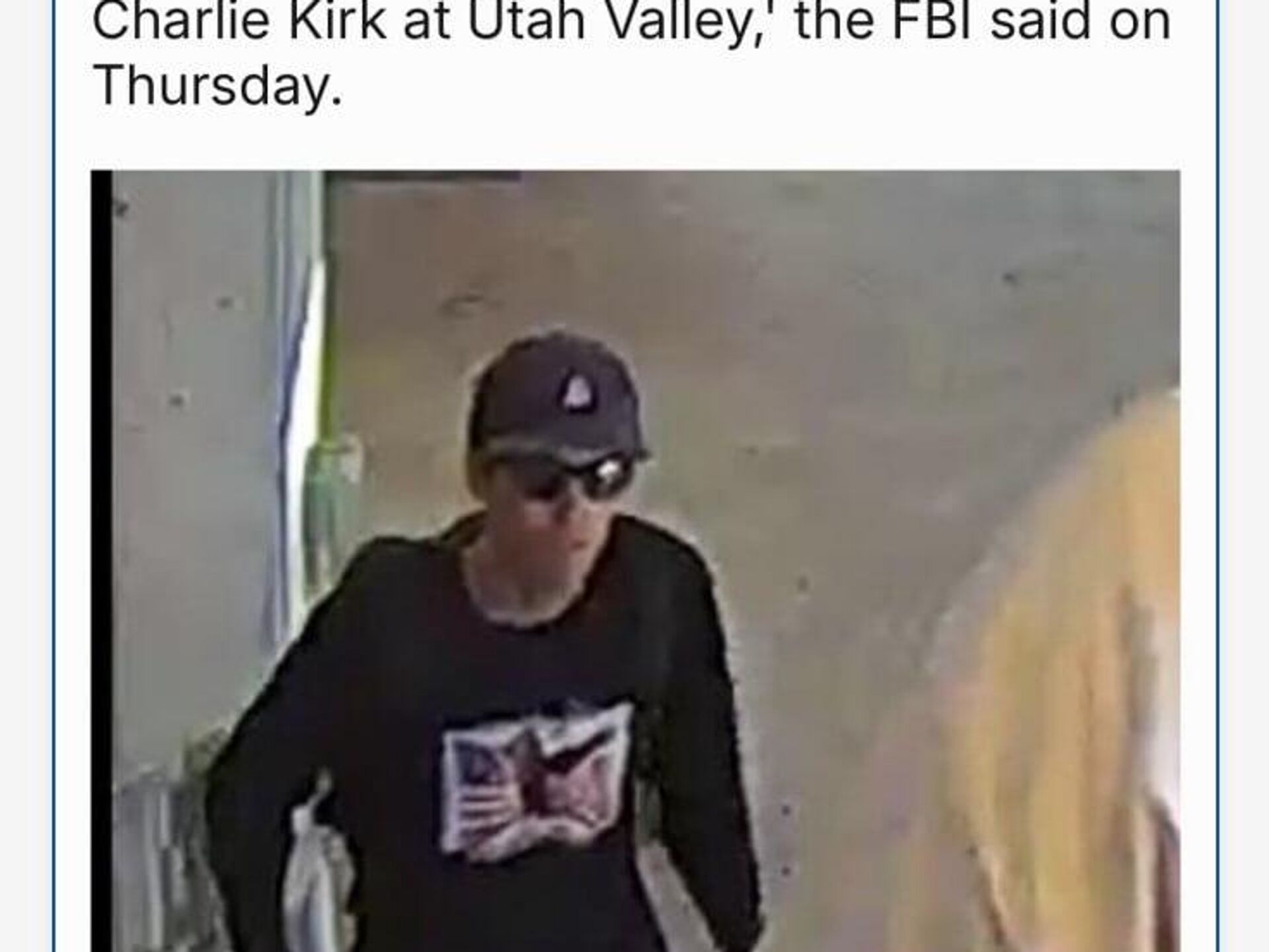 در 11 سپتامبر، افبیآی عکسی از مردی منتشر کرد که گمان میرود در قتل چارلی کرک، فعال راستگرا، دست داشته است.
