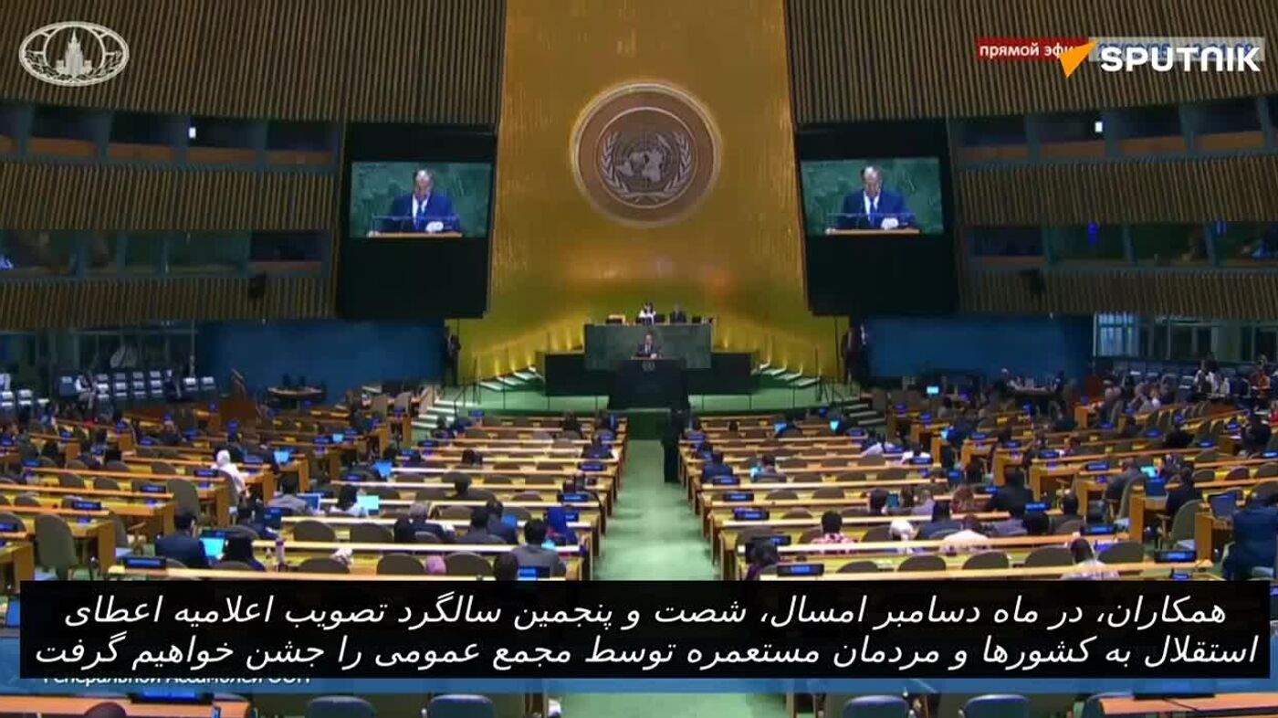 ▫وزیر خارجه روسیه در سازمان ملل گفت: روند استعمارزدایی نتیجه مستقیم تحقق حق ملتها برای تعیین سرنوشت خود بود. مردم آفریقا و آسیا از زندگی تحت ستم استعمارگران امتناع ورزیدند، همانطور که پس از کودتا در اوکراین، کریمه و دانباس از تسلیم شدن در برابر رژیم نئونازی در کی یف خودداری کردند.