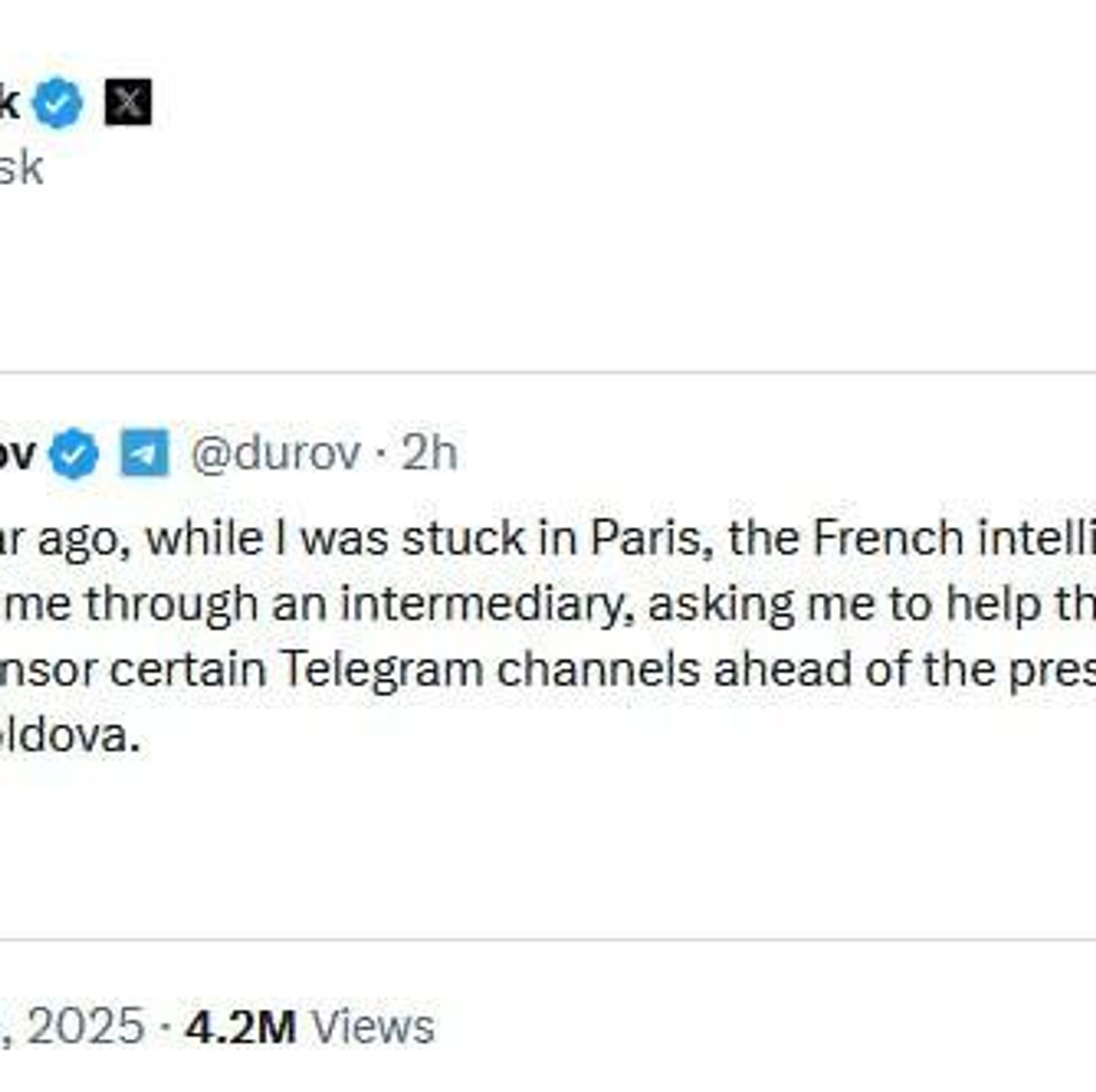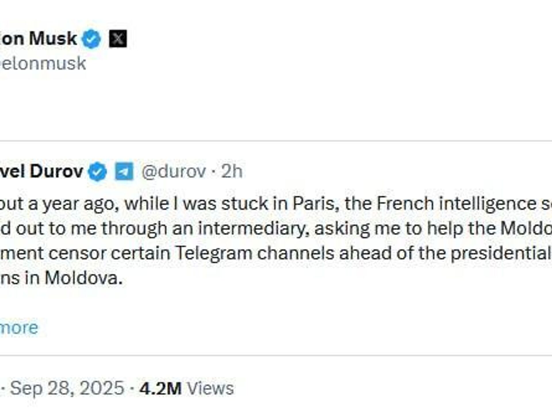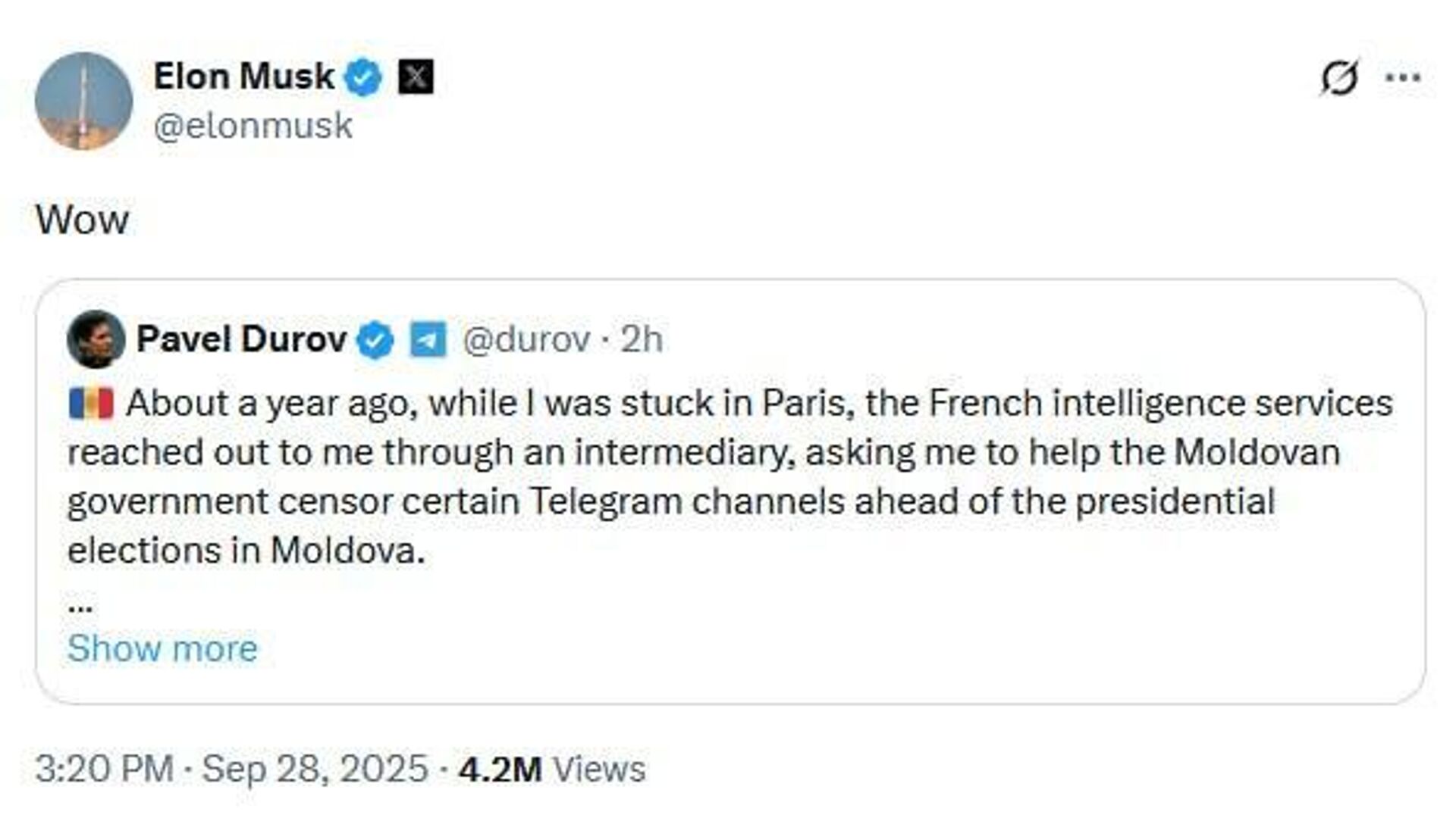 18:15 28.09.2025 (بروز رسانی شده: 18:20 28.09.2025) واکنش ماسک به افشاگری پاول دوروف درباره فشار فرانسه و مولداوی برای سانسور کانالهای تلگرام پیش از