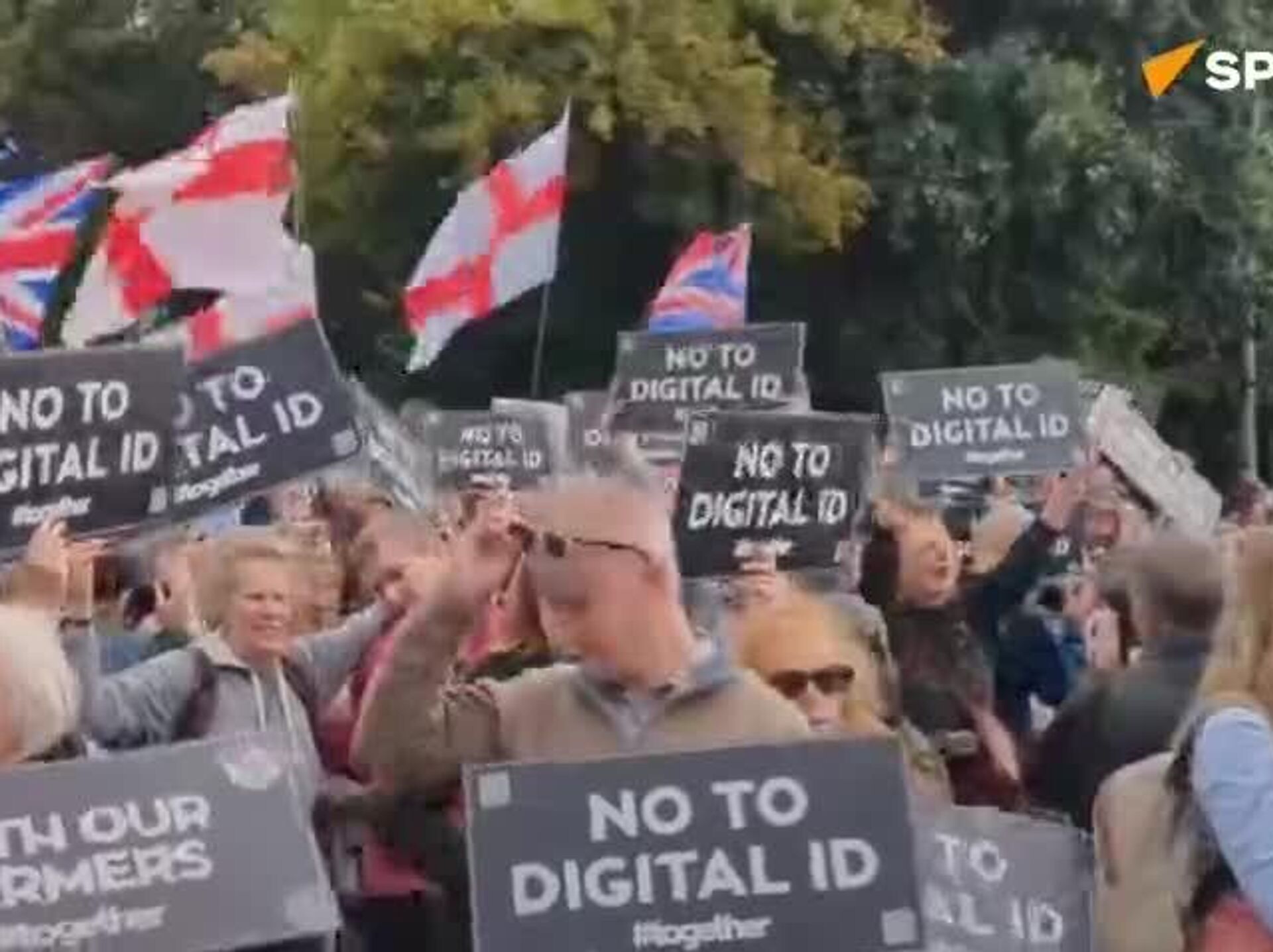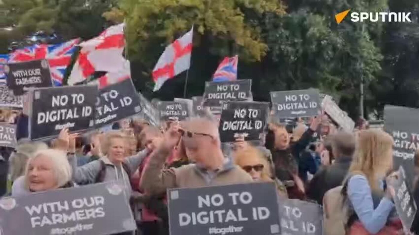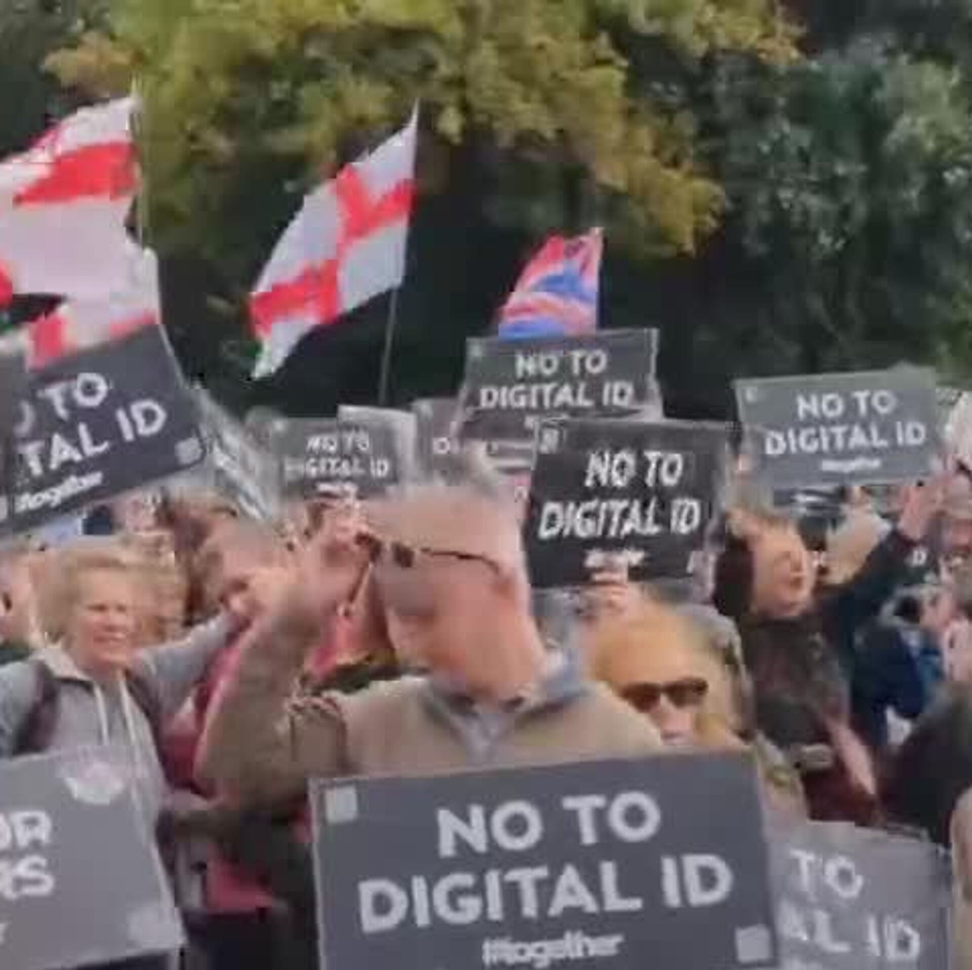 جمعیت با پلاکاردهایی که روی آنها نوشته شده بود «نه به کارت شناسایی دیجیتال» و «نه به خشونت دیجیتال»، شعار میدادند: «بدون کارت شناسایی، مرگ بر استارمر، مرگ بر حزب کارگر!»