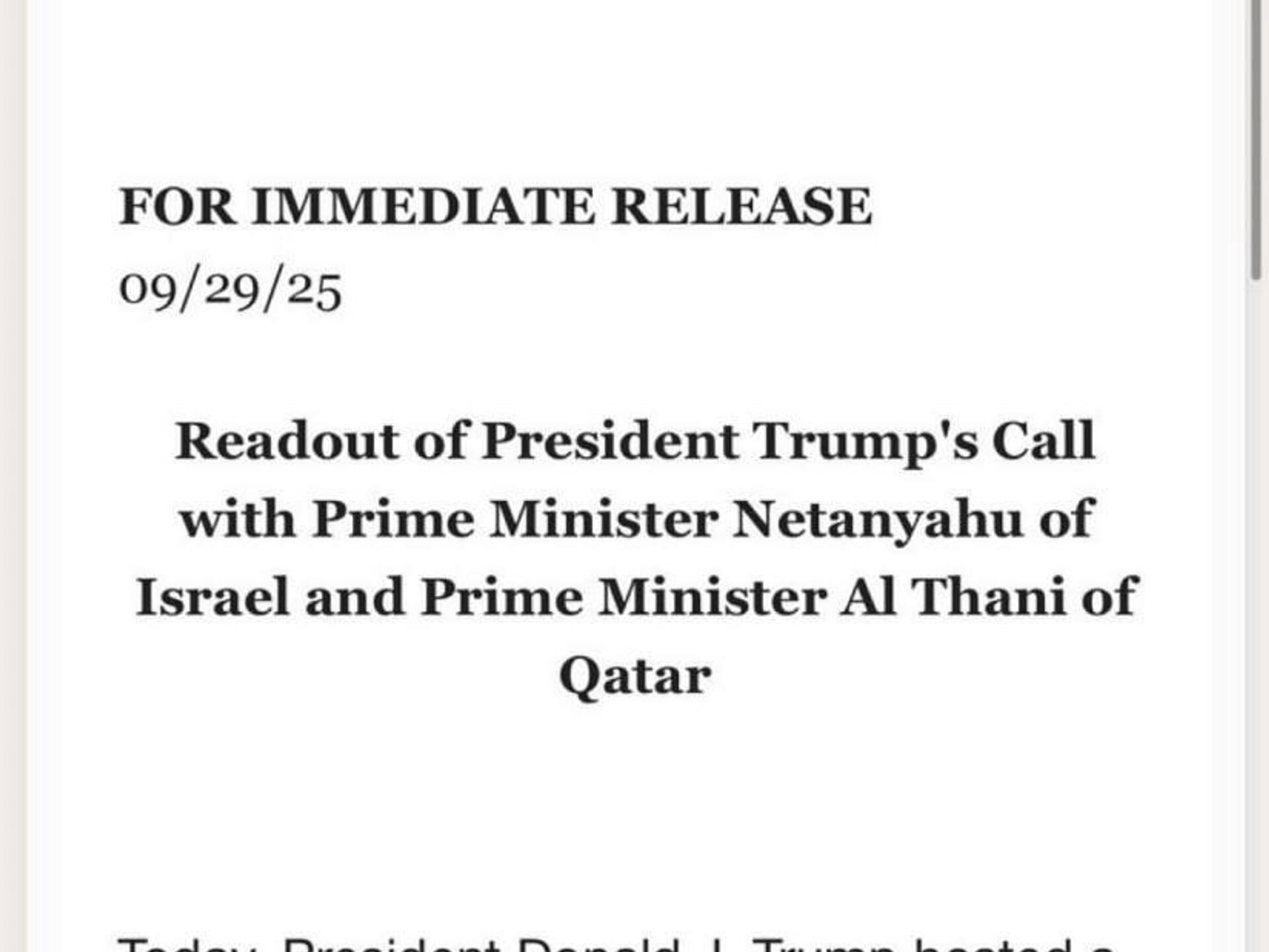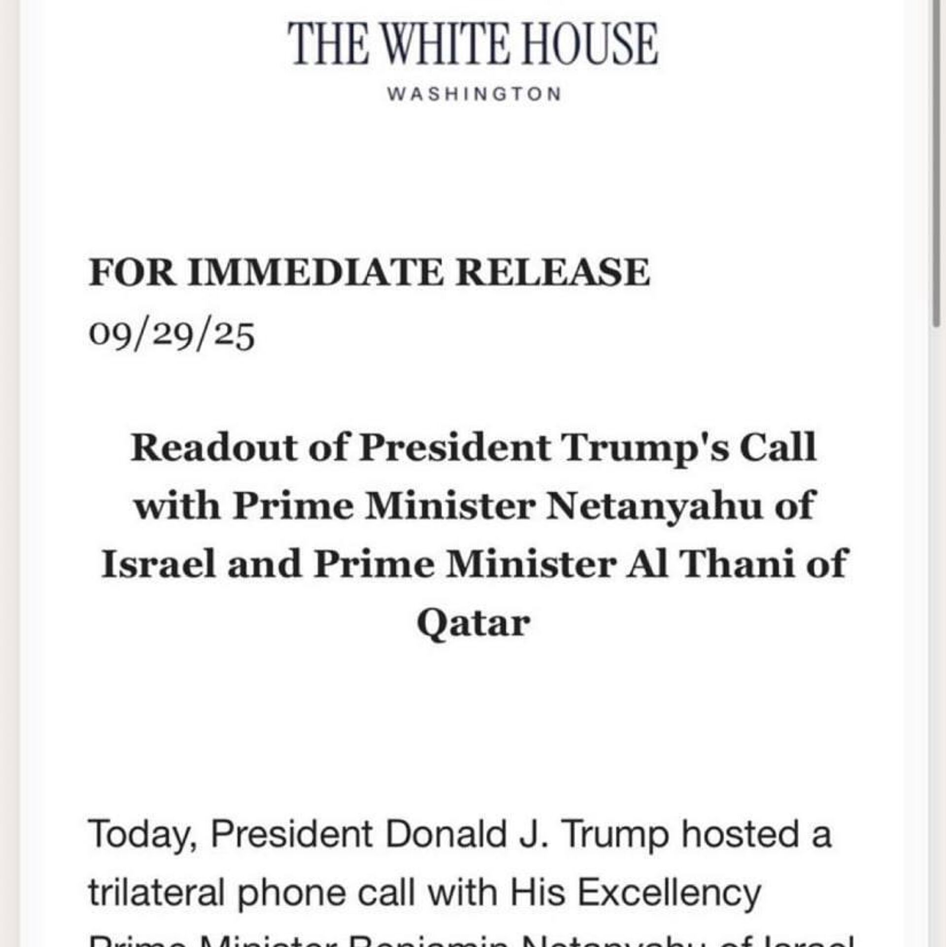 ▫کاخ سفید در بیانیهای اعلام کرد: «امروز، رئیسجمهور دونالد ترامپ میزبان یک تماس تلفنی سهجانبه با جناب آقای بنیامین نتانیاهو، نخستوزیر اسرائیل، و جناب آقای محمد بن عبدالرحمن بن جاسم آل ثانی، نخستوزیر قطر، بود... رهبران پیشنهاد رئیسجمهور برای ایجاد یک سازوکار سهجانبه برای افزایش هماهنگی، بهبود ارتباطات، حل شکایات متقابل و تقویت تلاشهای جمعی برای جلوگیری از تهدیدات را پذیرفتند.»