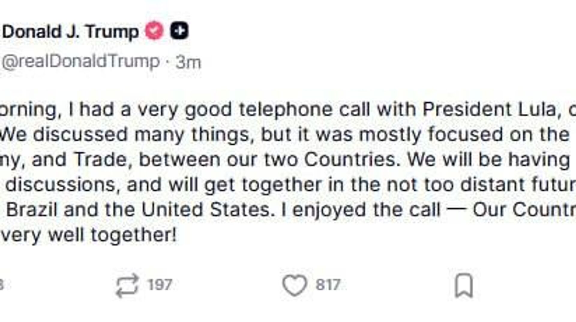 ▫رهبران دو کشور به مدت 30 دقیقه صحبت کرده و لولا دعوت خود از ترامپ برای شرکت در اجلاس اقلیمی آینده در بلم را تکرار کرد.