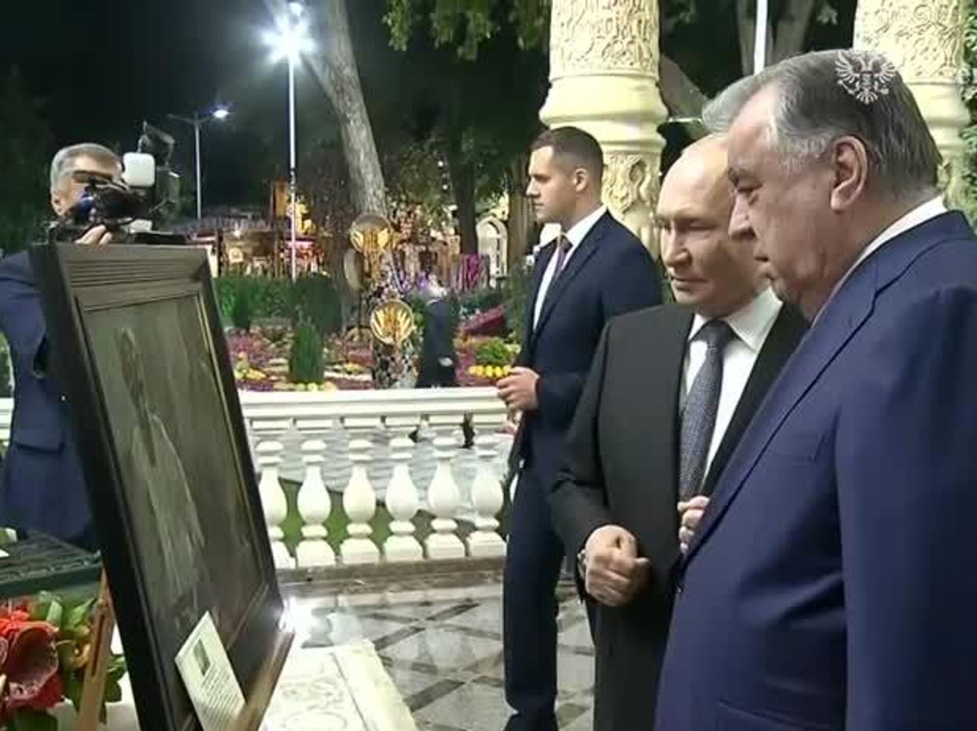 پوتین و امامعلی رحمان پیش از ضیافت ناهار غیررسمی در باغ گیاهشناسی "ایرام" در دوشنبه▫رهبر روسیه تابلوی نقاشی «دوستان تاجیک» و کتاب «تاجیکها» که به... 08.10.2025, اسپوتنیک ایران