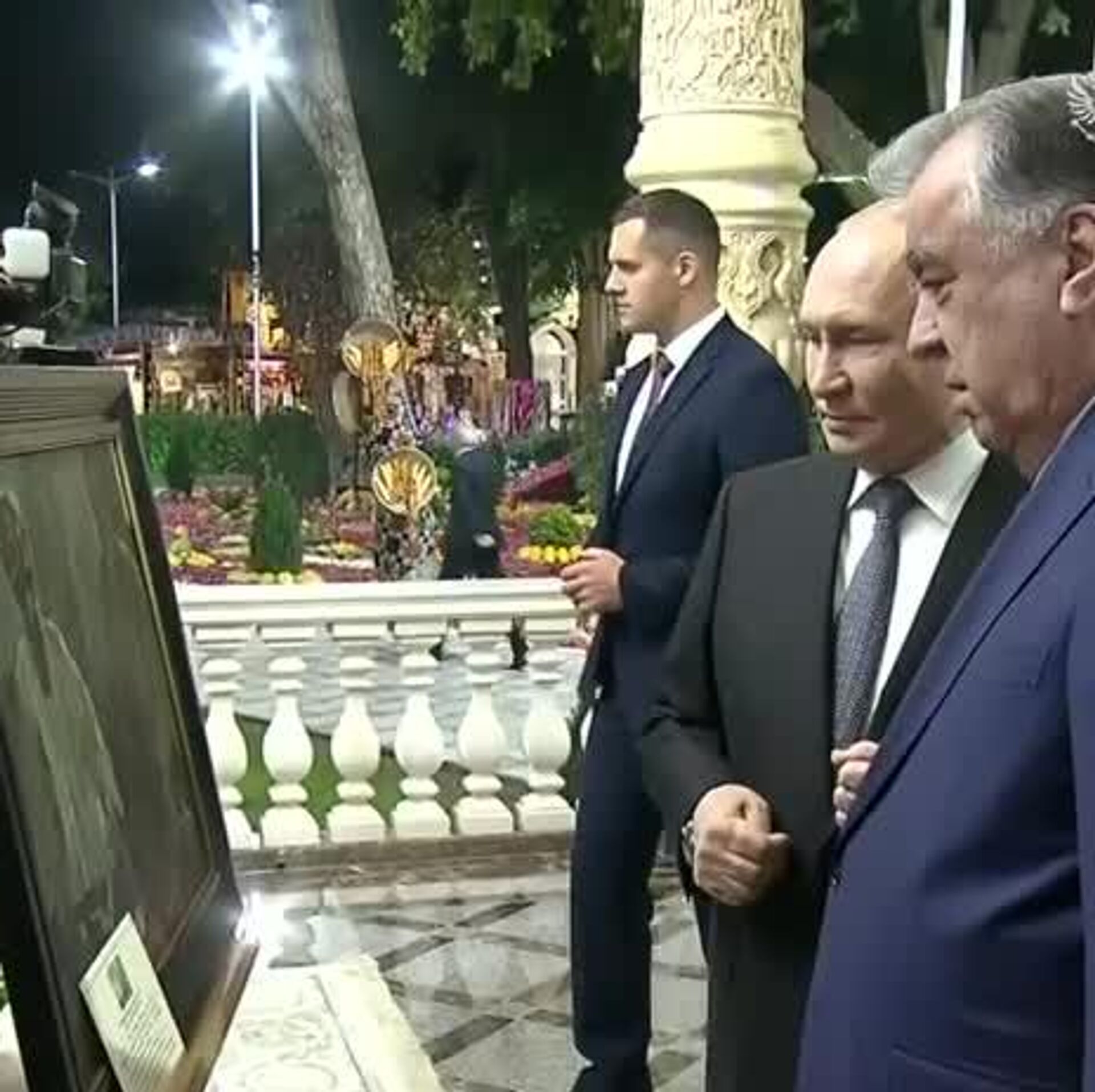 21:24 08.10.2025 (بروز رسانی شده: 21:40 08.10.2025) پوتین و امامعلی رحمان پیش از ضیافت ناهار غیررسمی در باغ گیاهشناسی "ایرام" در دوشنبه