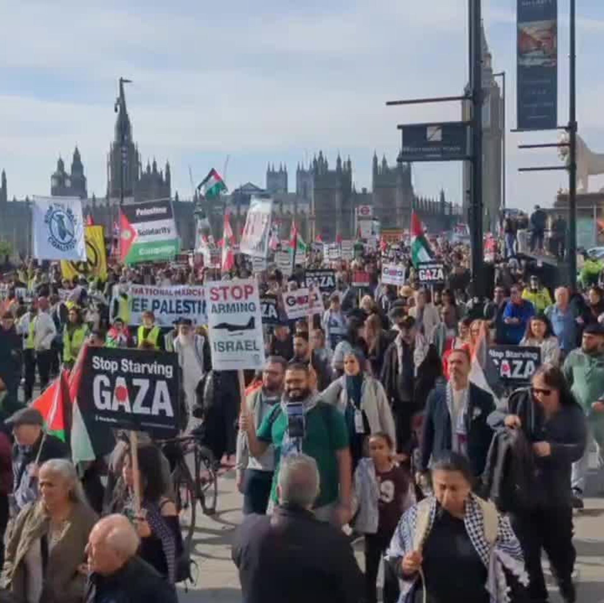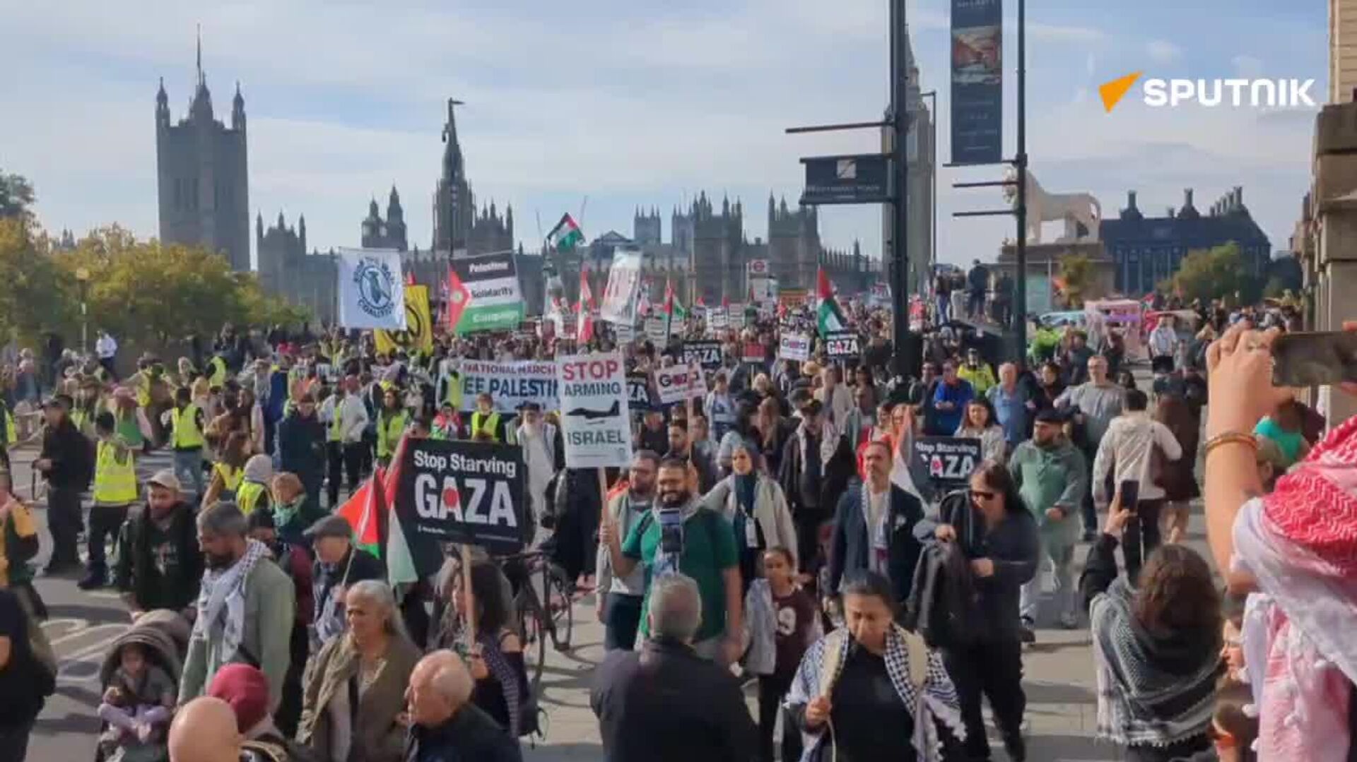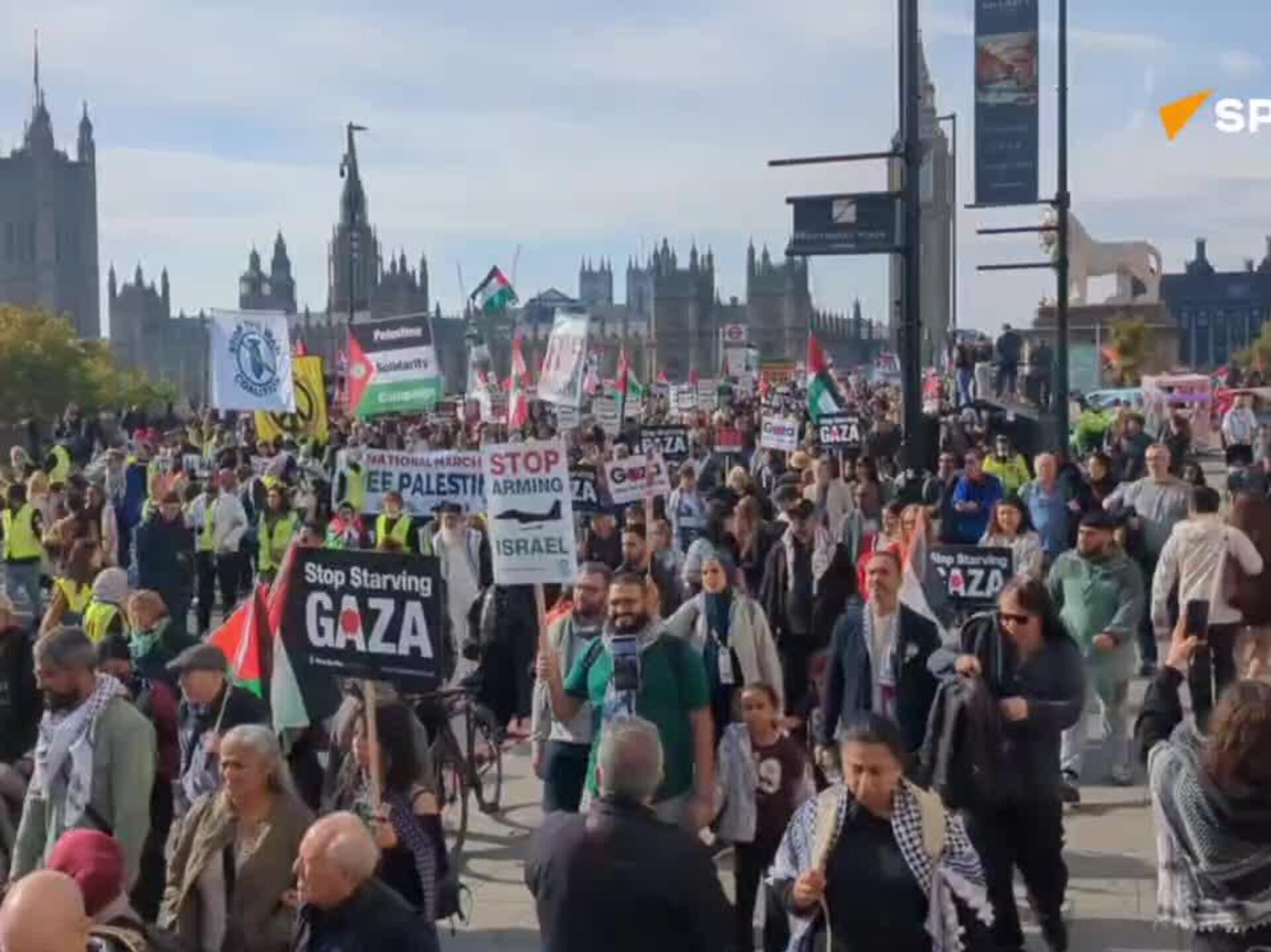 خبرنگار اسپوتنیک: دهها هزار نفر در مرکز لندن در حمایت از فلسطین، با عنوان «راهپیمایی ملی برای فلسطین» تظاهرات کردند