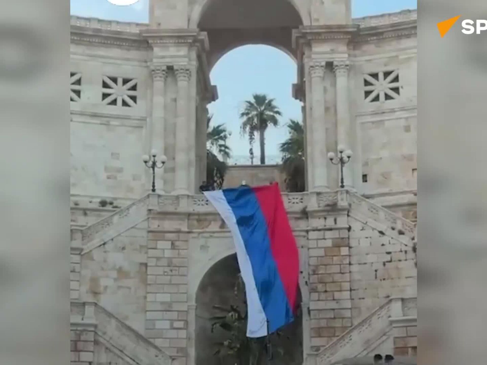 پرچم روسیه برای حمایت از پخش مستندهای شبکه "آر تی" بر فراز یکی از شهرهای ایتالیا به اهتزاز درآمد