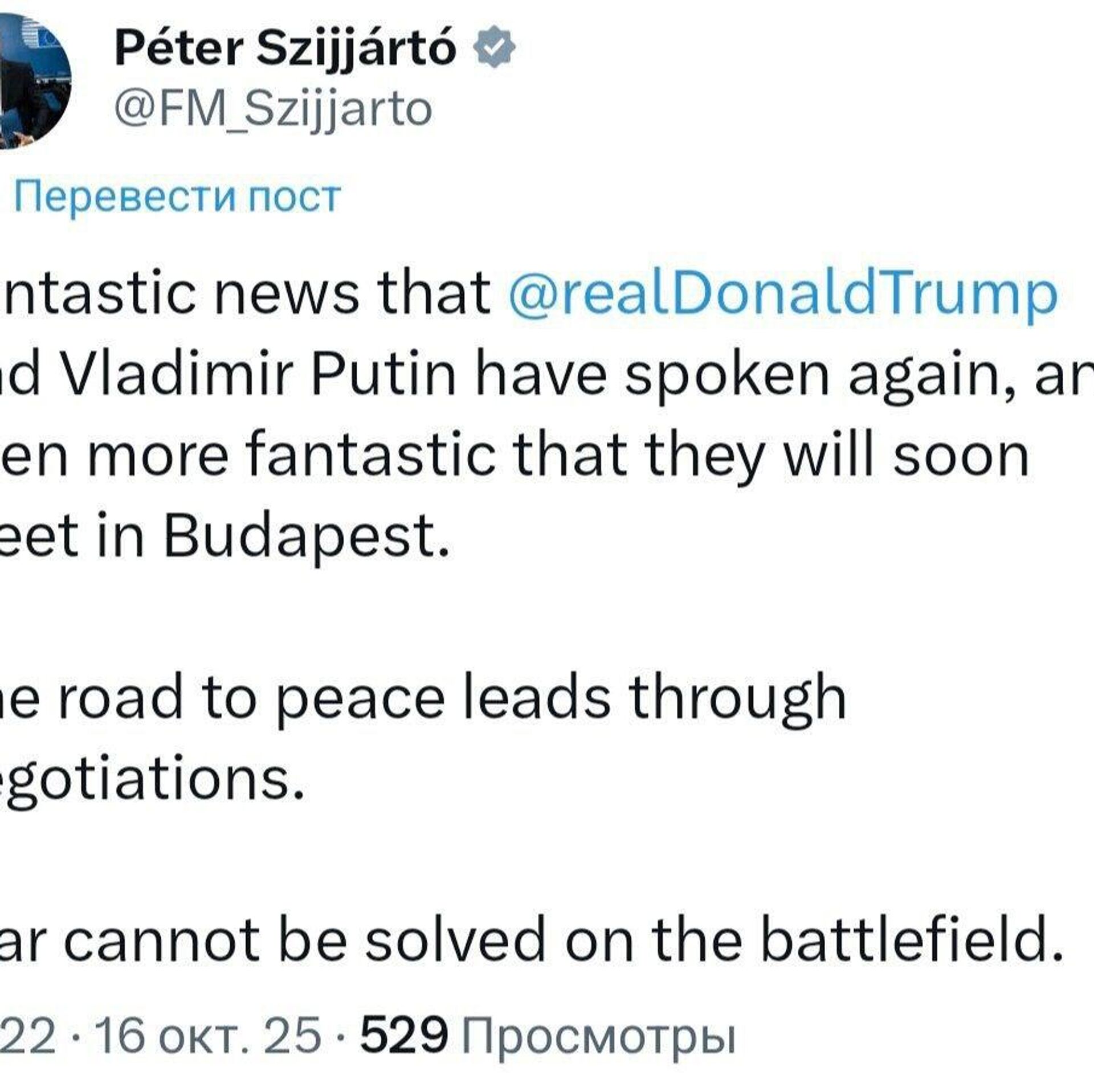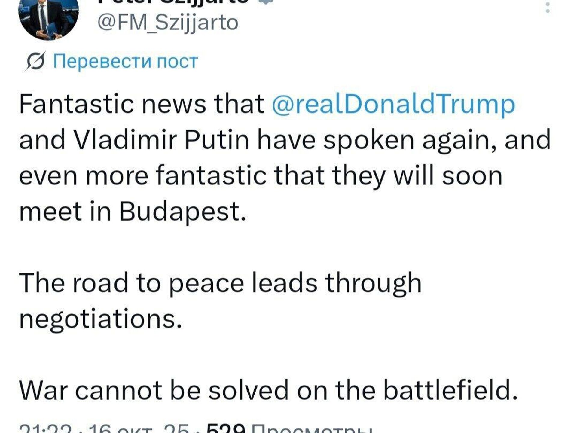 پیتر سیارتو، وزیر خارجه مجارستان افزود: «راه صلح از طریق مذاکرات میگذرد.»