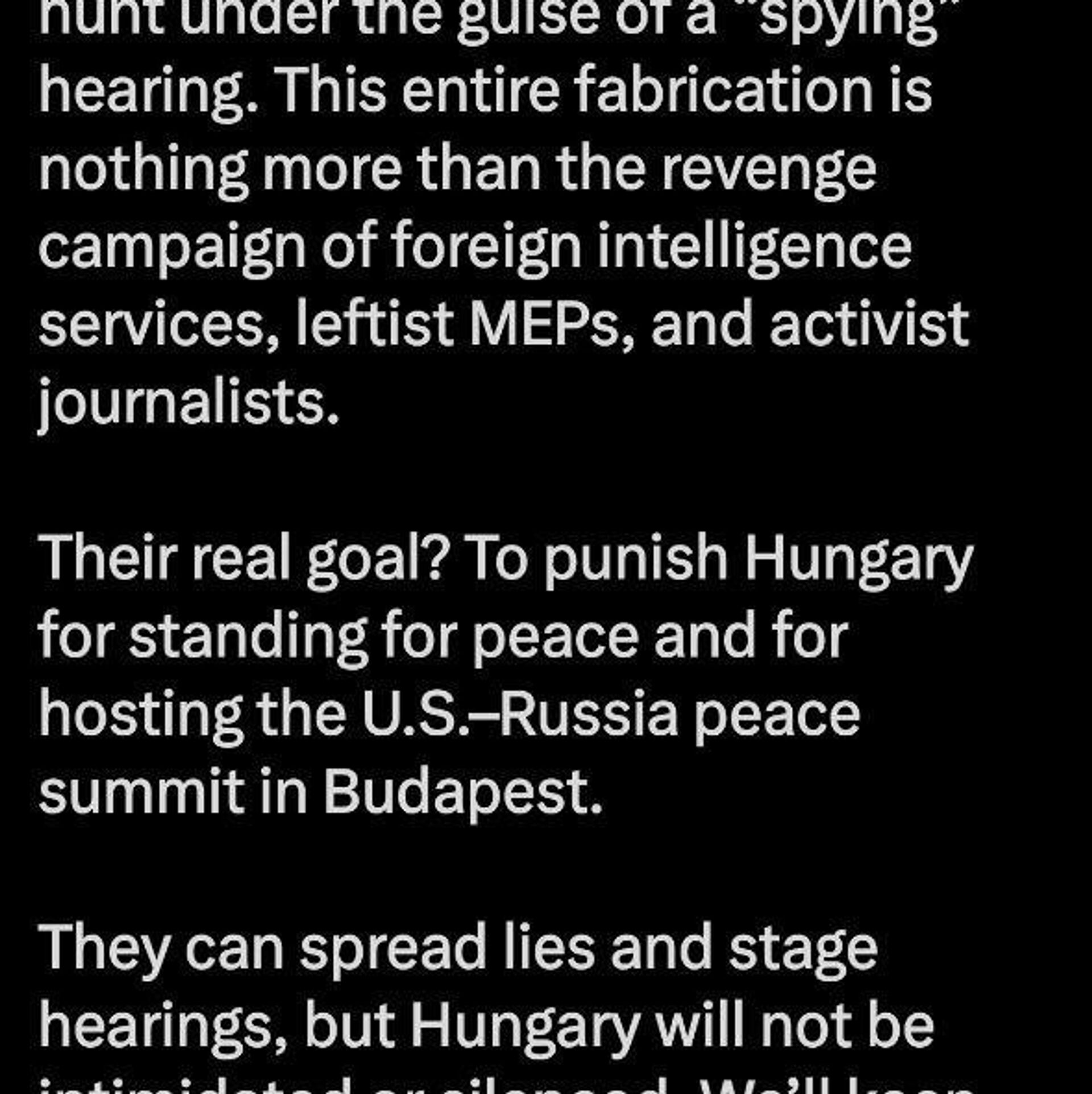 «این شرمآور است که بروکسل عملیات شکار اشباح سیاسی دیگری تحت پوشش جلسات درباره «جاسوسی» را ترتیب میدهد. تمام این جعلیات چیزی جز انتقامگیری سازمانهای اطلاعاتی خارجی، نمایندگان چپگرای پارلمان اروپا و روزنامهنگاران فعال نیست.هدف واقعی آنها؟ مجازات مجارستان به دلیل تعهدش به صلح و میزبانی اجلاس صلح روسیه و آمریکا در بوداپست.