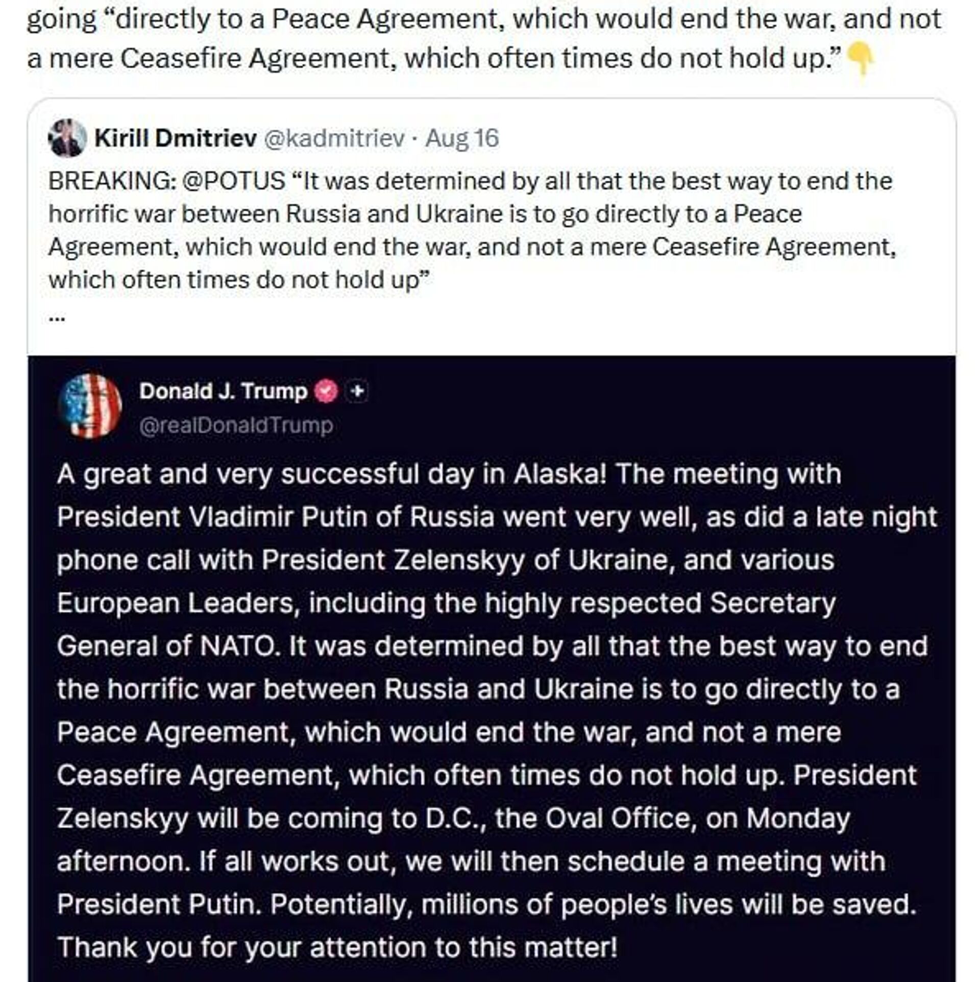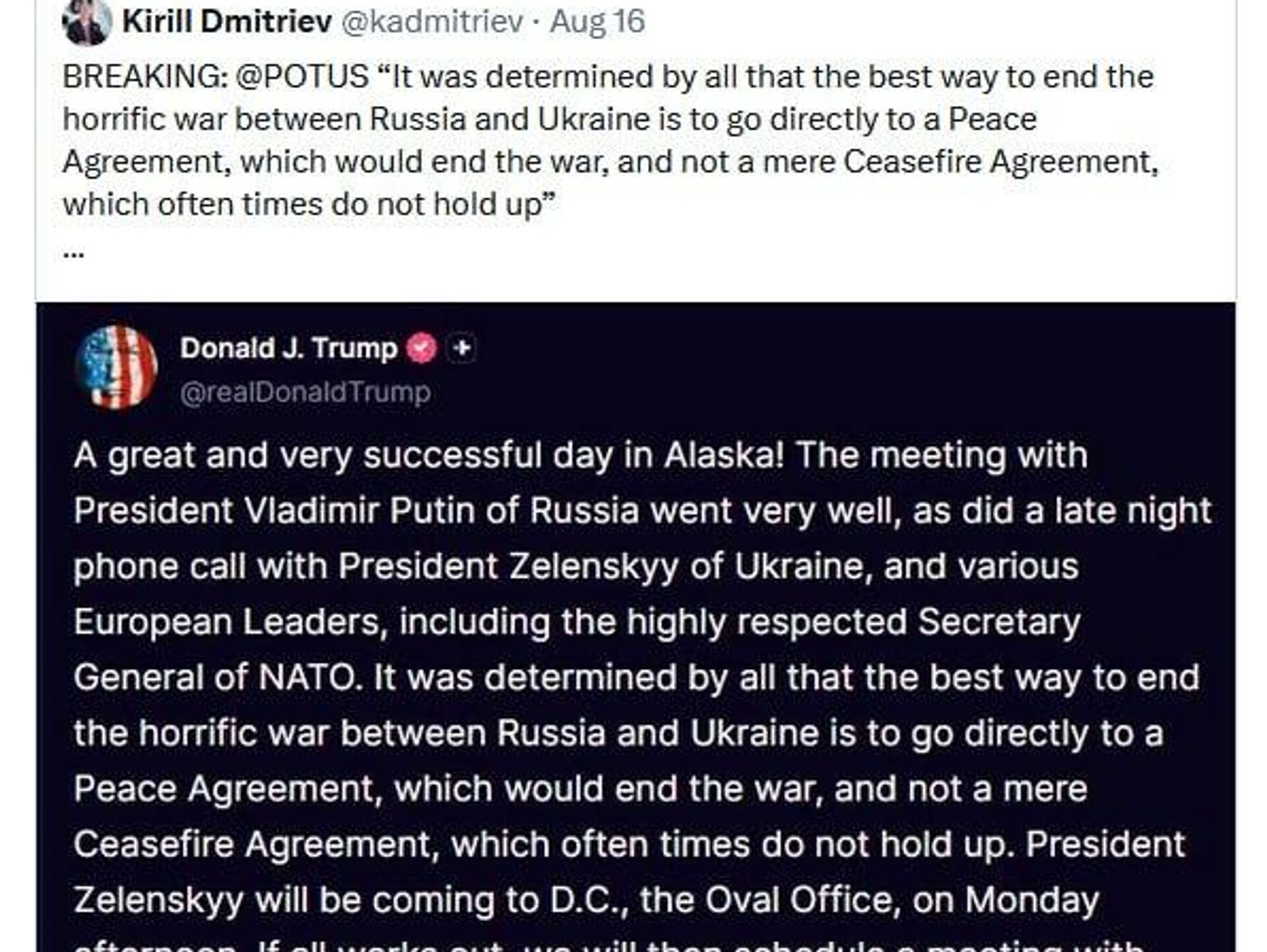 کریل دمیتریف، رئیس صندوق سرمایهگذاری مستقیم روسیه، در شبکه ایکس به این نکته اشاره کرد که یکی از نتایج کلیدی اجلاس آلاسکا، درخواست دونالد ترامپ برای «رسیدن مستقیم به یک توافق صلح، نه فقط آتشبس، که اغلب رعایت نمیشود» بود.