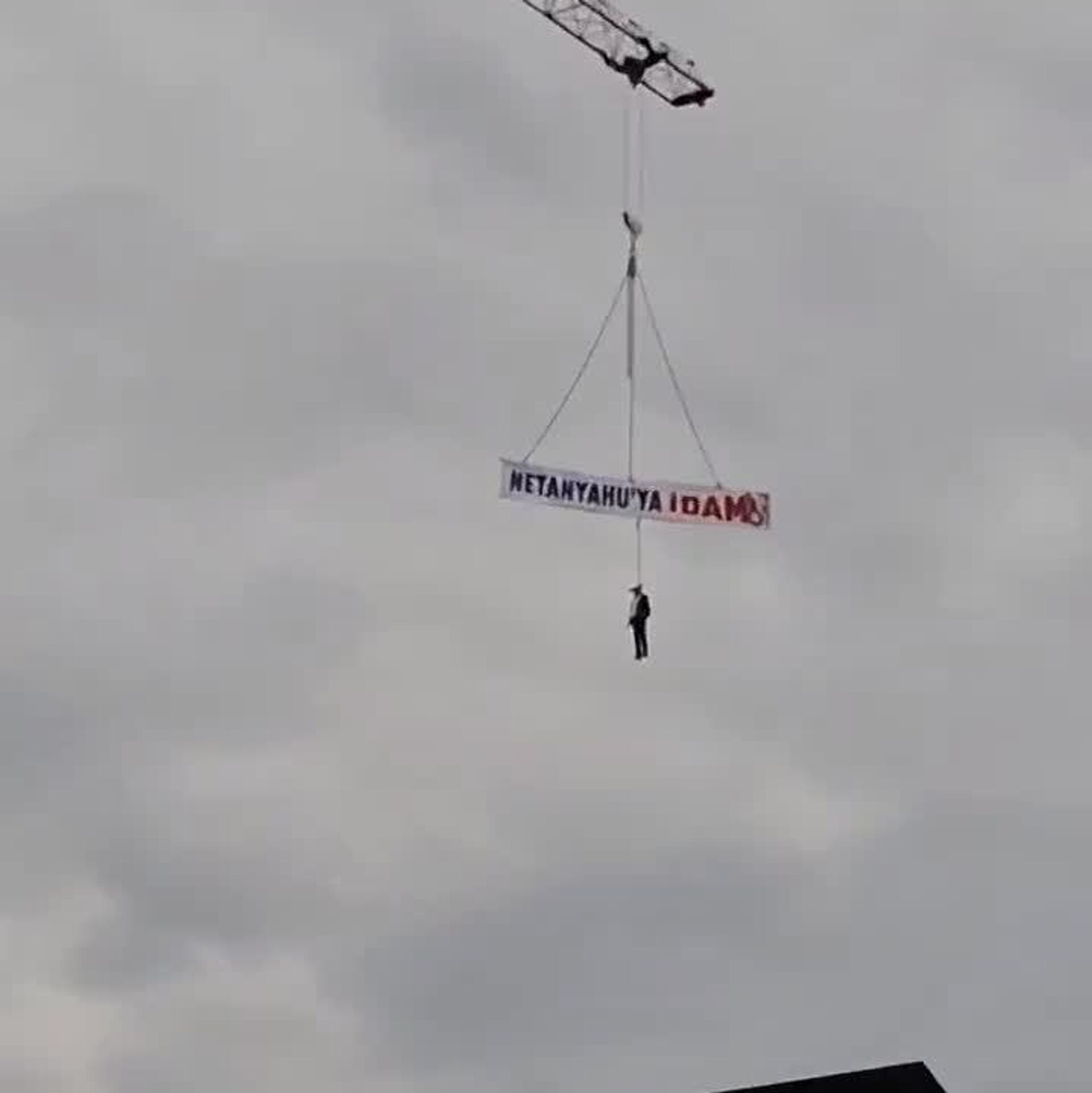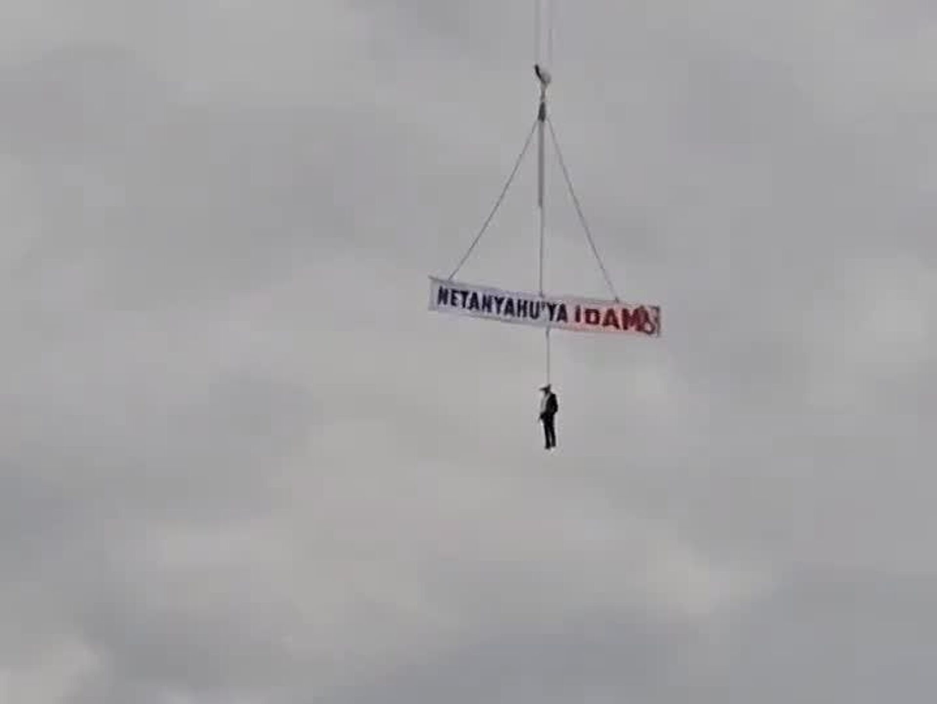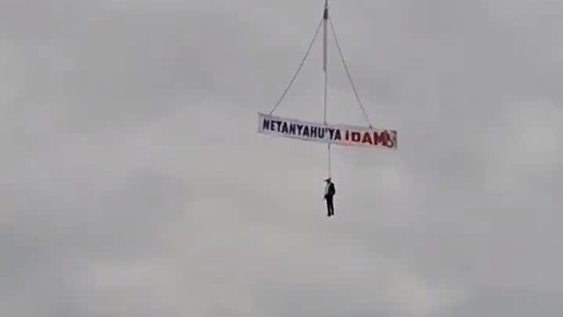 بنری با نوشته «مرگ بر نتانیاهو»به همراه ماکت بنیامین نتانیاهو، نخست وزیر اسرائیل، که دار زده شده روی یک جرثقیل در یک محل ساخت و ساز در شهر ترابزون ترکیه مشاهده شد.