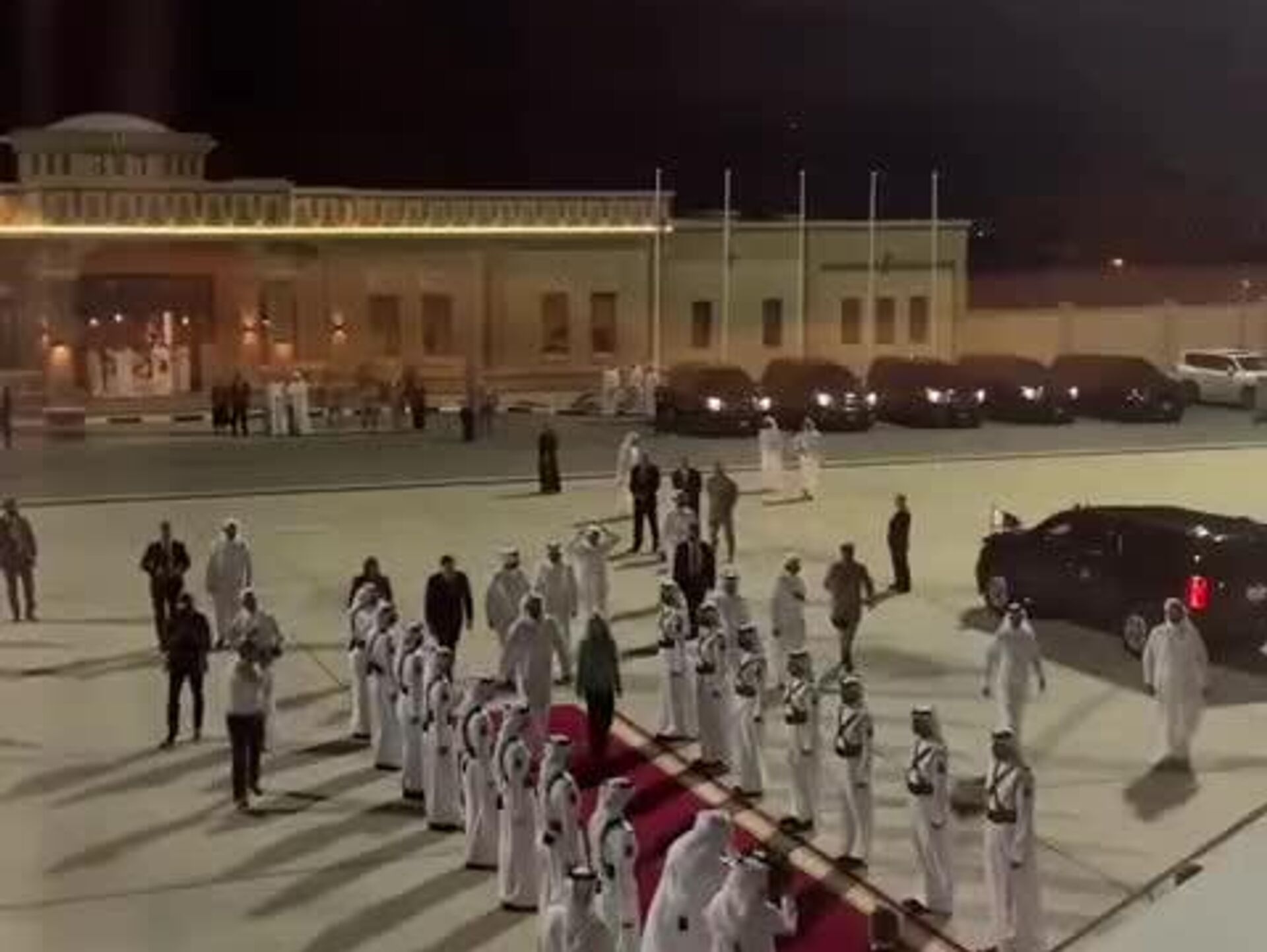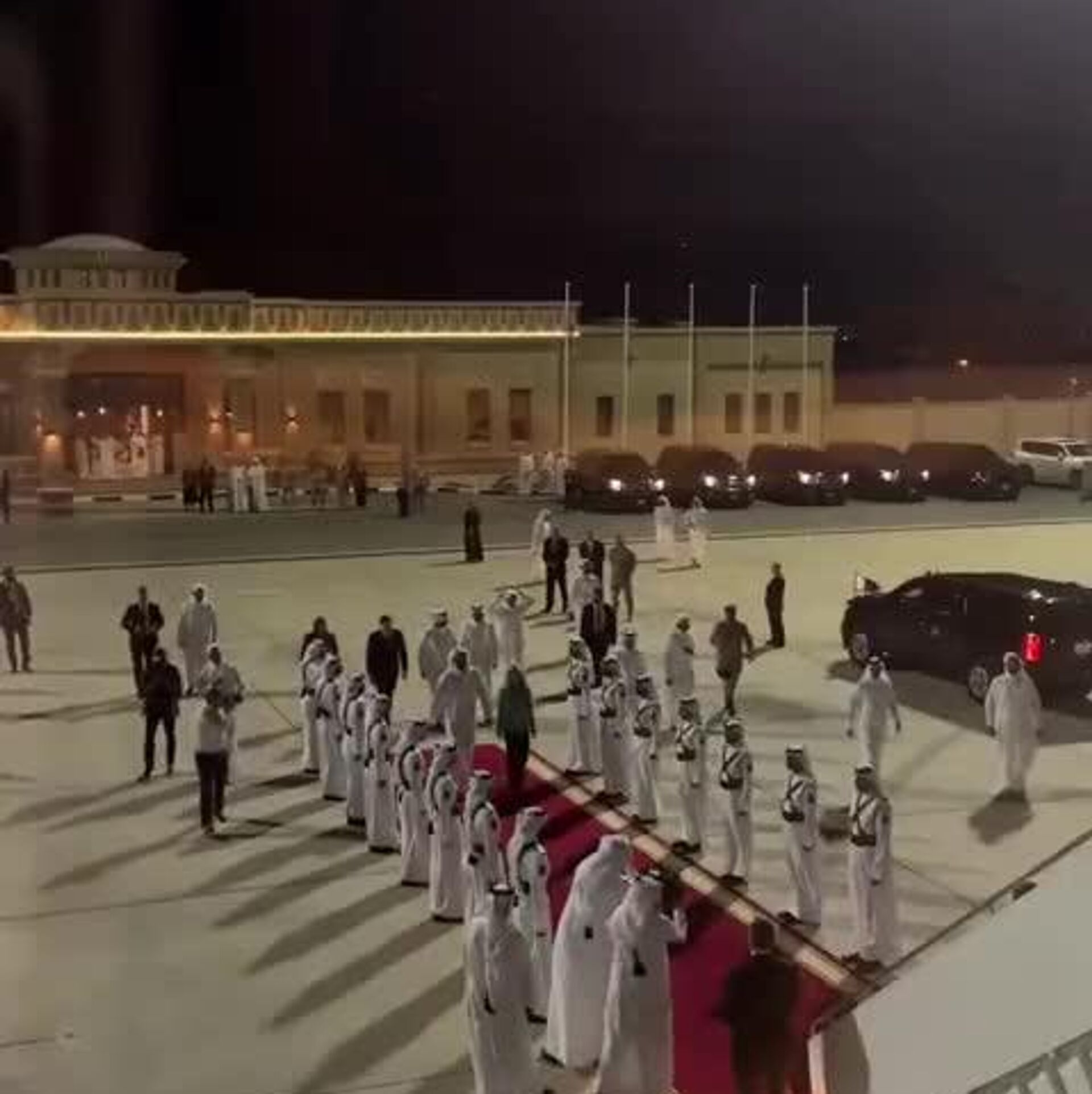 ترامپ پیش از سوار شدن به هواپیمای ویژه ریاست جمهوری، با فرش قرمز و تشریفات کامل مورد استقبال شیخ تمیم بن حمد آل ثانی، امیر قطر، قرار گرفت