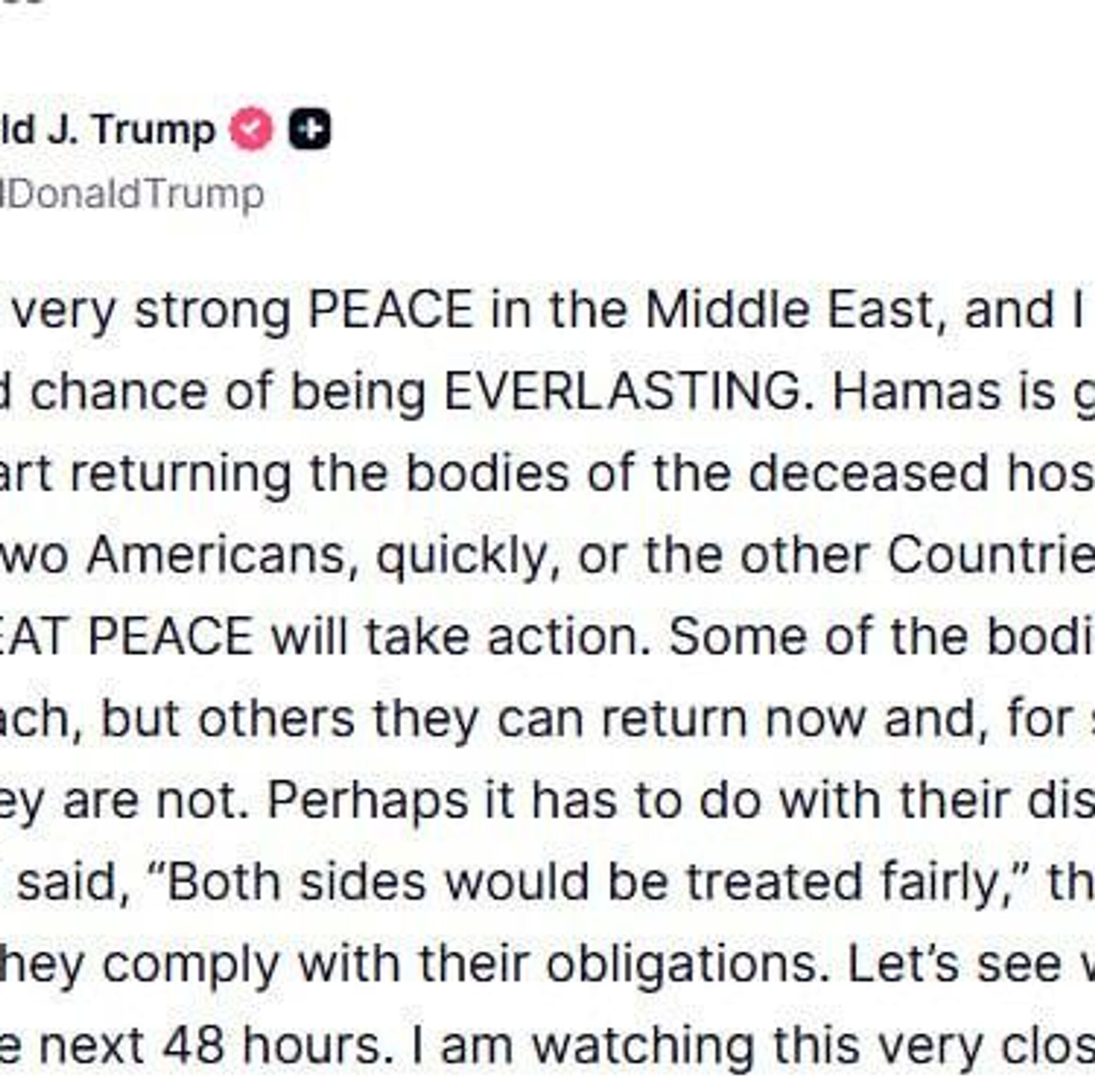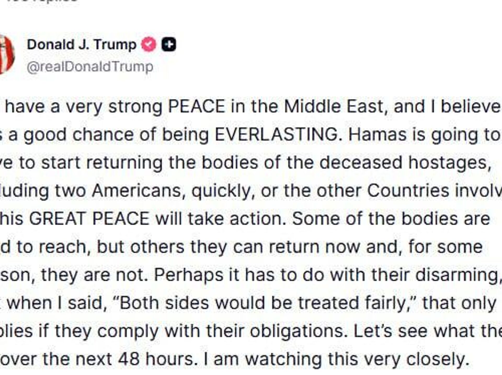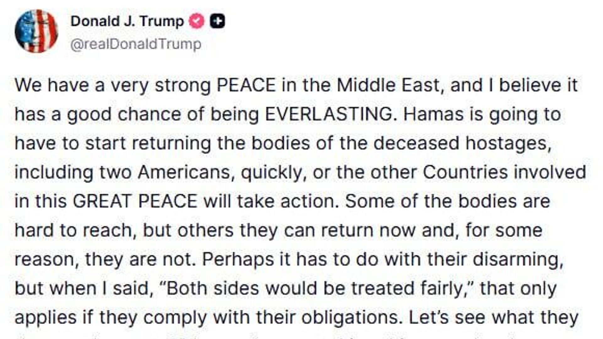 وی در شبکه اجتماعی خود موسوم به «تروث سوشال» نوشت: «حماس باید به سرعت بازگرداندن اجساد گروگانهای فوتشده، از جمله دو آمریکایی، را آغاز کند، در غیر این صورت سایر کشورهای دخیل در این صلح بزرگ اقدام خواهند کرد.»
