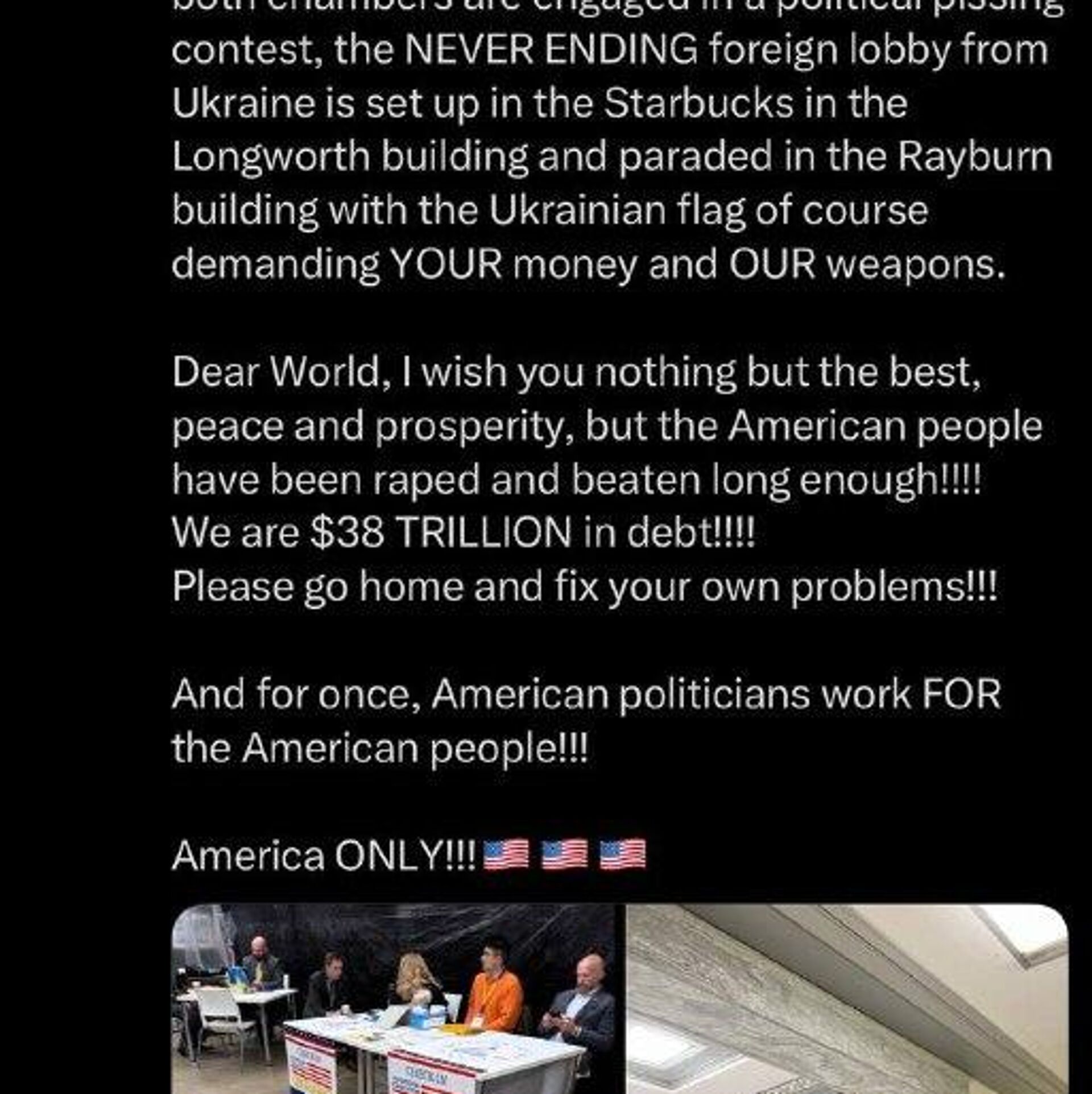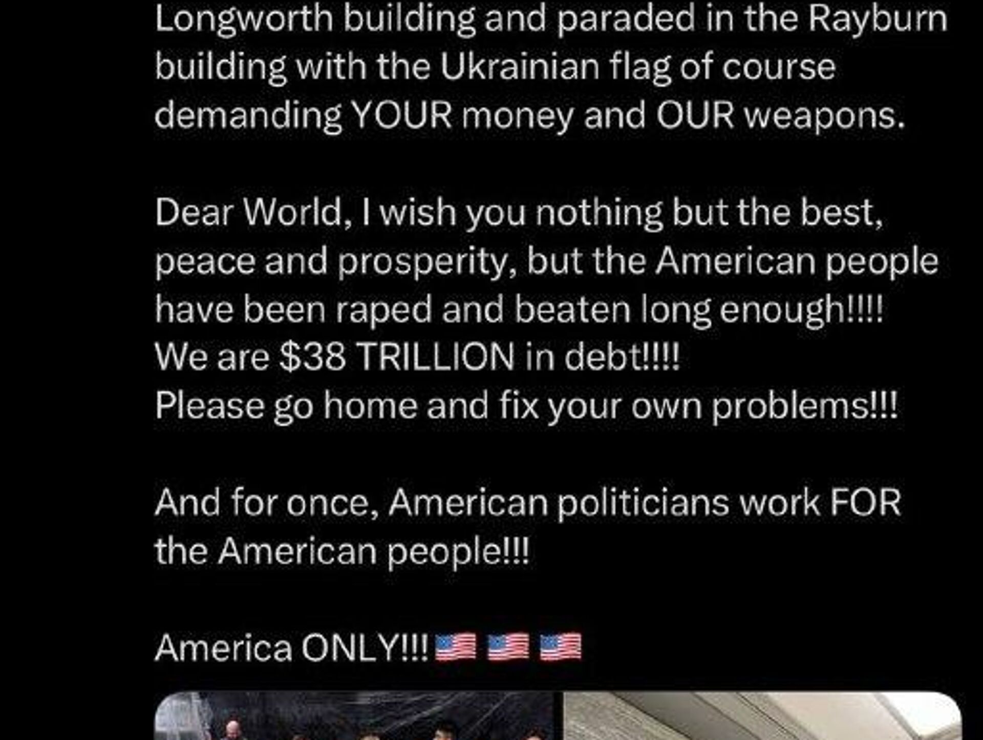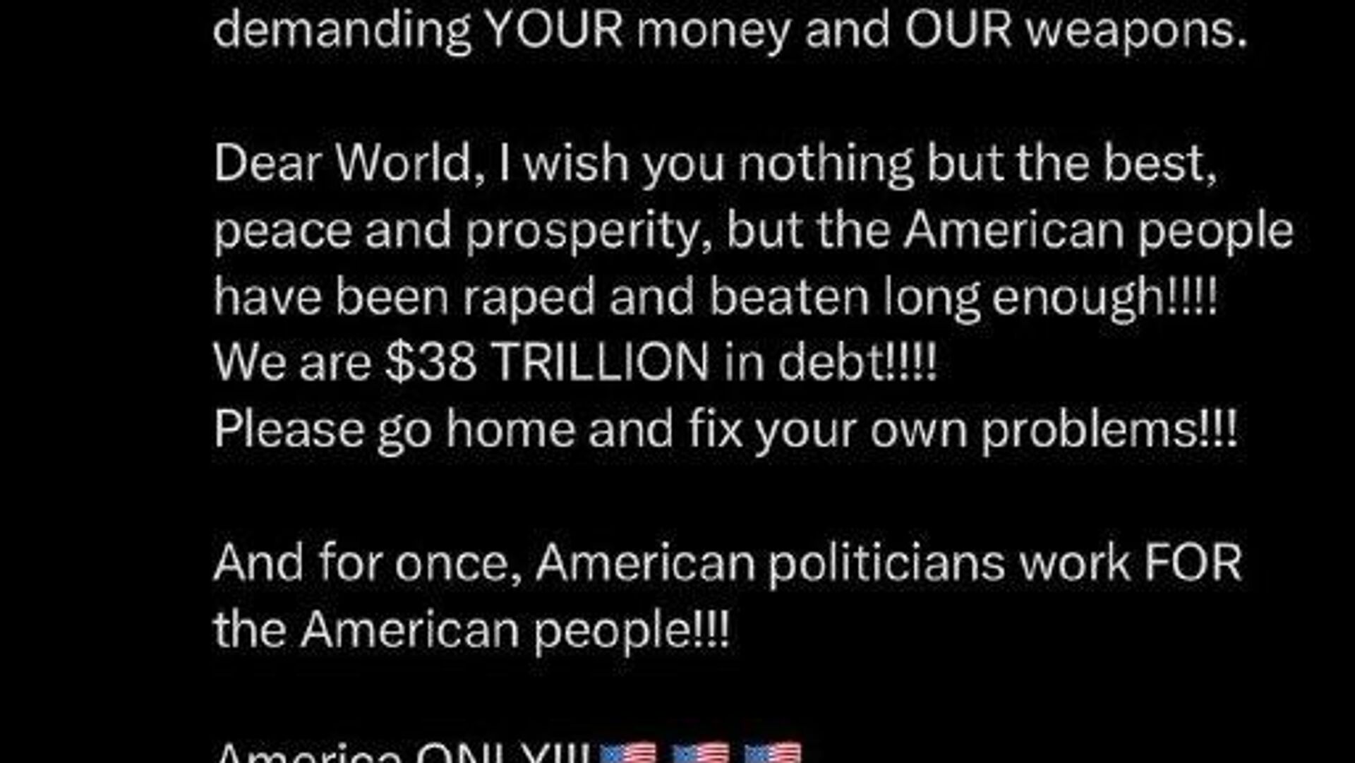 ▫این نماینده حزب جمهوریخواه آمریکا خاطرنشان کرد که ایالات متحده مشکلات داخلی خود را دارد: بدهی ملی عظیم 38 تریلیون دلاری و تعطیلی دولت.