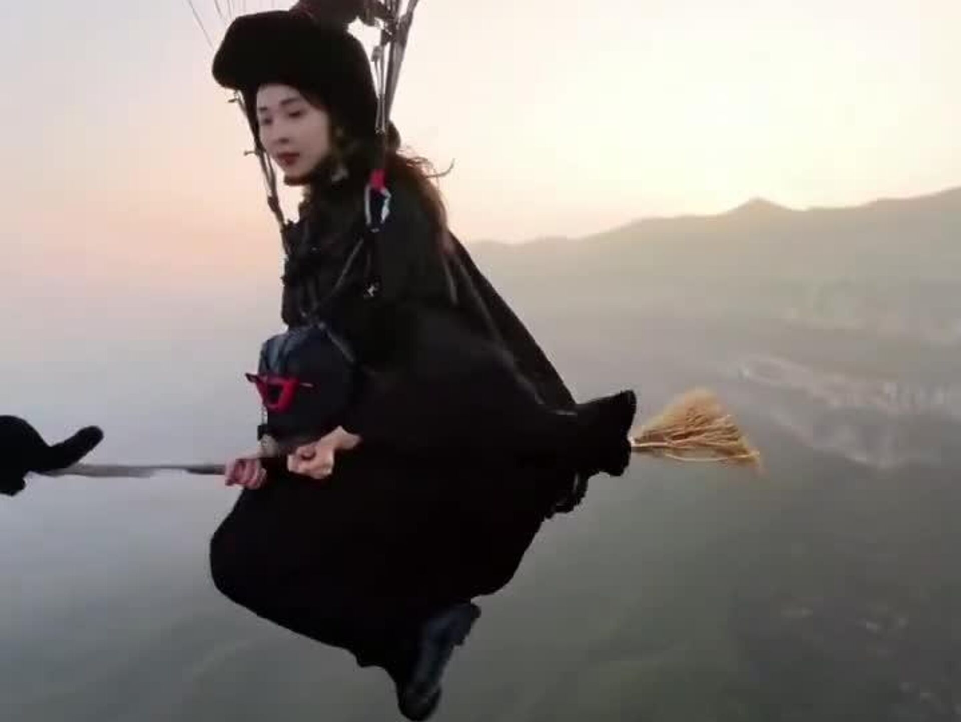 دختر چینی با جاروی مخصوص در روز هالووین به پرواز درآمد