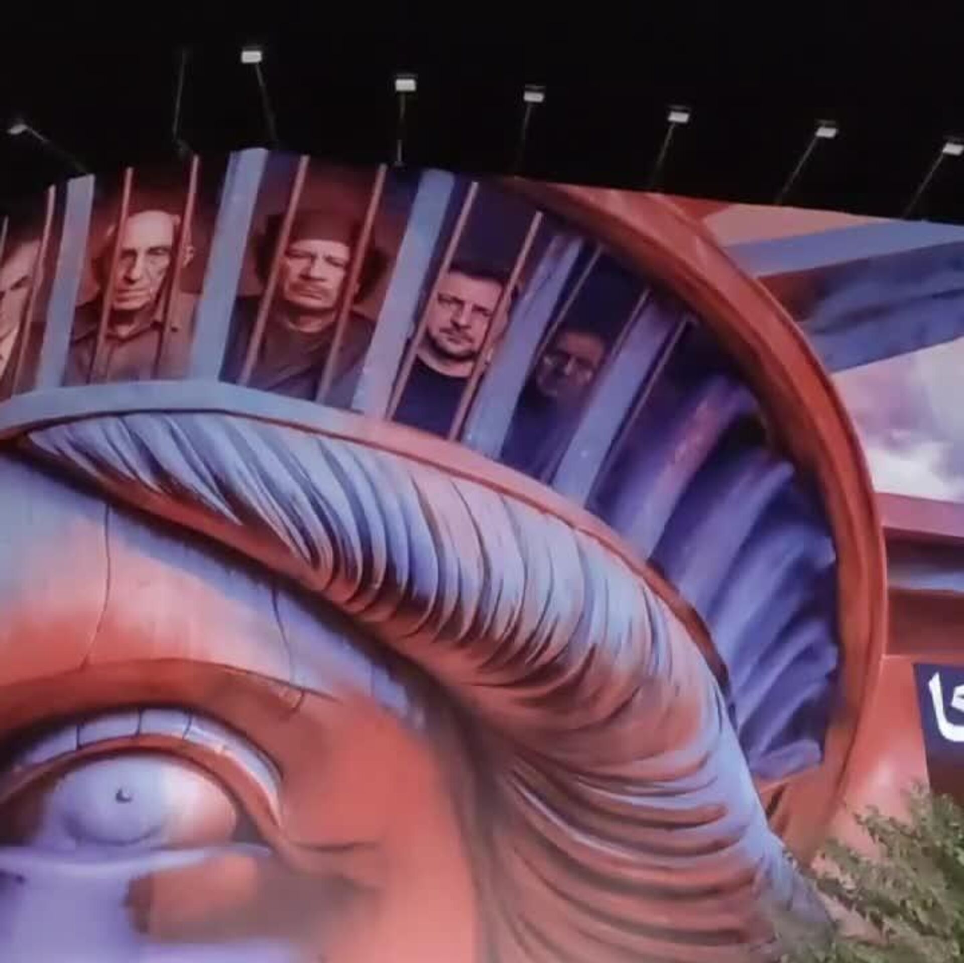 ◻این پوستر سر مجسمه آزادی را به تصویر میکشد و پرترههایی از دولتمردانی که به نحوی از انحاء توسط ایالات متحده رنج کشیدهاند، در تاج آن قرار گرفته است.