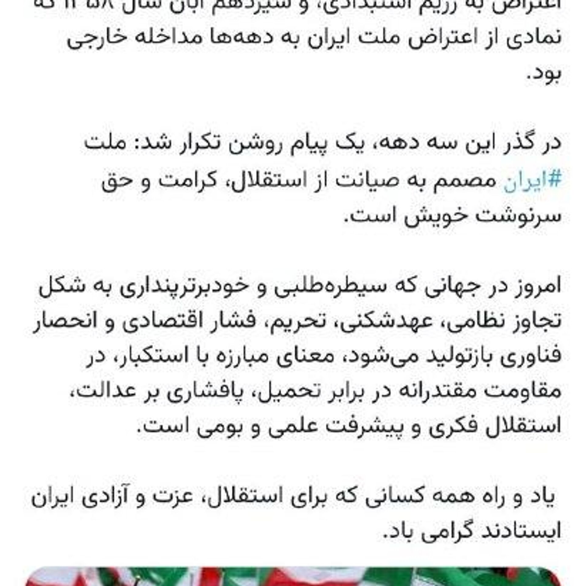 ▫سخنگوی وزارت امور خارجه ایران در پیامی در شبکه ایکس به مناسبت سیزدهم آبان نوشت: