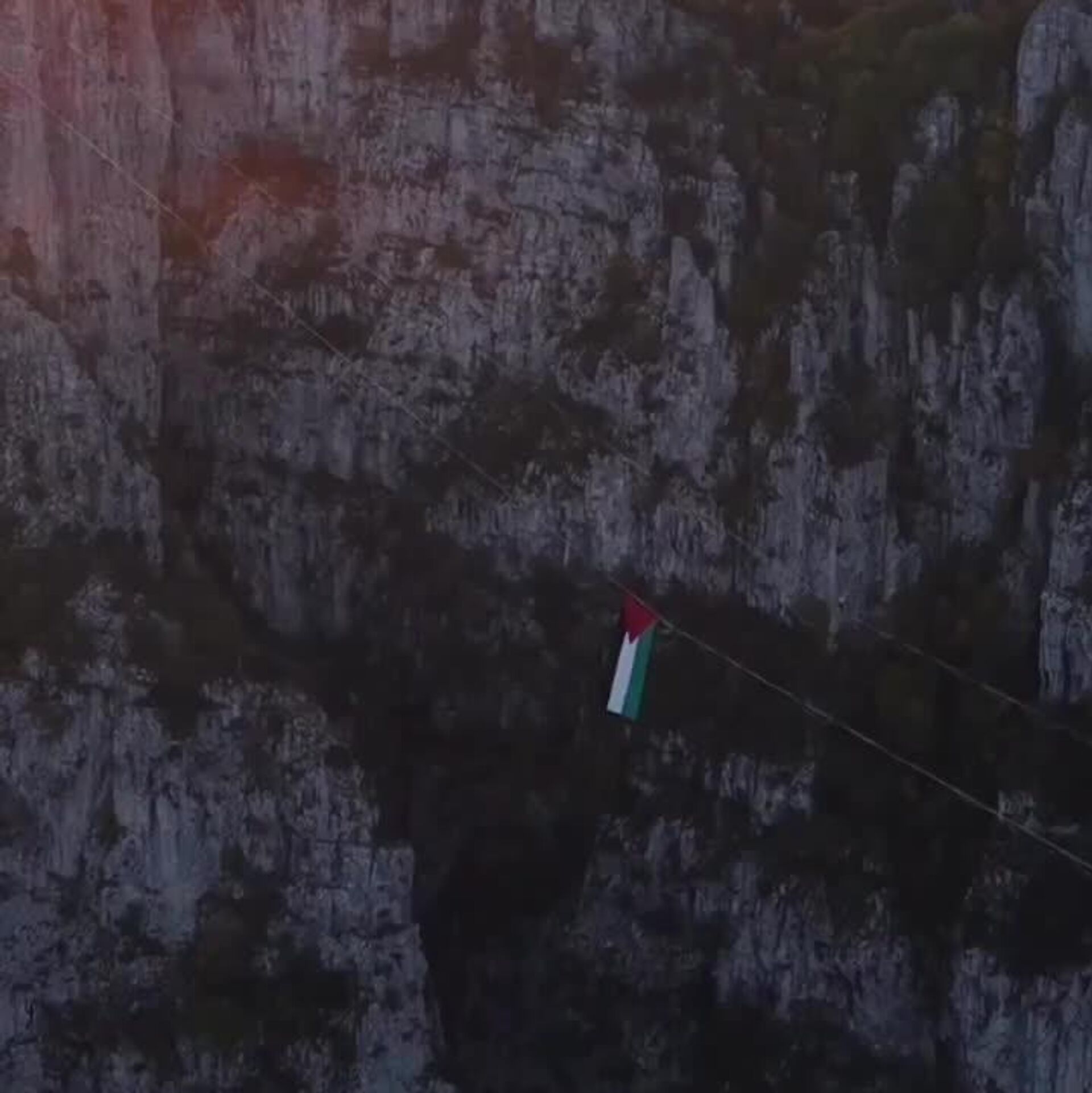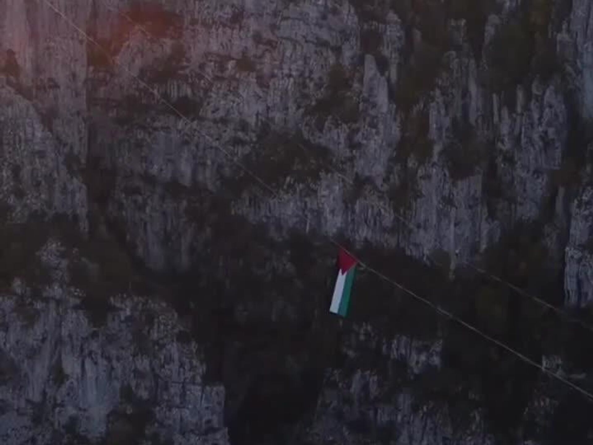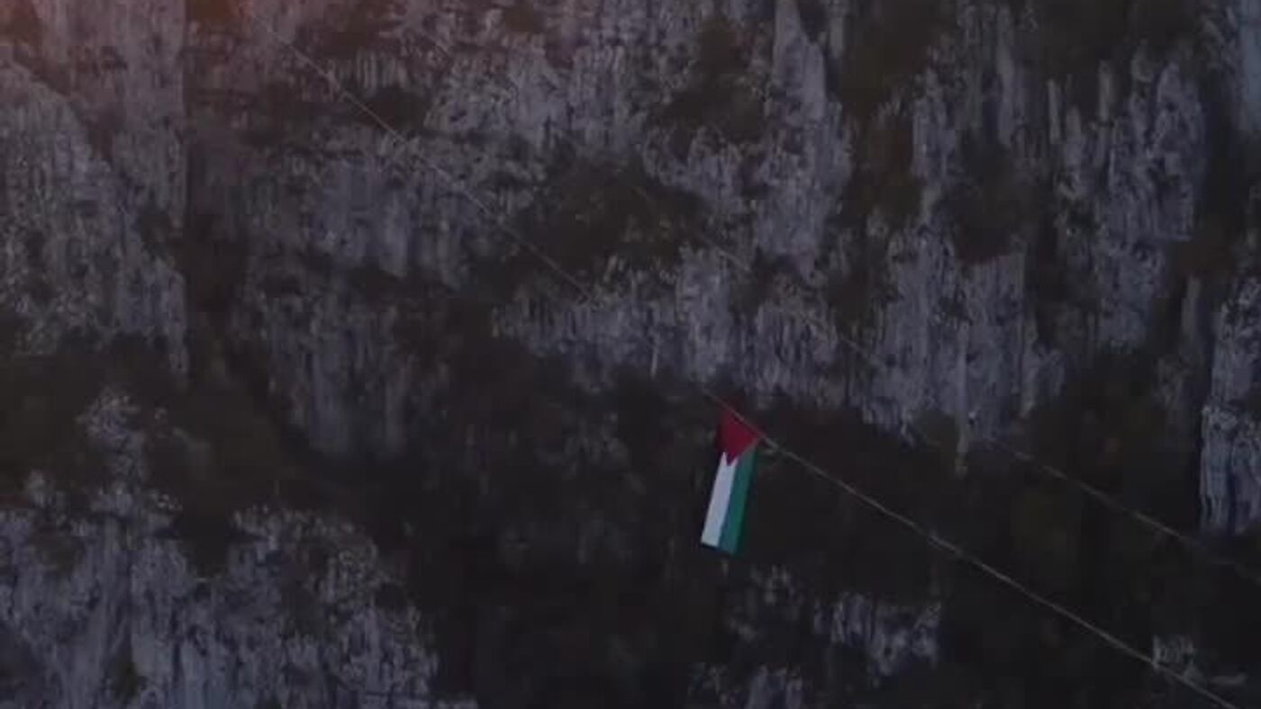 دو نفر در حالی که پرچم فلسطین به نشانه همبستگی با مردم فلسطین در میان آنها در اهتزاز بود، در ارتفاع 850 متری از میان تنگه ویکوس در یونان به طول یک کیلومتر پیادهروی کردند