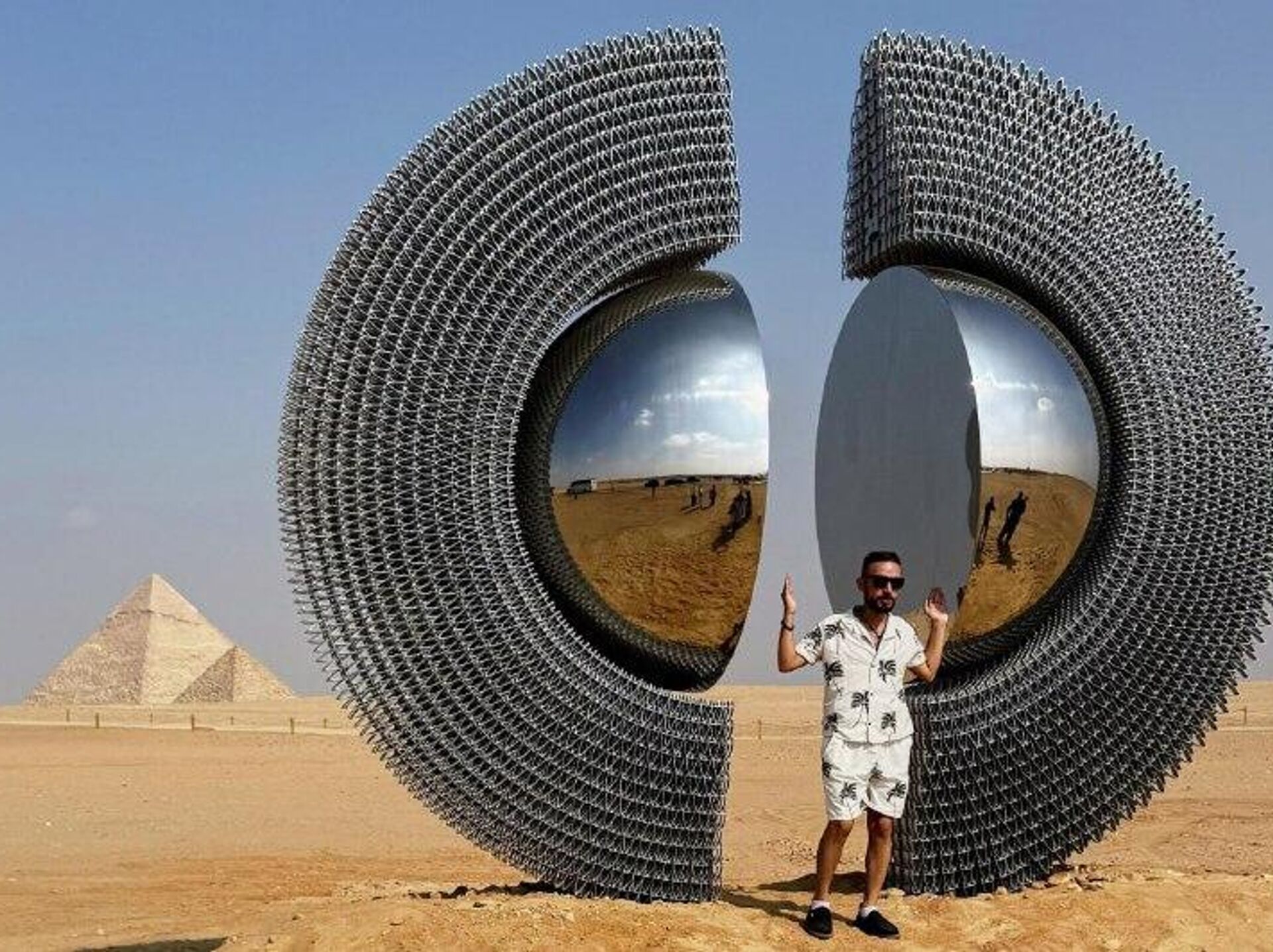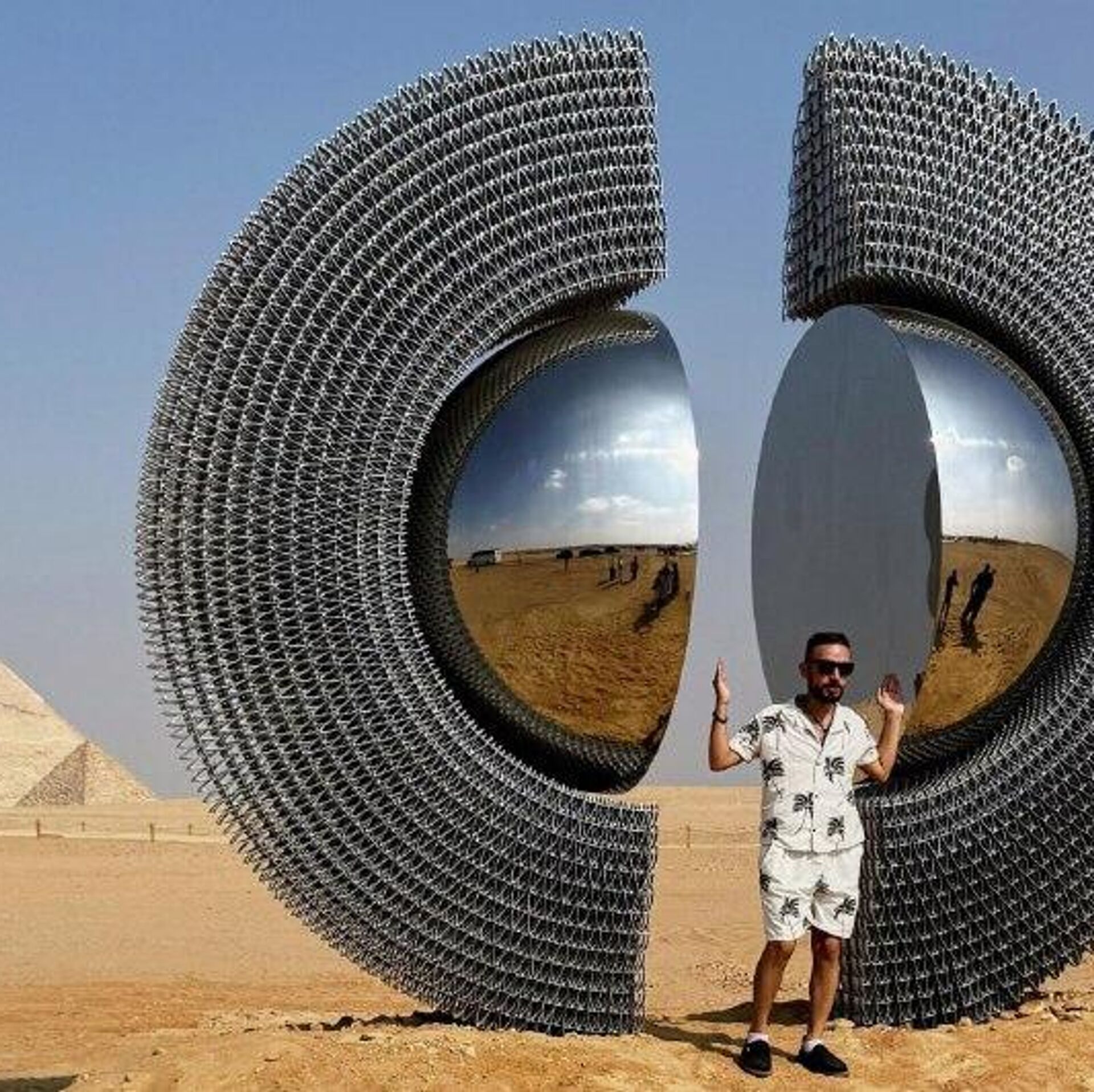 8 - یک بازدیدکننده در کنار اثر هنری «شن» اثر هنرمند ترک، مرت آقا کوسه، در پنجمین نمایشگاه هنر معاصر «همیشه همین حالا است» در جیزه ژست گرفته است