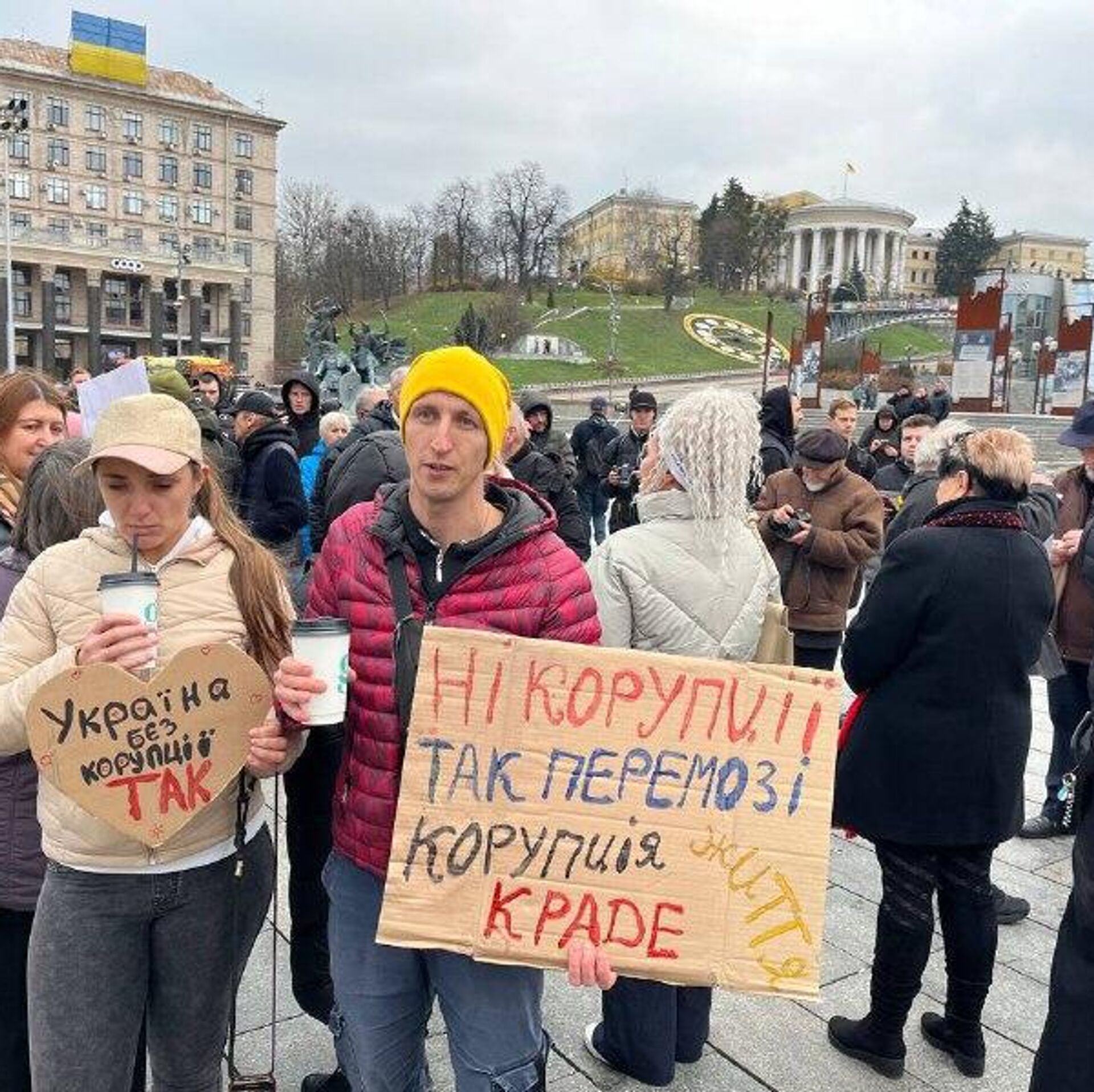 شرکتکنندگان پلاکاردهایی با عنوان «زلنسکی یک جنایتکار است» و «نه به فساد» در دست داشتند. ماریا باراباش، سازماندهنده این تجمع، اظهار داشت که آنها خواستار استرداد میندیچ به اوکراین و استعفای یرماک از سمت رئیس دفتر زلنسکی هستند و او را «رهبر طرحهای فساد» مینامند.
