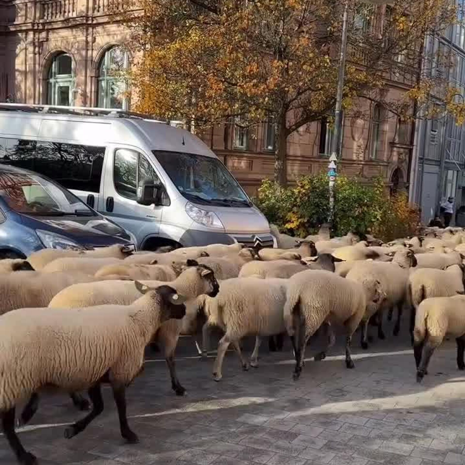 15:59 16.11.2025 (بروز رسانی شده: 16:00 16.11.2025) منظرهای غیرمعمول از حرکت منظم گله گوسفندان در مرکز شهر نورنبرگ