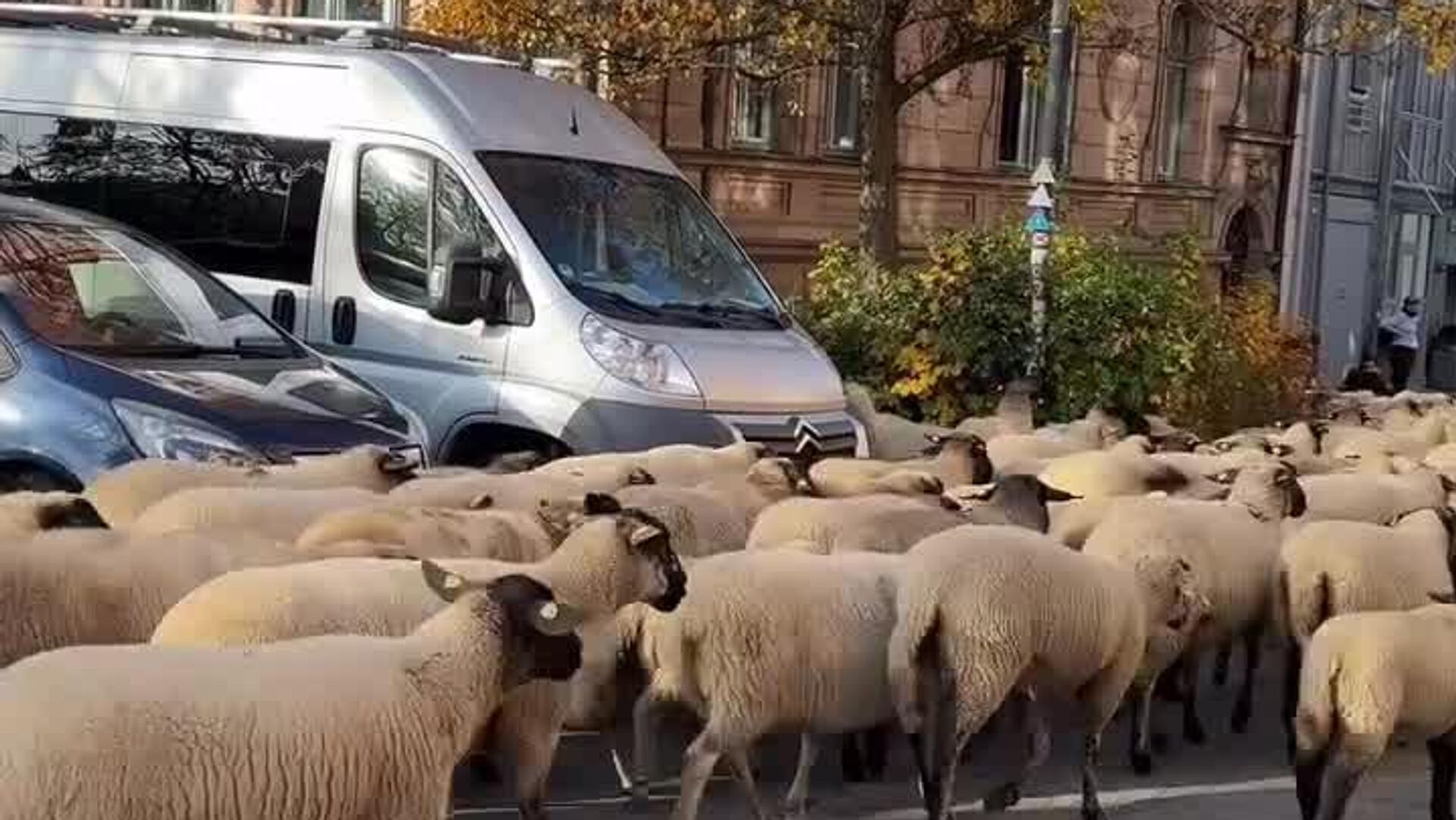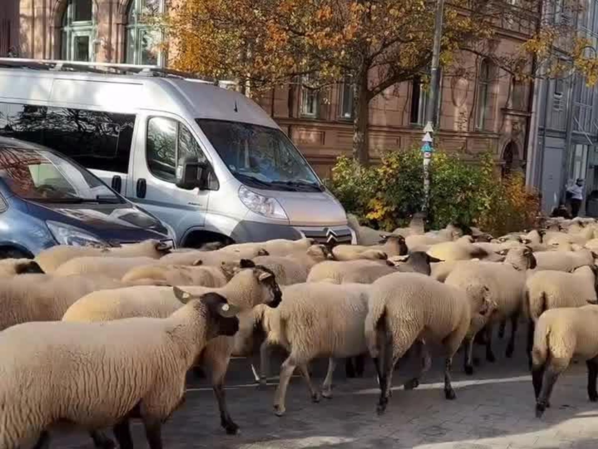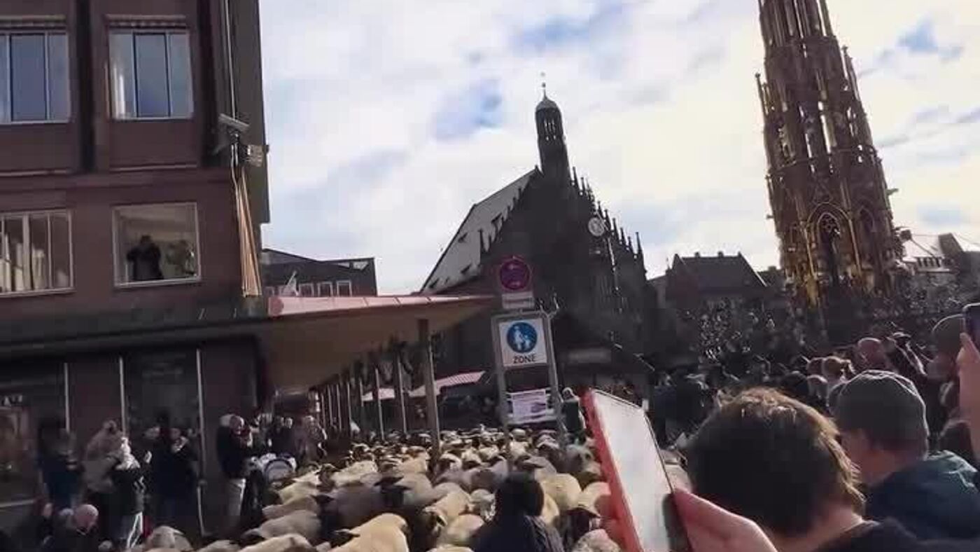 منظرهای غیرمعمول از حرکت منظم گله گوسفندان در مرکز شهر نورنبرگ