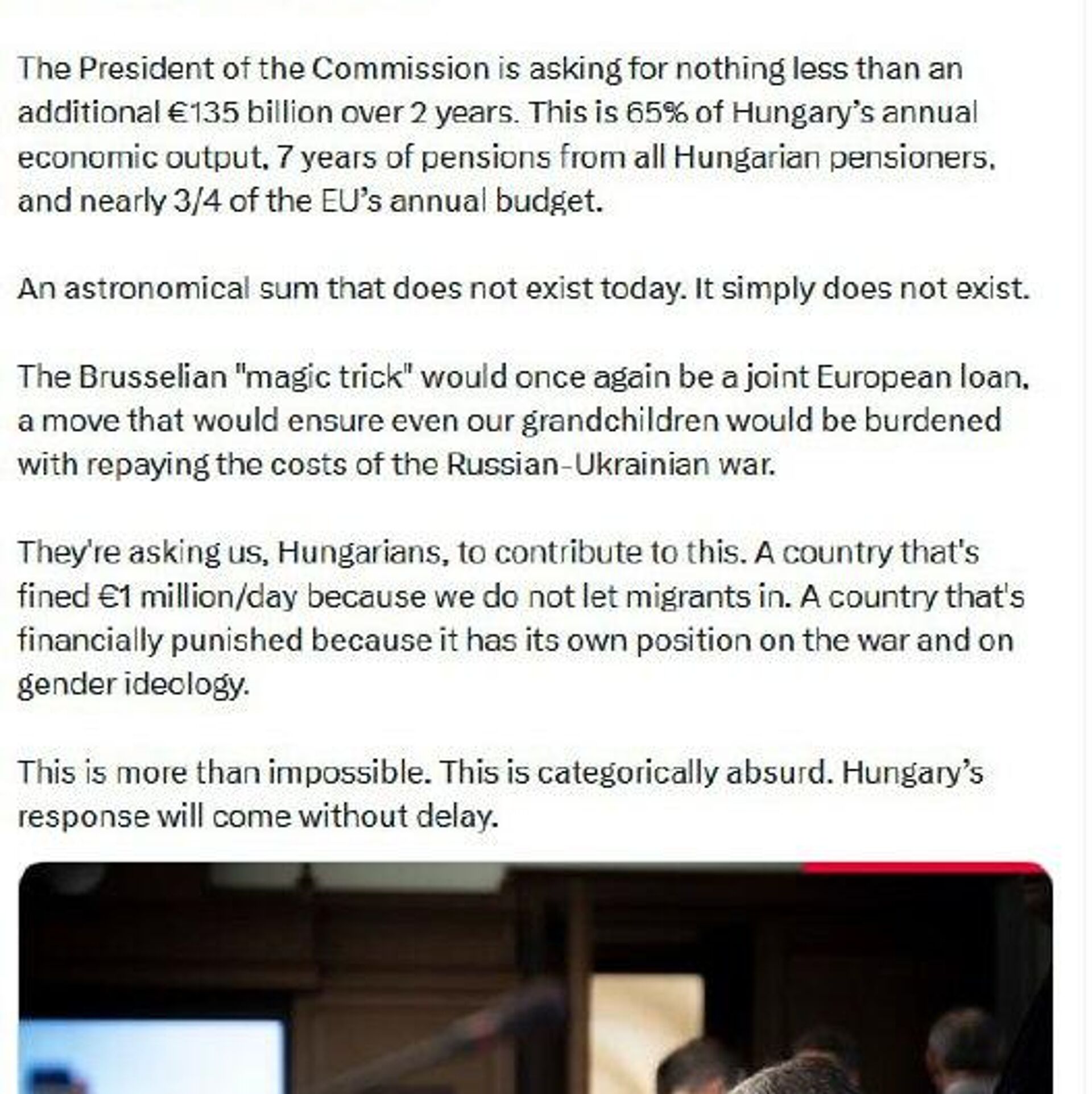 ویکتور اوربان، نخست وزیر مجارستان، در شبکه ایکس نوشت: «رئیس کمیسیون چیزی کمتر از 135 میلیارد یورو [157میلیارد دلار] اضافی طی 2 سال درخواست نمیکند. این مبلغ 65 درصد از تولید اقتصادی سالانه مجارستان، 7 سال حقوق بازنشستگی همه مستمریبگیران مجارستانی و تقریباً سه چهارم بودجه سالانه اتحادیه اروپا است.»