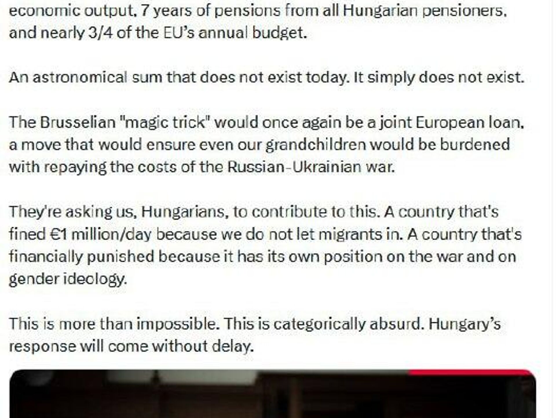 ▫او هشدار داد که این «ترفند جادویی» اتحادیه اروپا «بار دیگر یک وام مشترک اروپایی خواهد بود، اقدامی که تضمین میکند حتی نوههای ما نیز بار بازپرداخت هزینههای» درگیری اوکراین را به دوش خواهند کشید.