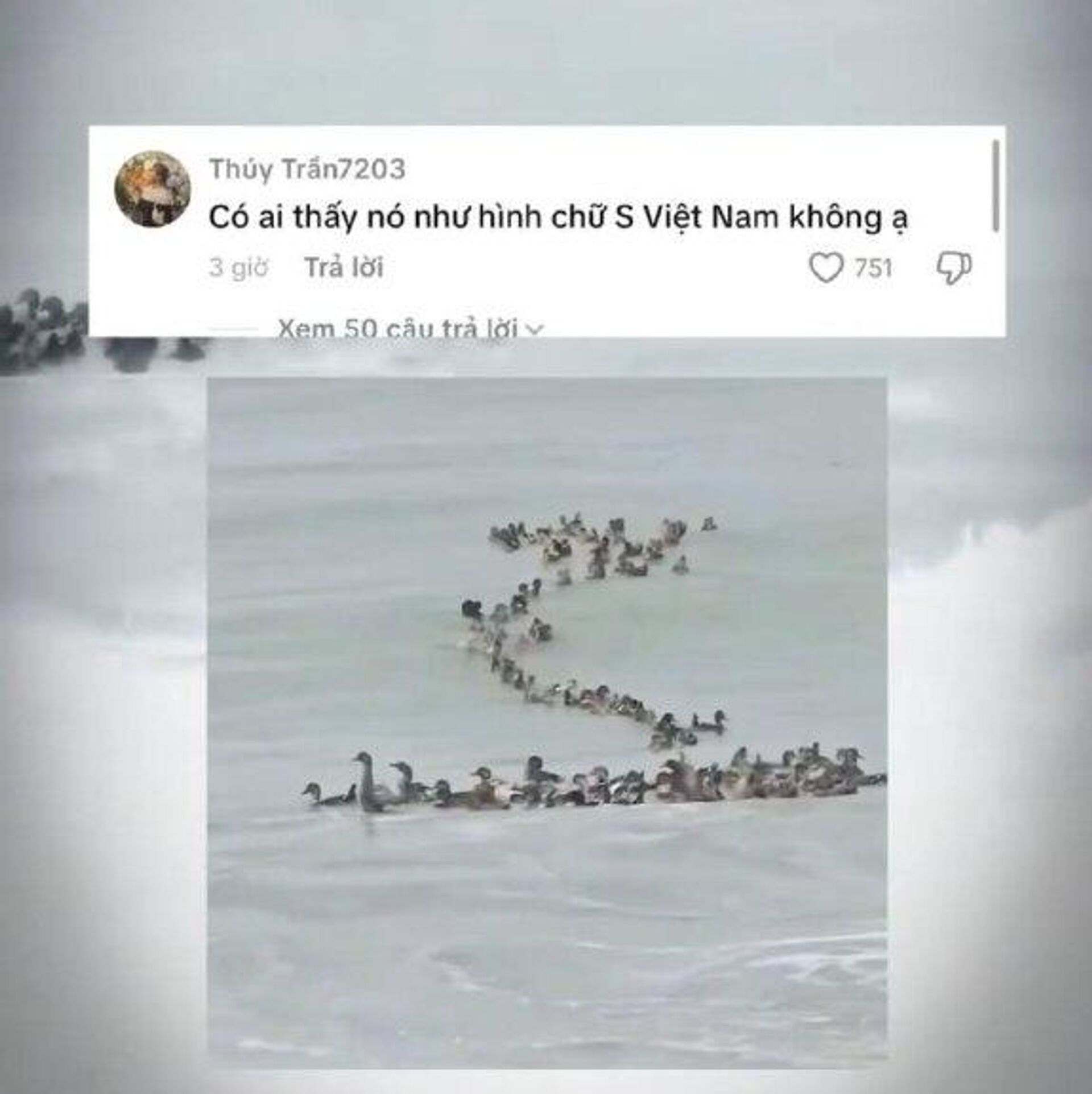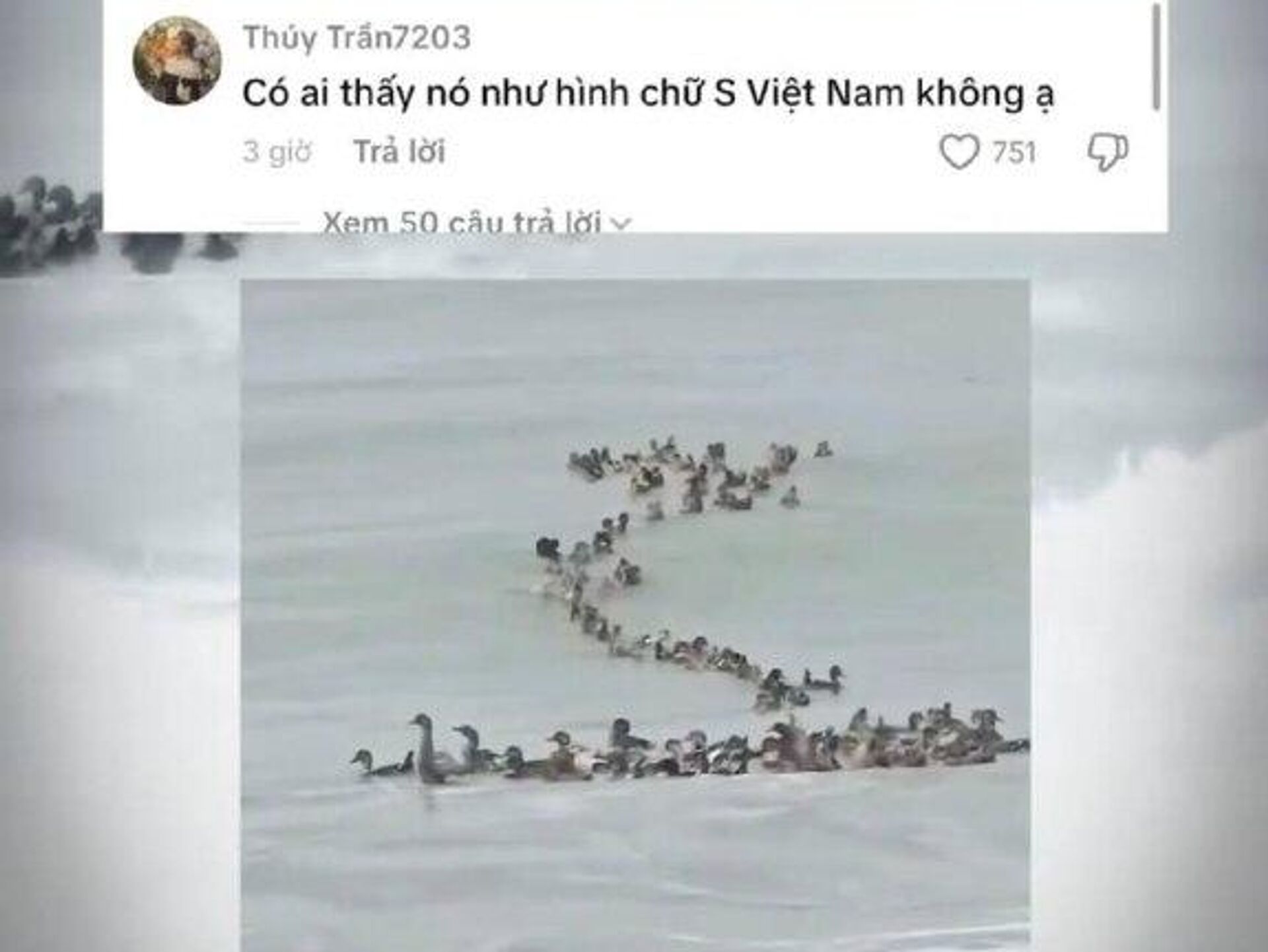 کاربران متوجه یک نکته غیرمعمول شدند: با وجود امواج قوی، به نظر میرسید اردکها به شکلی شبیه حرف S - که نماد ویتنام روی نقشه است - در یک خط قرار گرفتهاند.