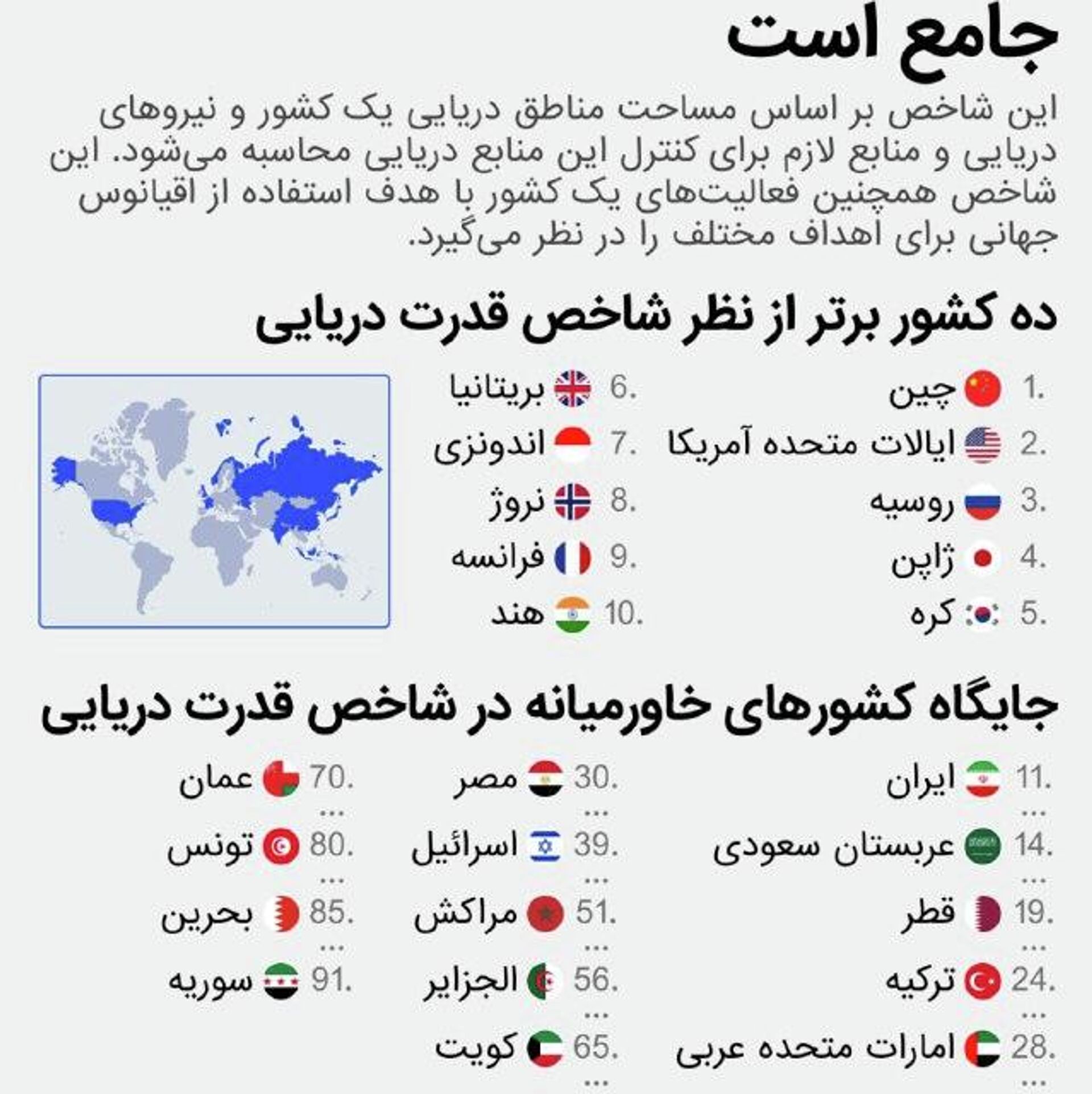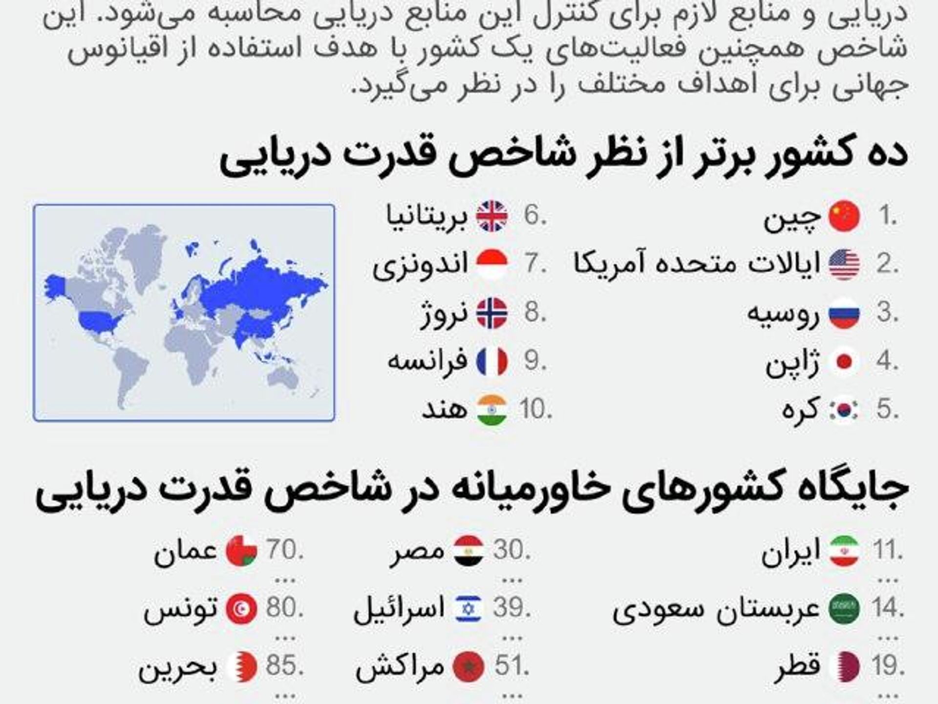 پژوهشگران روسیه شاخص قدرت دریایی (MPI) را برای 100 کشور محاسبه کردند و پتانسیل ترکیبی نیروی دریایی، کشتیسازی، لجستیک و اقتصادی آنها را ارزیابی کردند. این گزارش تأیید میکند که روسیه با سهم 6.6% جایگاه خود را به عنوان سومین قدرت دریایی بزرگ جهان حفظ میکند، در حالی که ده کشور برتر در مجموع تقریباً 60%از پتانسیل دریایی جهان را در اختیار دارند.