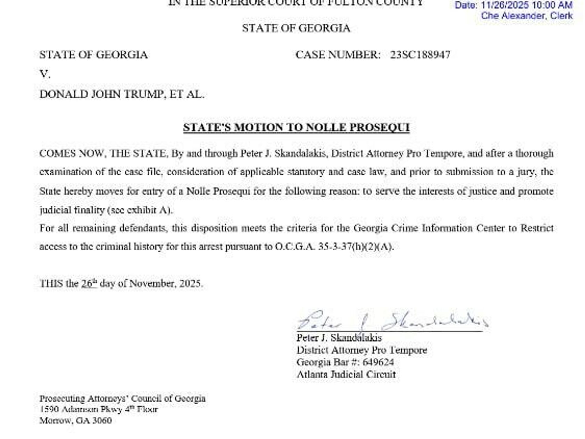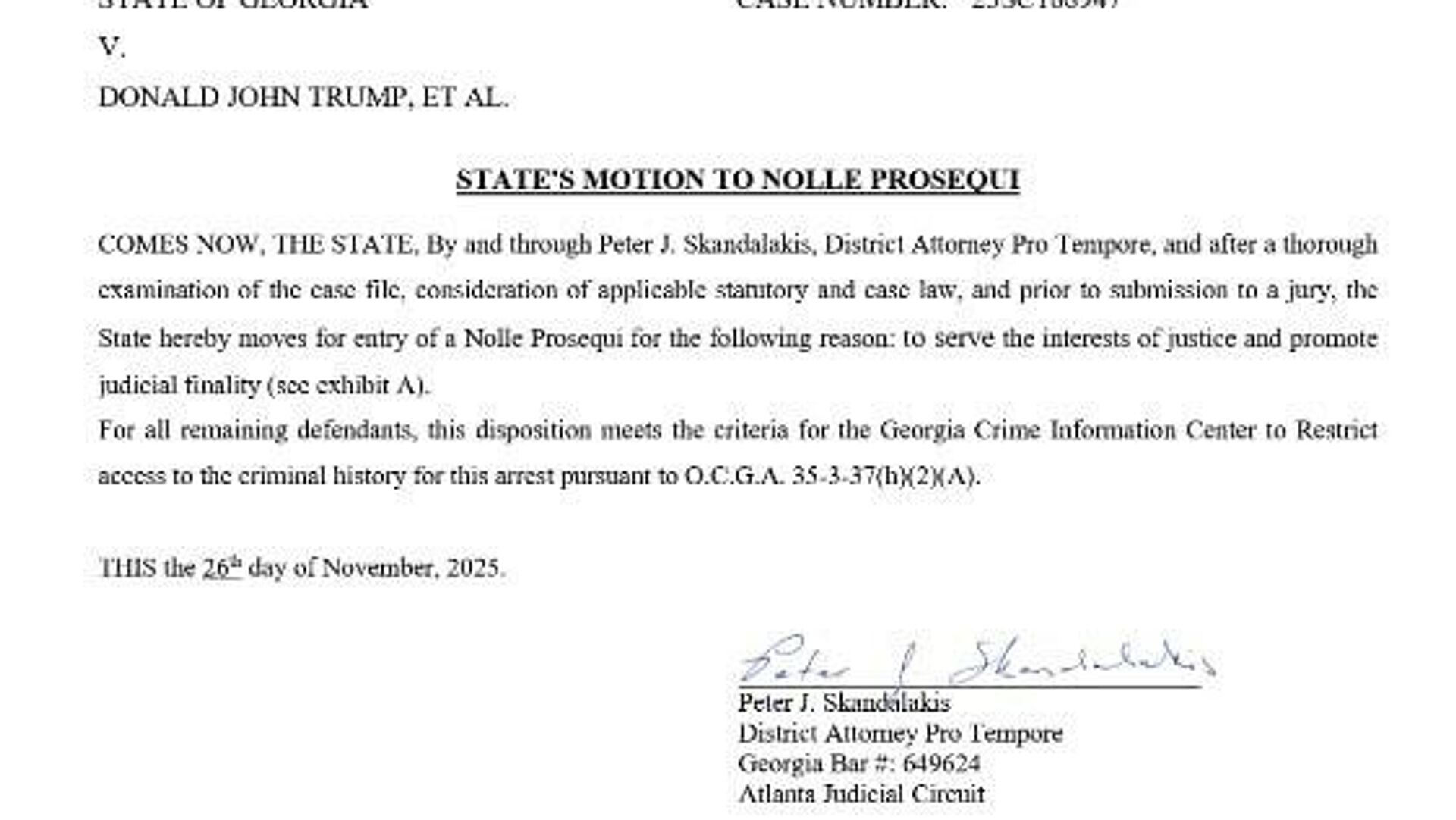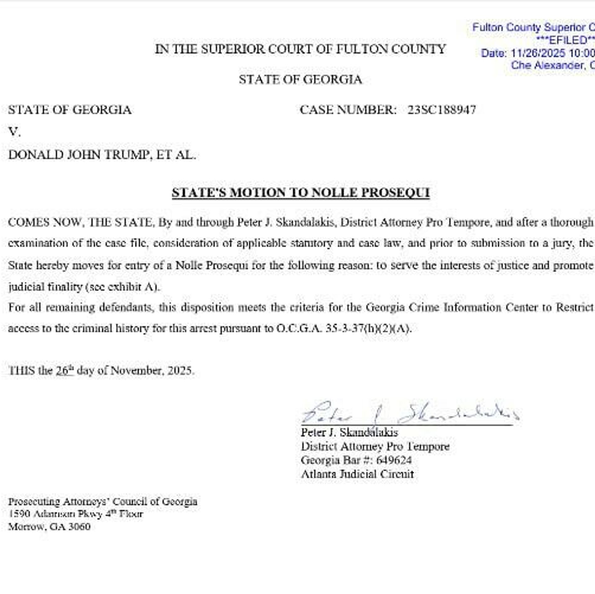 اسکاندالاکیس کمتر از دو هفته پیش، پس از آنکه فانی ویلیس، دادستان ناحیه شهرستان فولتون، در ماه دسامبر رد صلاحیت شد و چندین دادستان دیگر از پذیرش مسئولیت او خودداری کردند، مسئولیت این پرونده را بر عهده گرفت.