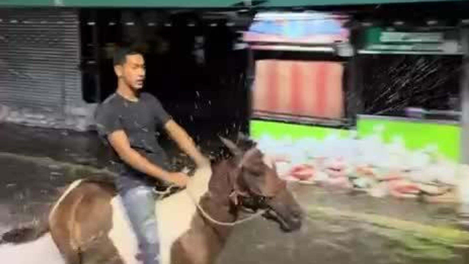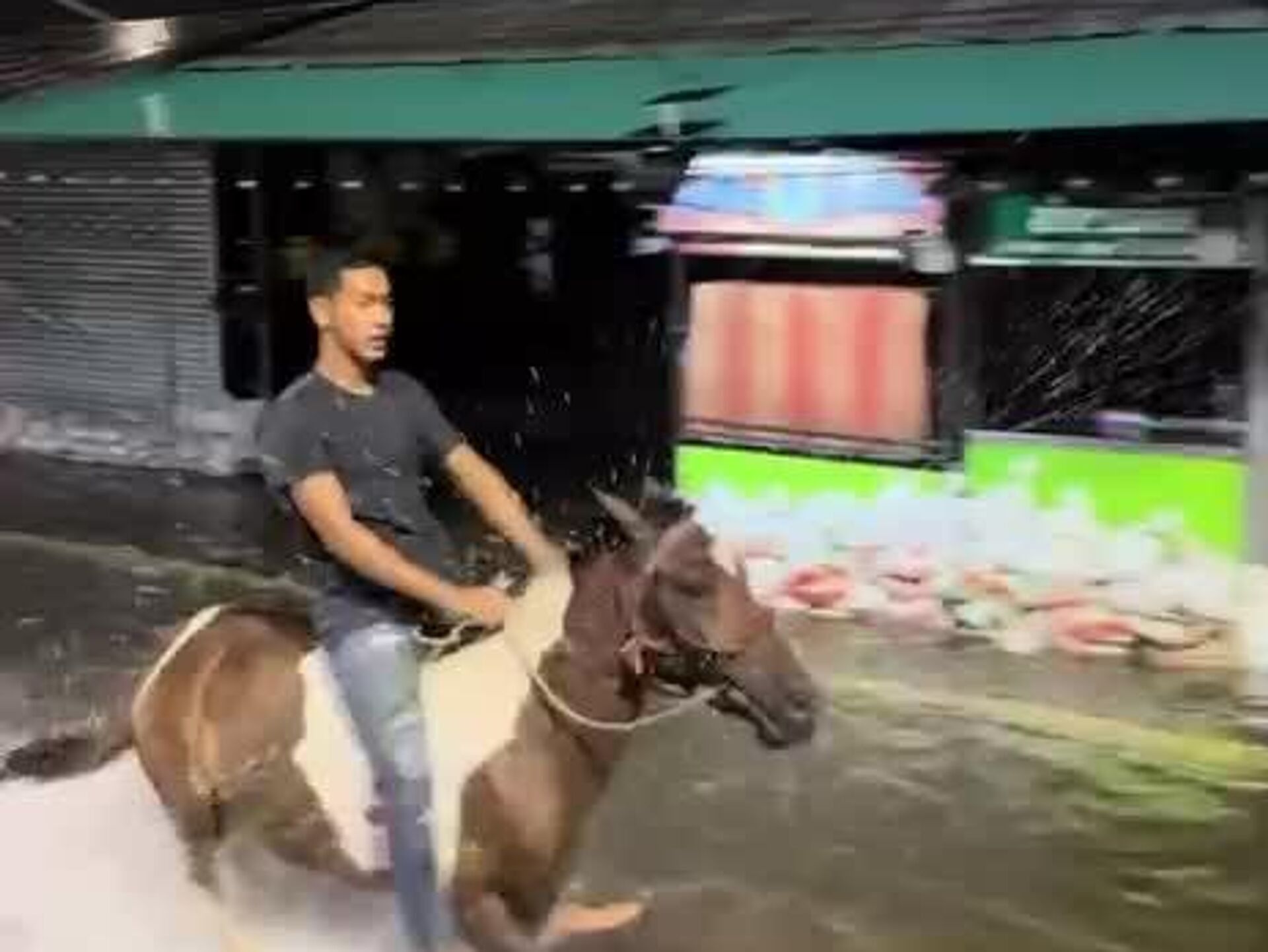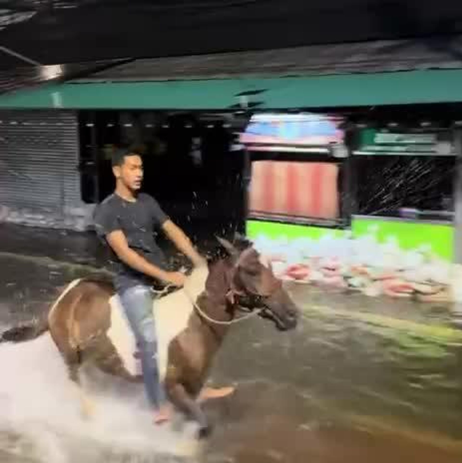 23:52 27.11.2025 (بروز رسانی شده: 00:00 28.11.2025) ساکنان پاتانی، شهری در جنوب تایلند، تصمیم گرفتهاند برای عبور و مرور در خیابانهای سیلزده از اسب استفاده کنند