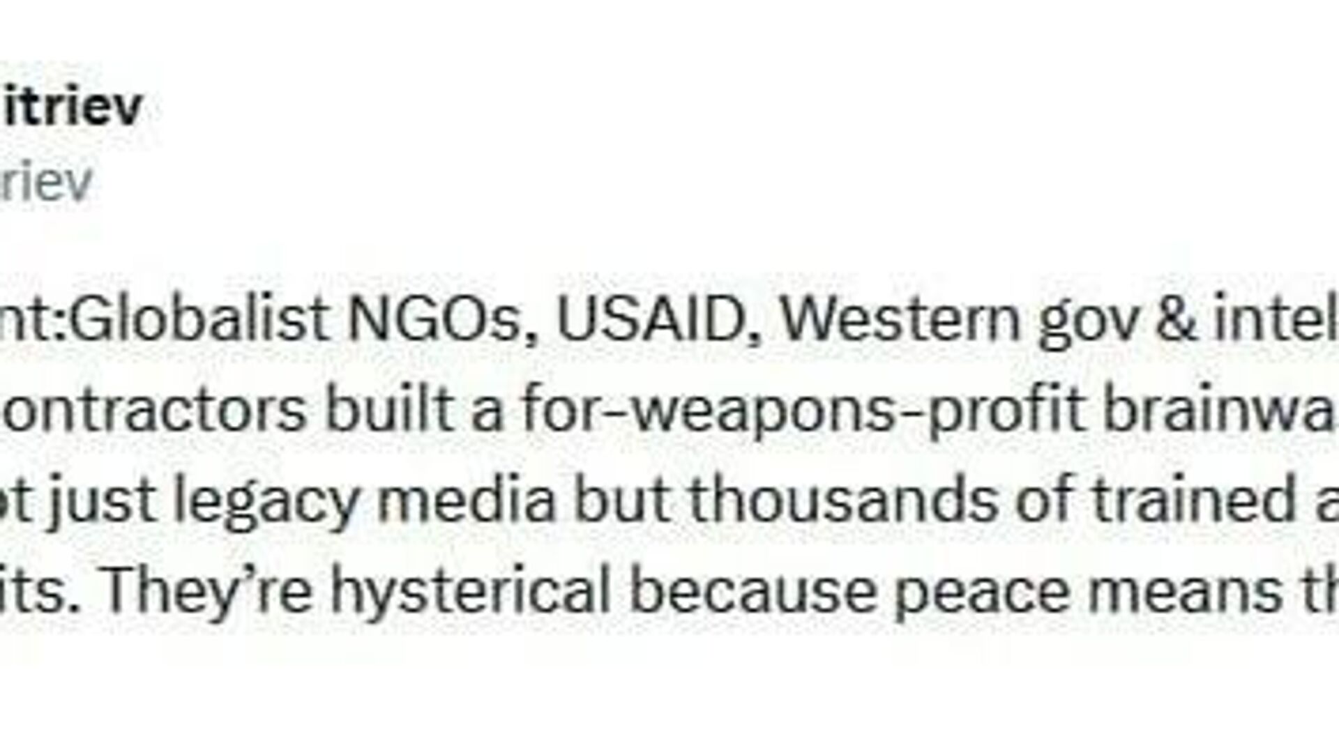 کیریل دمیتریف رئیس صندوق سرمایه گذاری مستقیم روسیه گفت که سازمانهای غیردولتی جهانی، آژانس توسعه بینالمللی آمریکا، شبکههای اطلاعاتی و پیمانکاران دفاعی یک ماشین روایت جنگ مبتنی بر سود ساختهاند