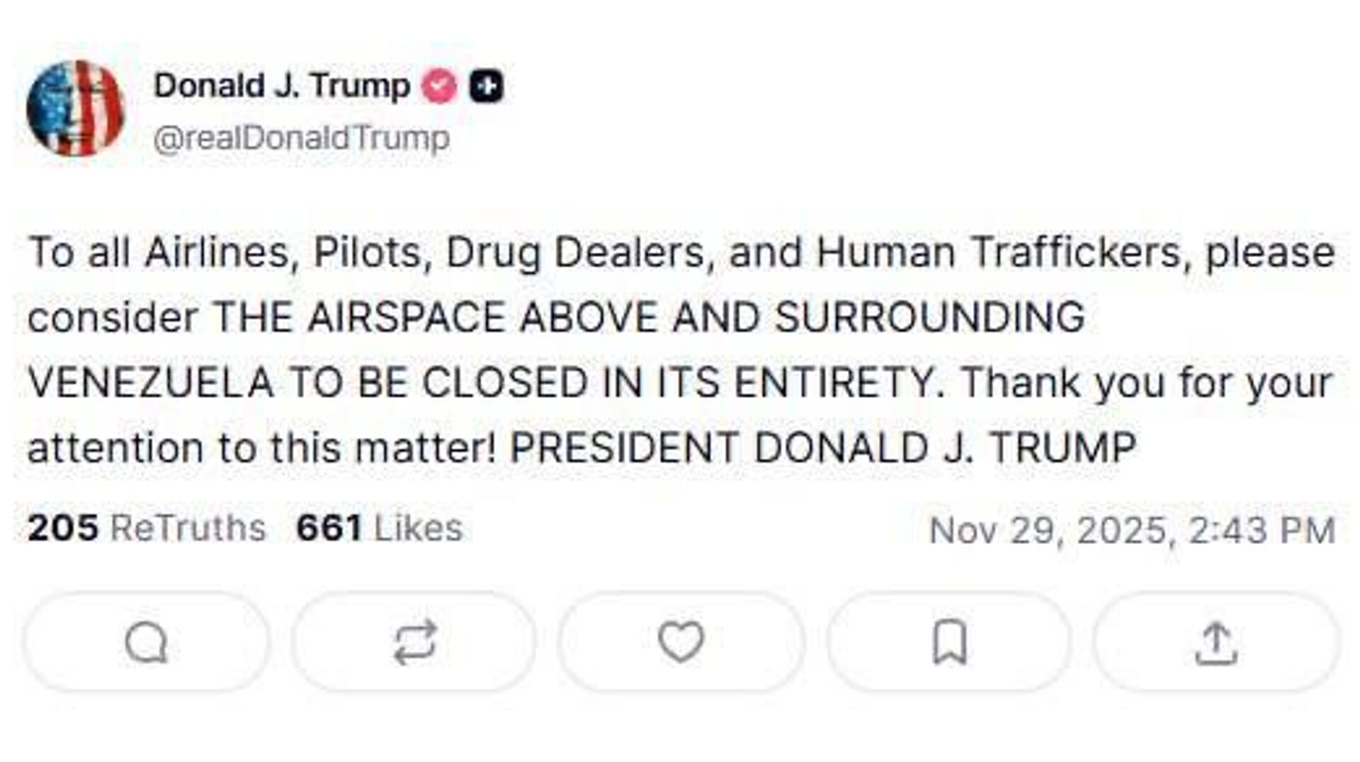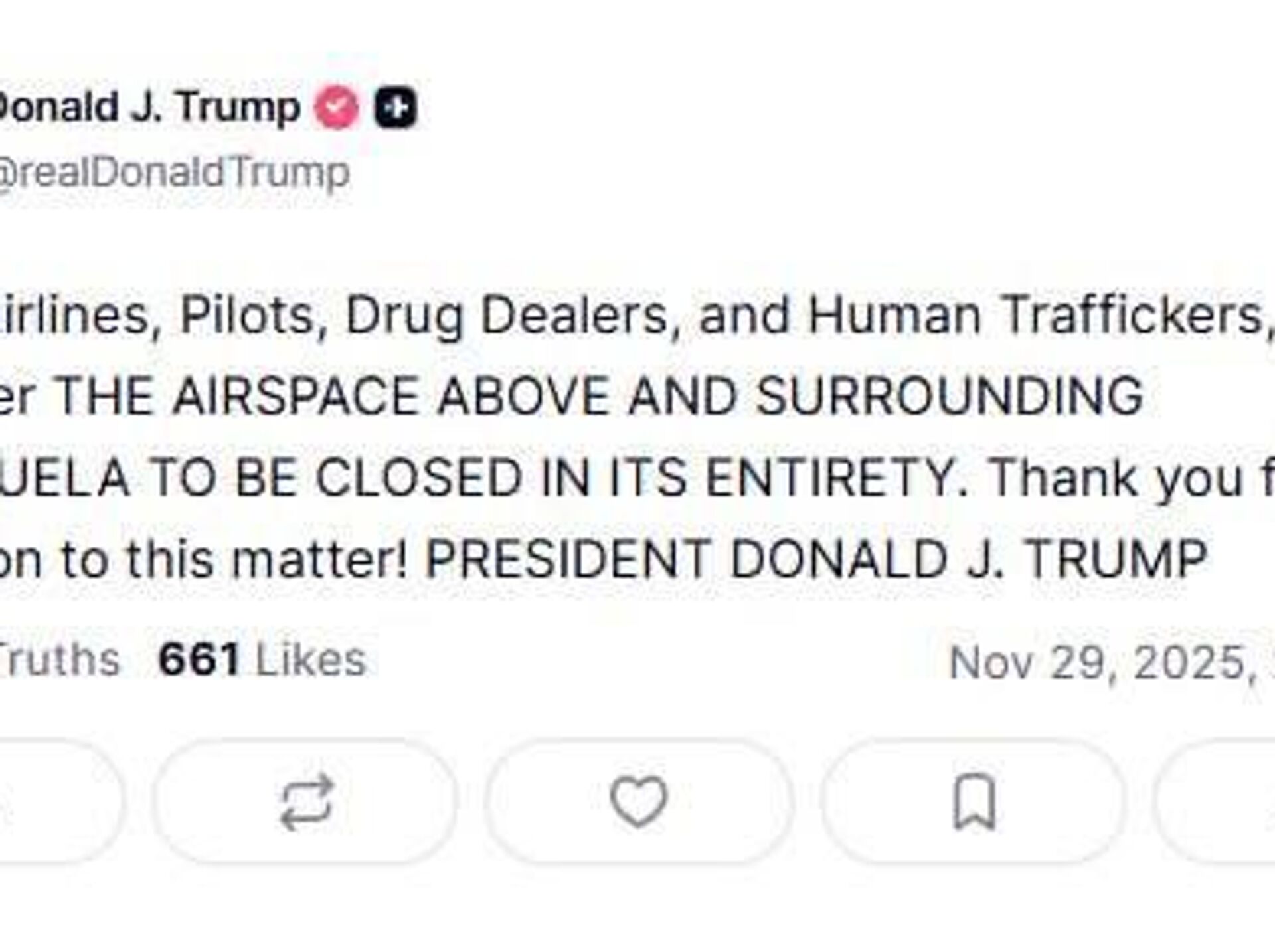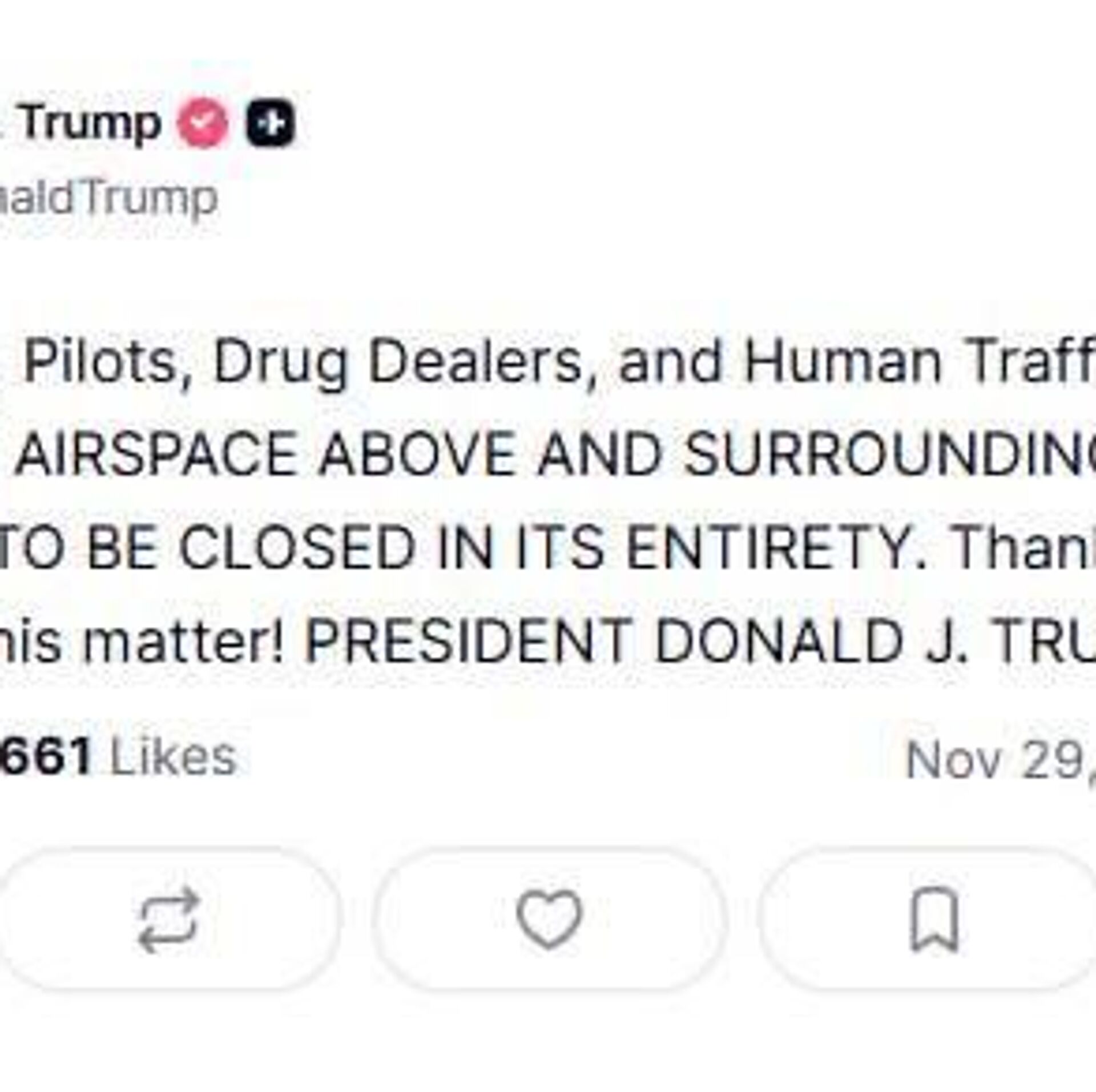 وی افزود: «به همه خطوط هوایی، خلبانان، قاچاقچیان مواد مخدر و قاچاقچیان انسان: لطفاً حریم هوایی ونزوئلا و اطراف آن را کاملاً بسته در نظر بگیرید.»